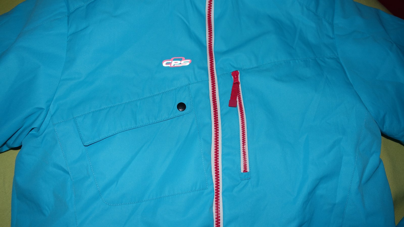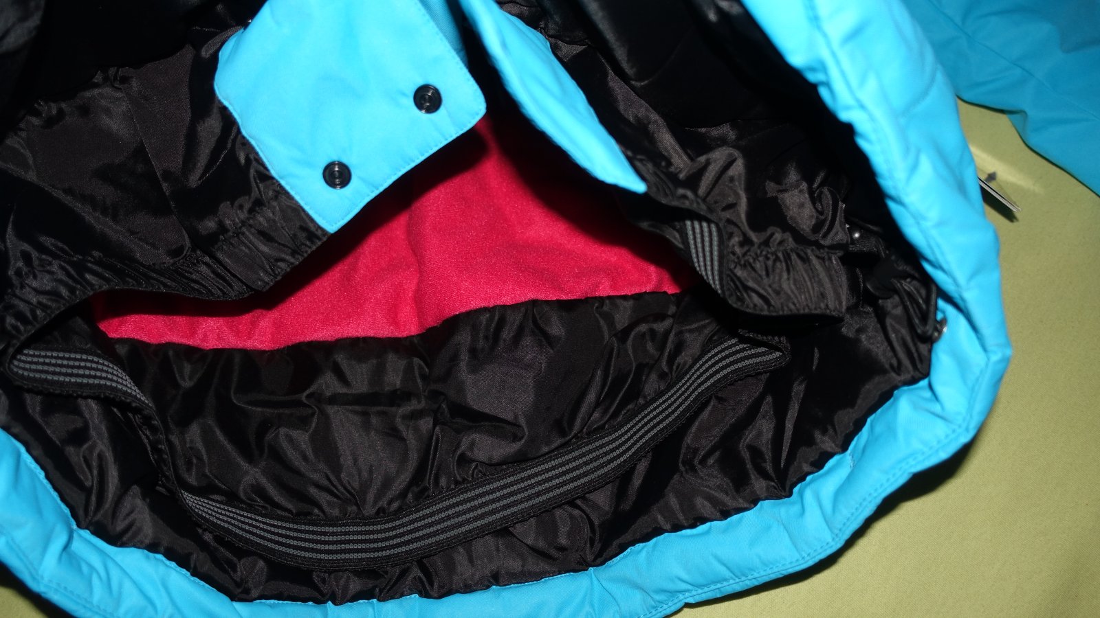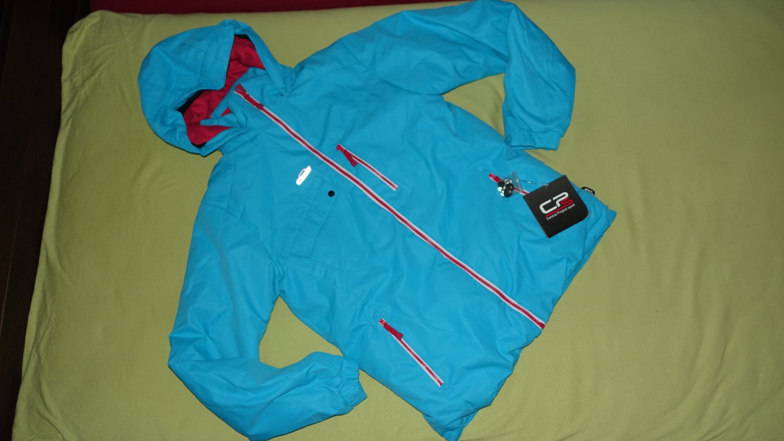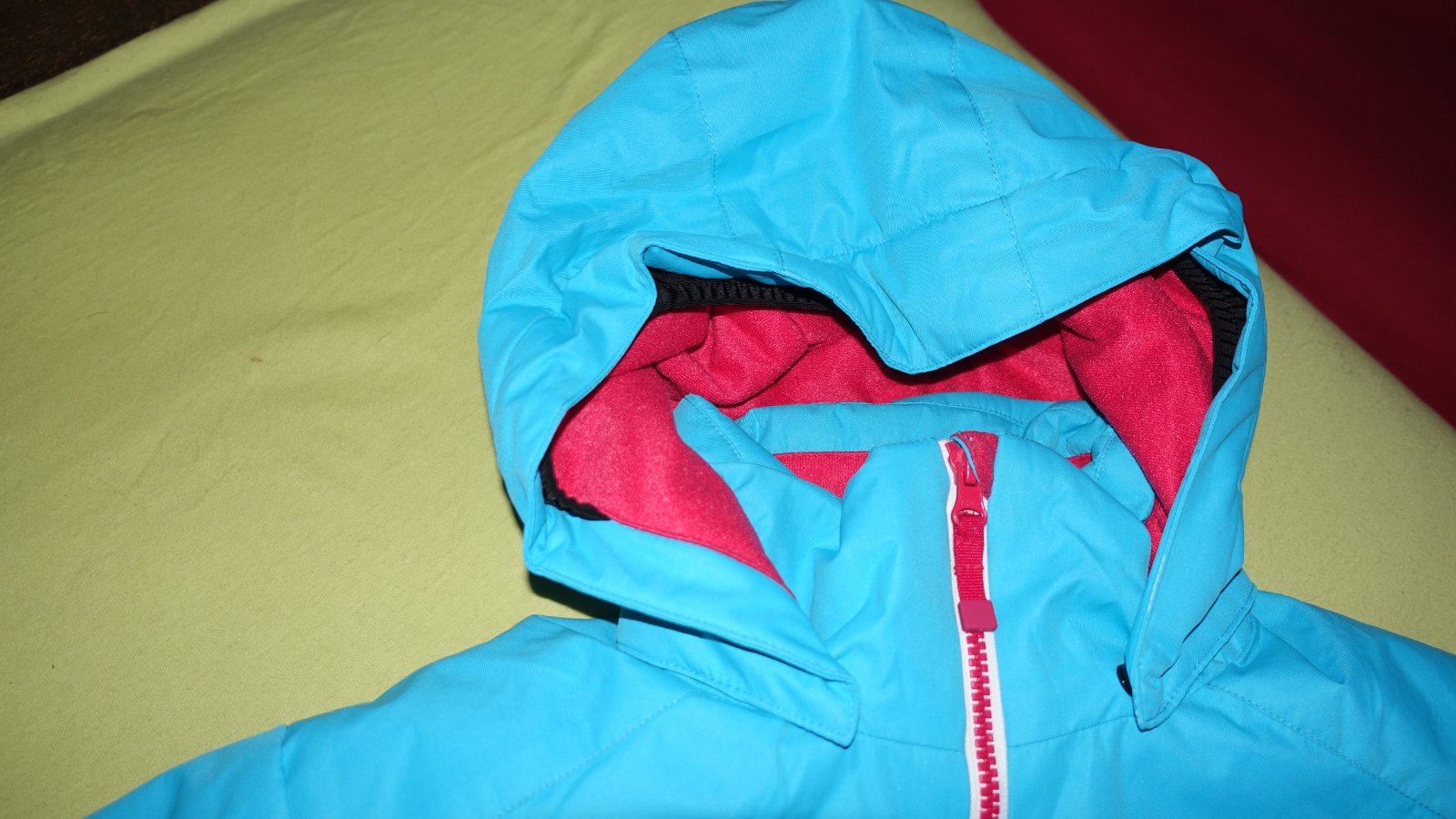 Krasna supravana na lyzovanie- nova, s visackami. Kapucna sa da odopnut. Traky na oteplovackach su odnimatelne a posuvne.