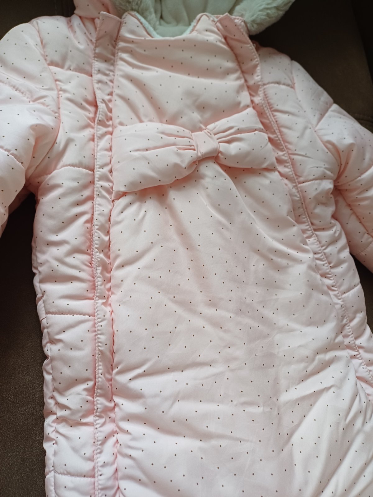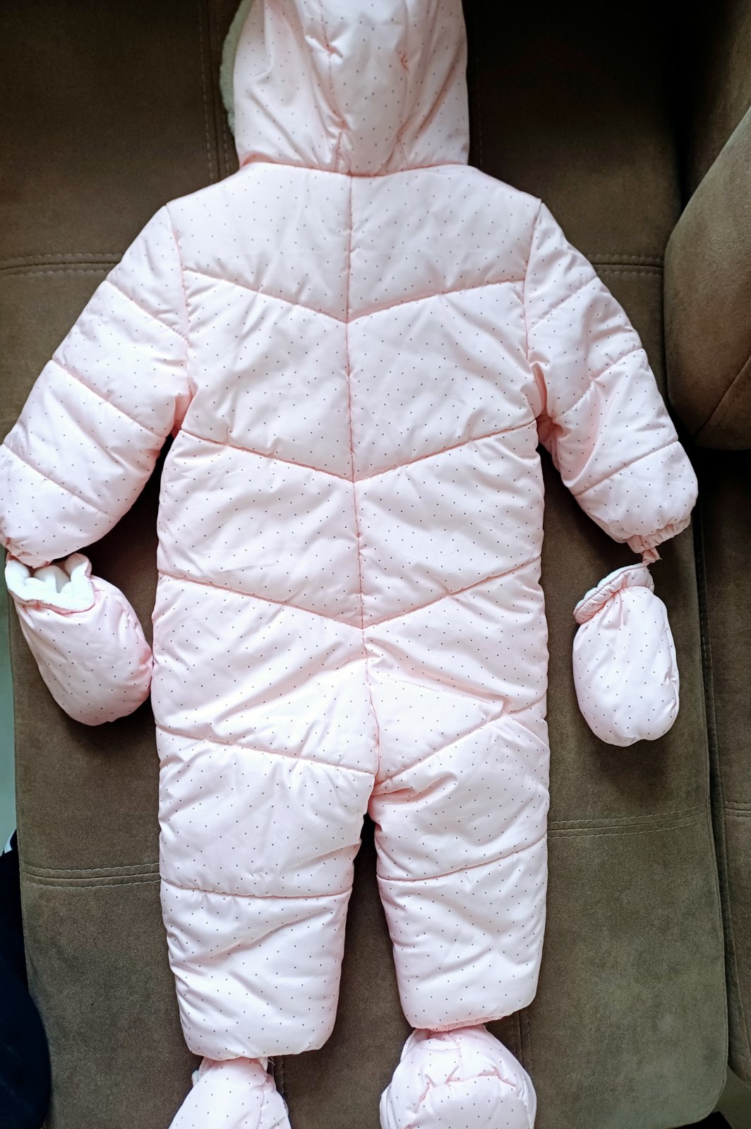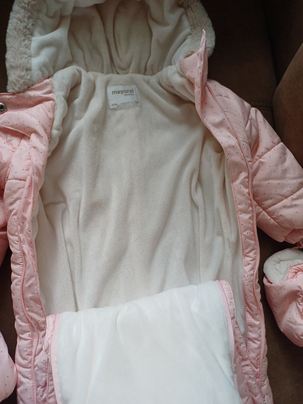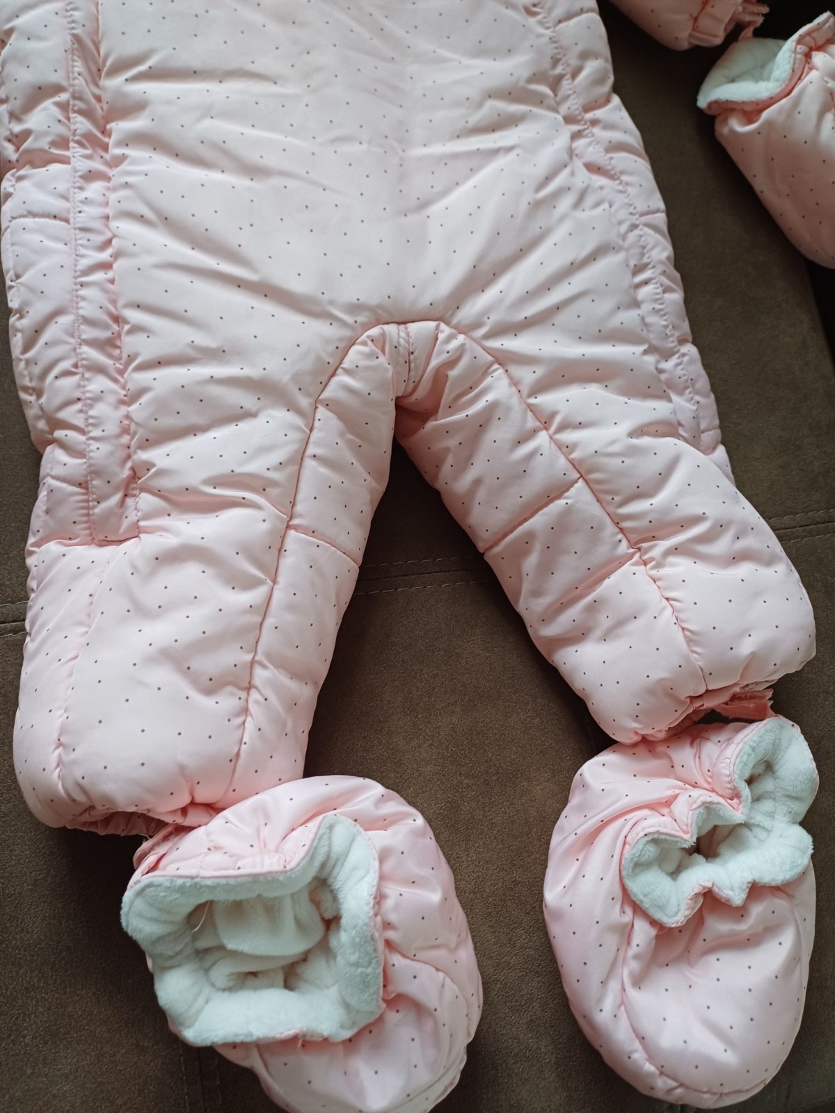 Super prepracovany teplucky overal podsity prijemnou kozusinkou, malo pouzivany. Odopinatelne rukavicky aj navleky na nohy. Uzsi strih.