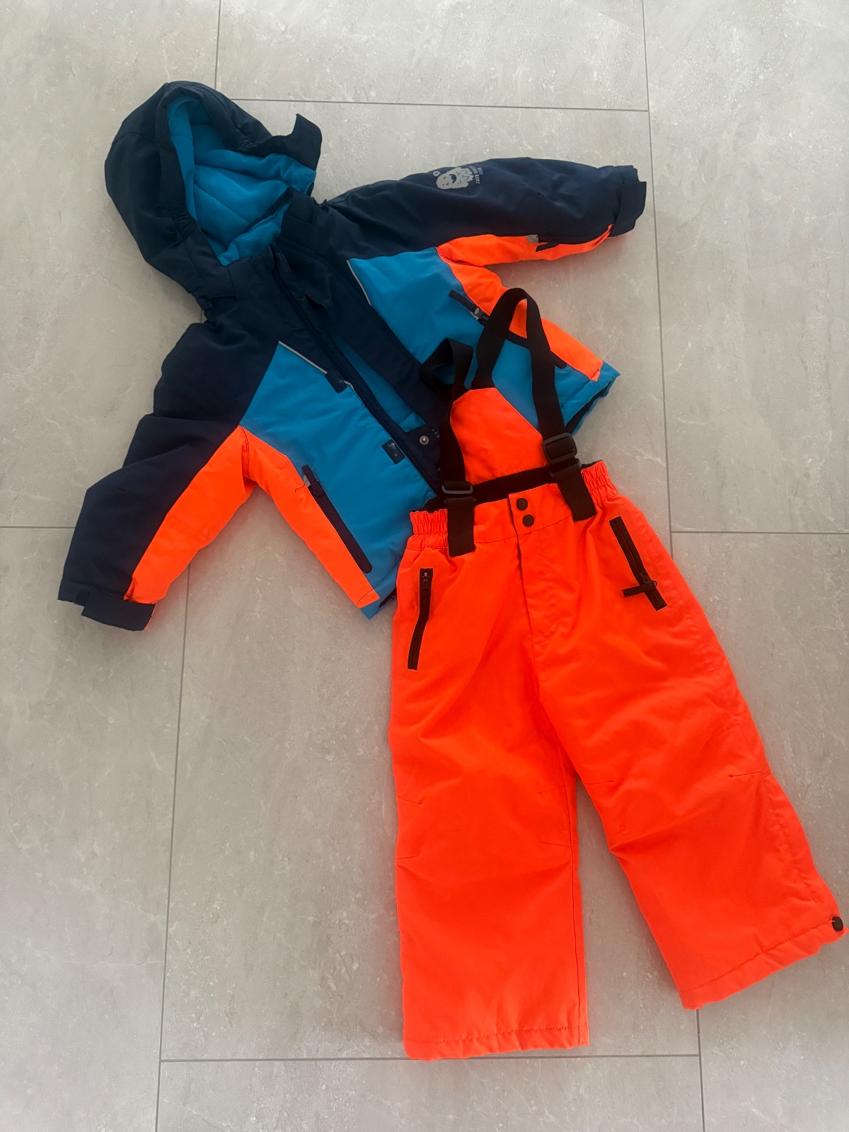 Pekná detská lyžiarsla zimná súprava. Bunda je cierna s neon oranzovou kapucnou. Oteplovacky su neon oranzove. Kapucna je odnimatelna. Tech. Parametre- 10 K. Na oteplovackach su flaky, spodky maju ...