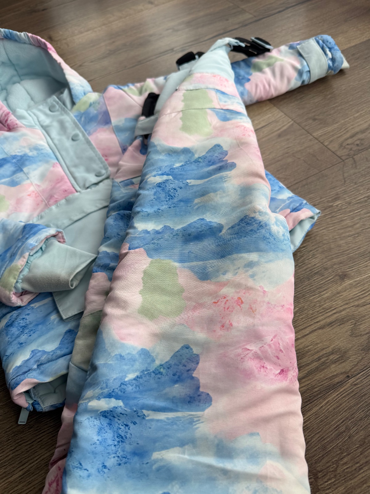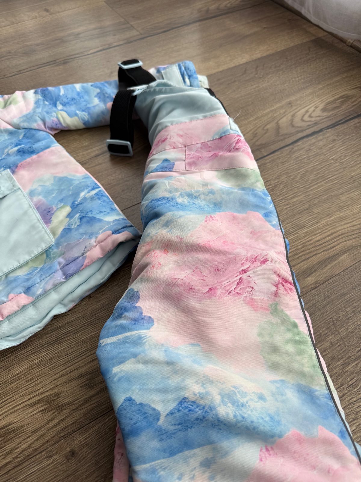 Na nohaviciach z korčúľ narezané viď foto nie je to celé ešte preseknuté.Na bunde malé fliačky a malé zatrhnutie.viď. foto,farba bledšia ako na foto,nie tak výrazná