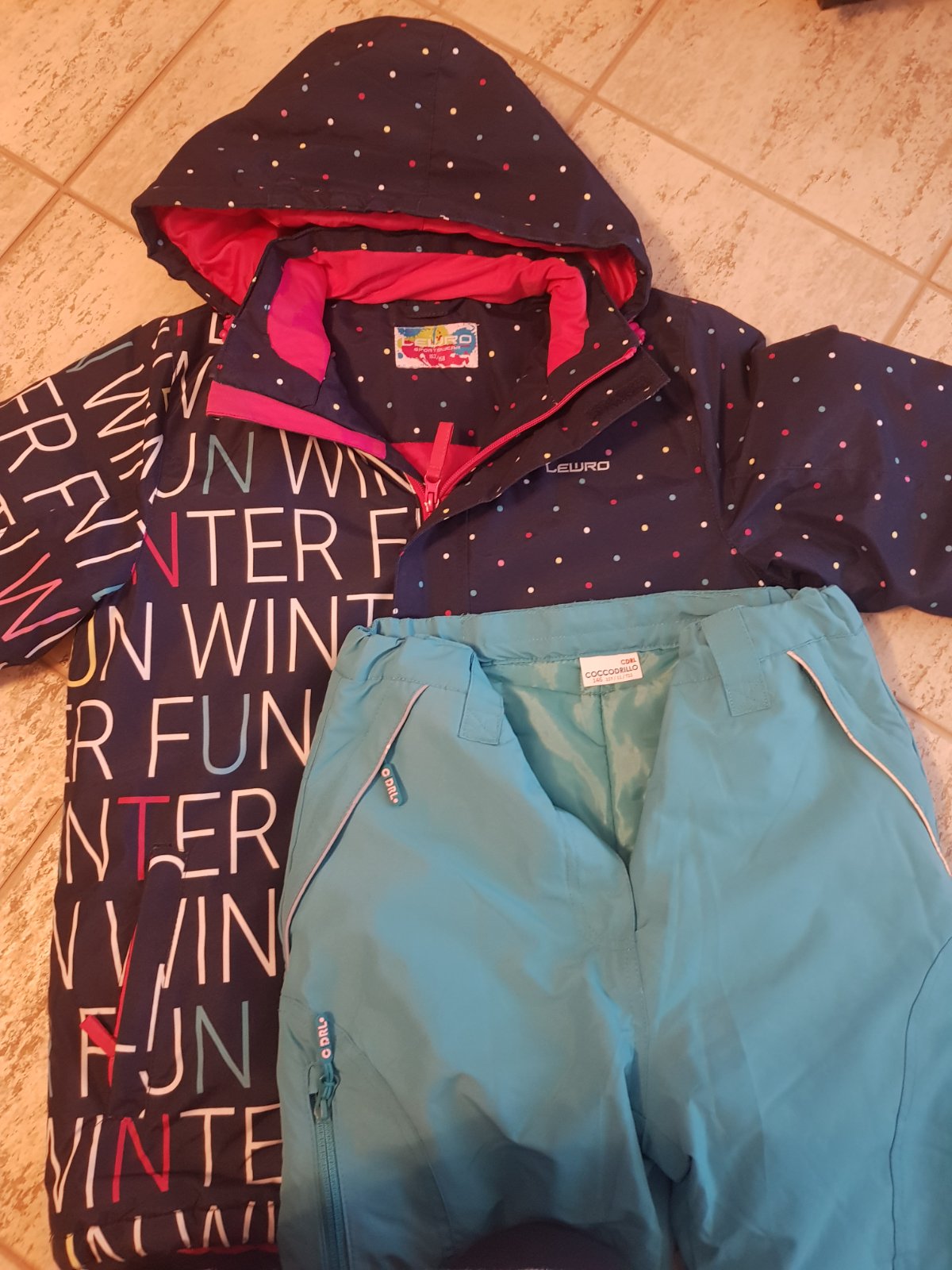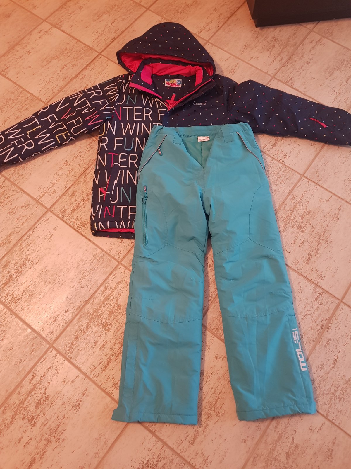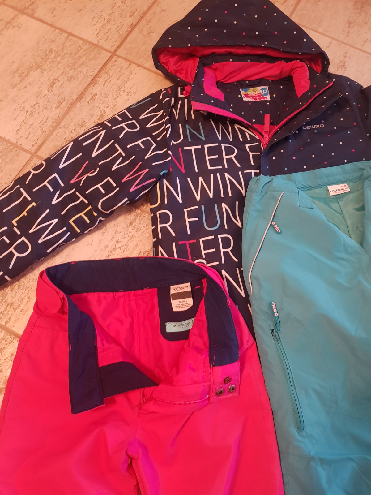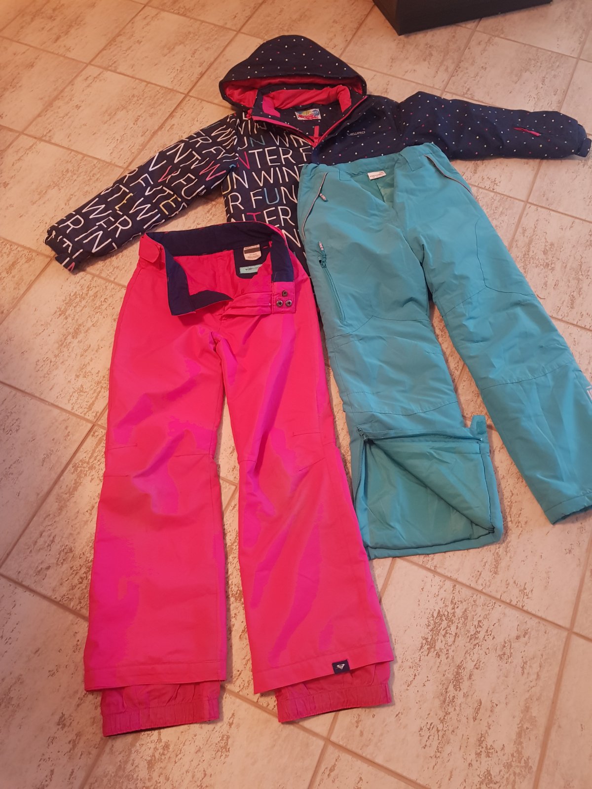 Predàm oblečenie vhodnè na lyžovanie,ako novè,použitè na dve lyžovačky,,bez akýchkoľvek znàmok poškodenia.Bunda Lewro,nohavice Cocodrilo,ružovè Roxy-tie majù jemne šuchnutè kolienka,len za 10euro,skôr na štìhlejšiu slečnu.Cena sùpravy 40euro.