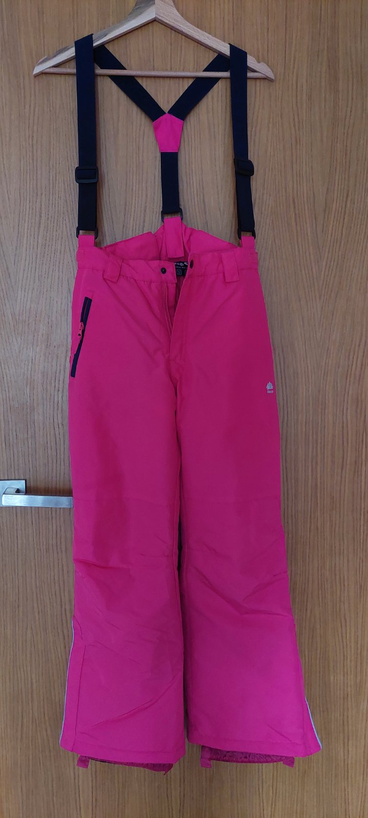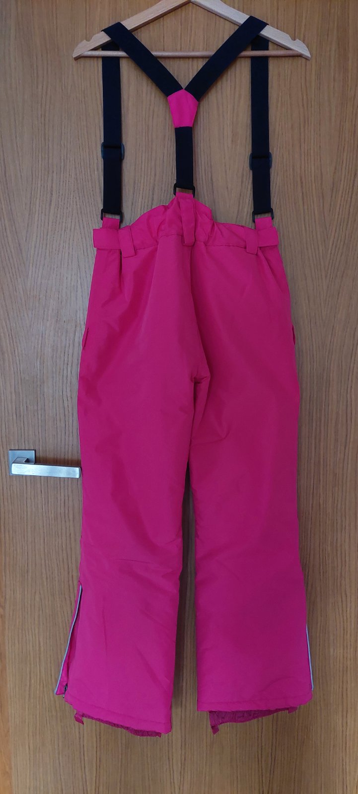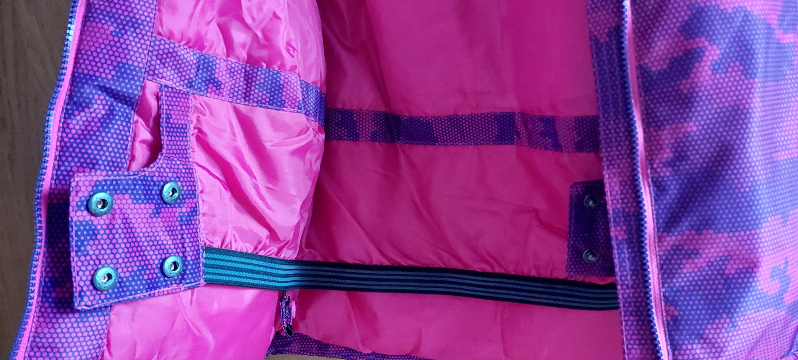 Lyžiarsky komplet pre kočku, bunda má vrecká na zips, snežný pás, manžety v rukávoch, gumky v rukávoch, na ktoré sa dajú pripnúť rukavice, vrecko na skipass, oteplovačky majú odopínateľné traky. Komplet použila dcéra na dvoch lyzovačkách, je bez chyby, takmer ako nový.