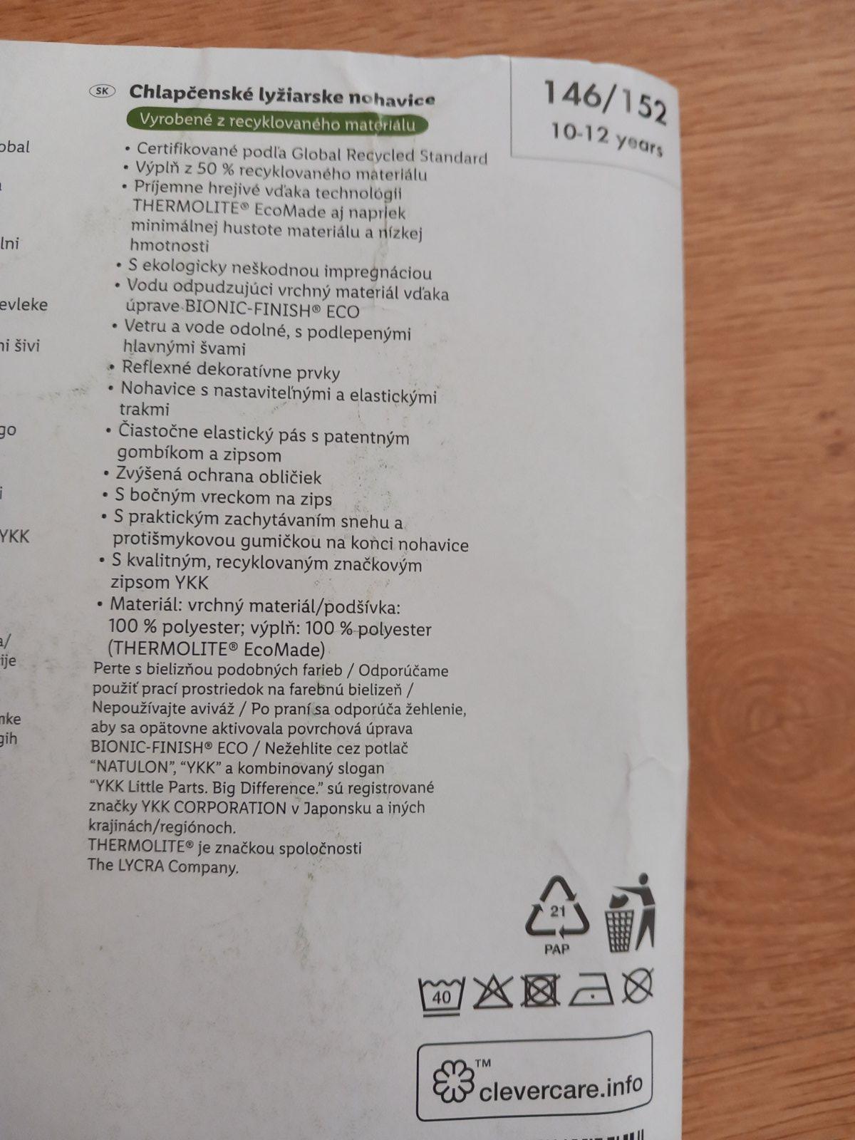 Nohavice majú na boku zipsovacie vrecko. Nohavice sú skôr tyrkysové. K nohaviciam sa farebne aj veľkosťou hodí lyžiarska vetrovka, ktorú predávam za 25 eur. Taktiež predávam funkčné termoprádlo, všetko veľkosť 152.