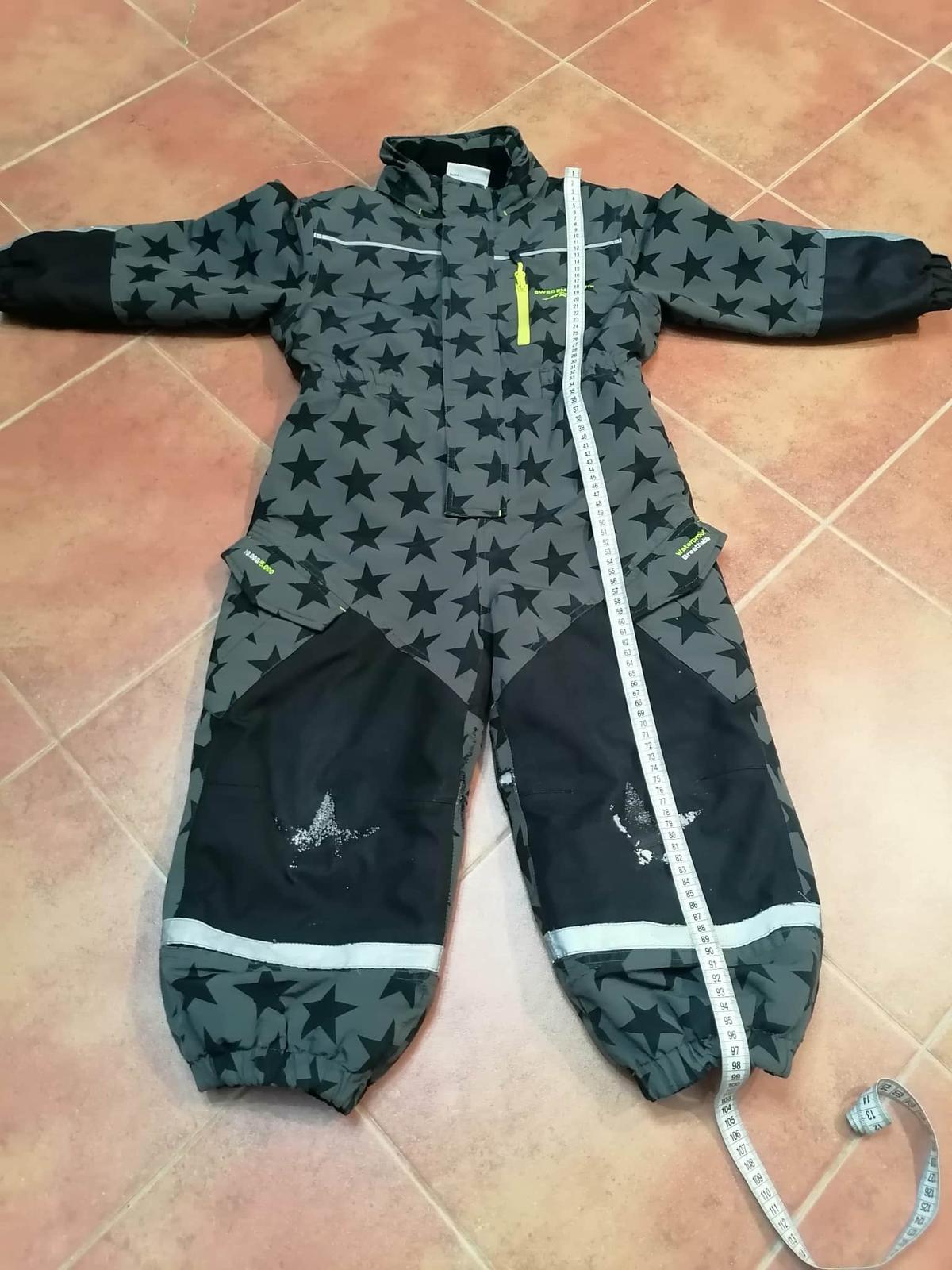 Predám zimnú kombinézu - na donosenie (ako náhradná kombinéza, či na dvor alebo ku starkým). Známky opotrebenia - medzi nohami na oboch stranách zašívané (viď foto), na nohách reflexné hviezdy spraté a čo sú reflexné prvky na nohách, čiastočne sa párajú (na oboch nohách, tiež viď foto). Bola k tomu aj kapucňa, neviem žial nájsť. Všetky nedostatky zohľadnené v cene. Cena bez poštovného