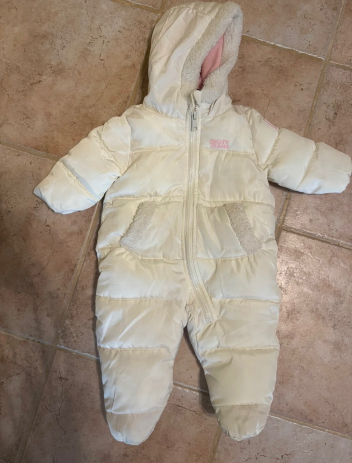 Predám nádherný teplý zimný overál DKNY, používaný jednym dieťaťom, stav 100%. Veľkosť 3-6mesiacov. PC70€.