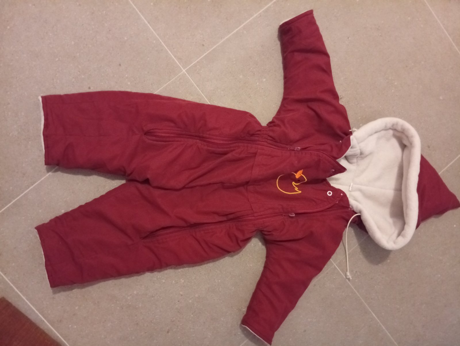 Overal bol prerobený, aby mal voľný otvorený spodok, písaná veľkosť 9-12 m, ale malinká ho nosila, keď mala rok aj 3 m, takže veľkostne skôr 12-15 :) nemá poškodenia, teplucky