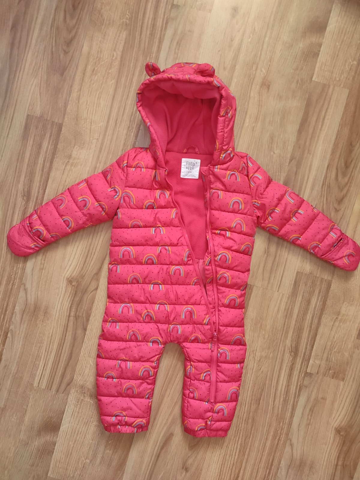Krásny overal F&F malinovej farby, veľkosť písaná 18-24m ale podľa mňa lepšie sadne na v.86, overal má pretáčacie rukávy takže ruky je možné schovať, bol nosený na striedačku s druhým