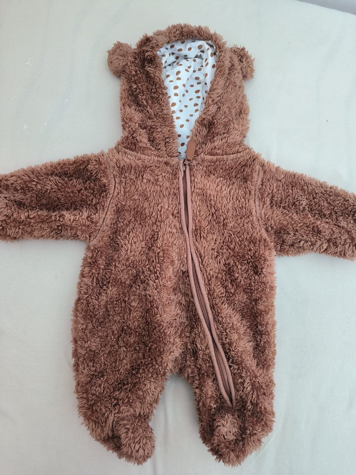 Zateplený zimný overal bez poškodenia,píšu 1,2 mesiace ale určite je aj na väčšie dieťa.Môj ho nosil do 8mesiaca.Otvorené konce na nohy daju sa zavinúť aj rukávy.