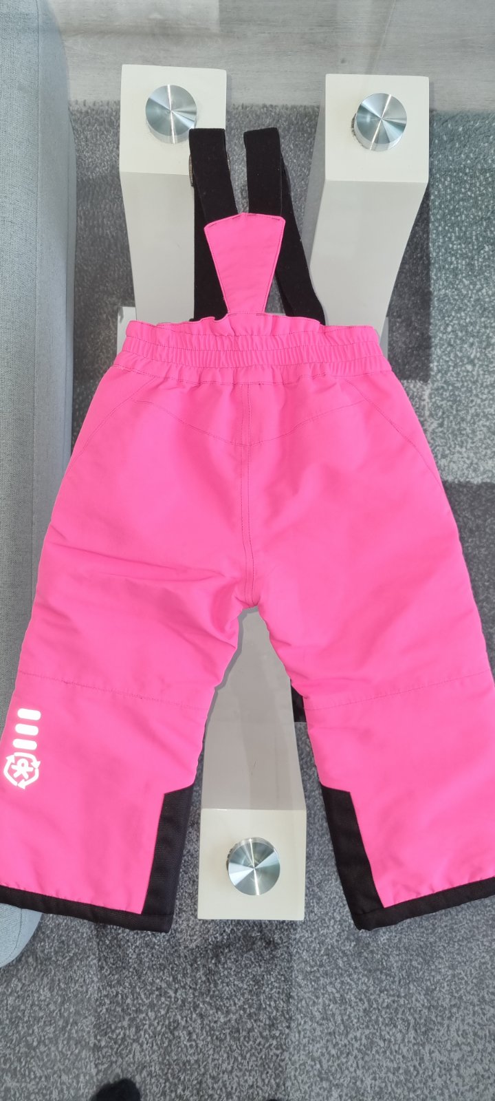Predám oteplovačky krásnej ružovej farby s reflexných prvkami a nastaviteľnými trakami. Zapínaju sa na 2 rady gombíkov a zips. Traky sú elastické a nastaviteľné. Spodná časť nôh má vo vnútri naťahovaciu vložku viď na foto. Použité boli 2x keďže sme potrebovali väčšiu veľkosť.