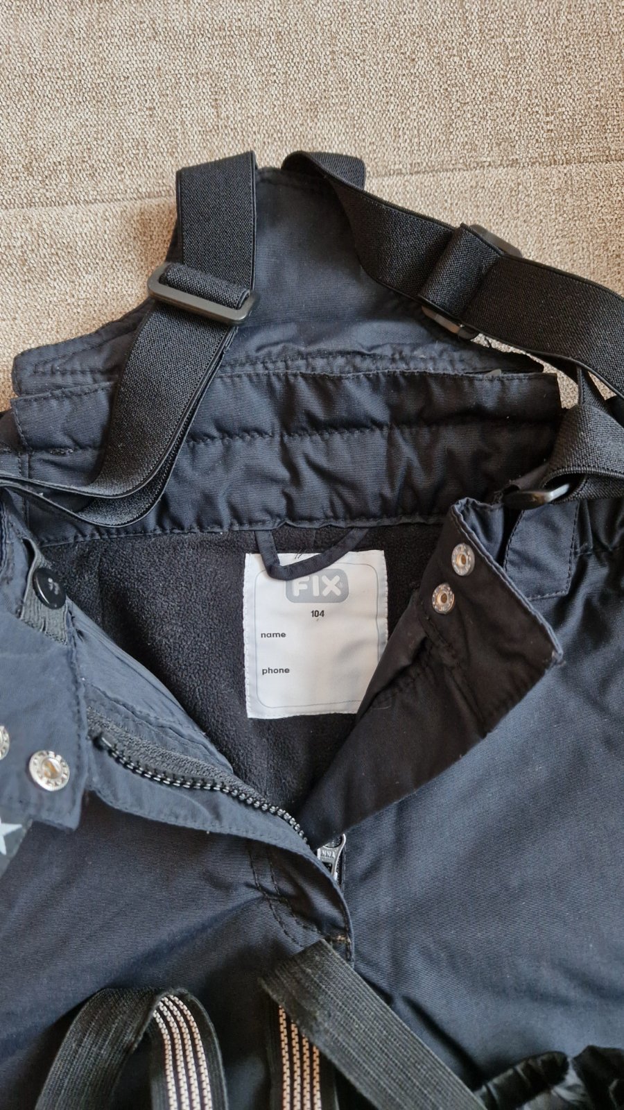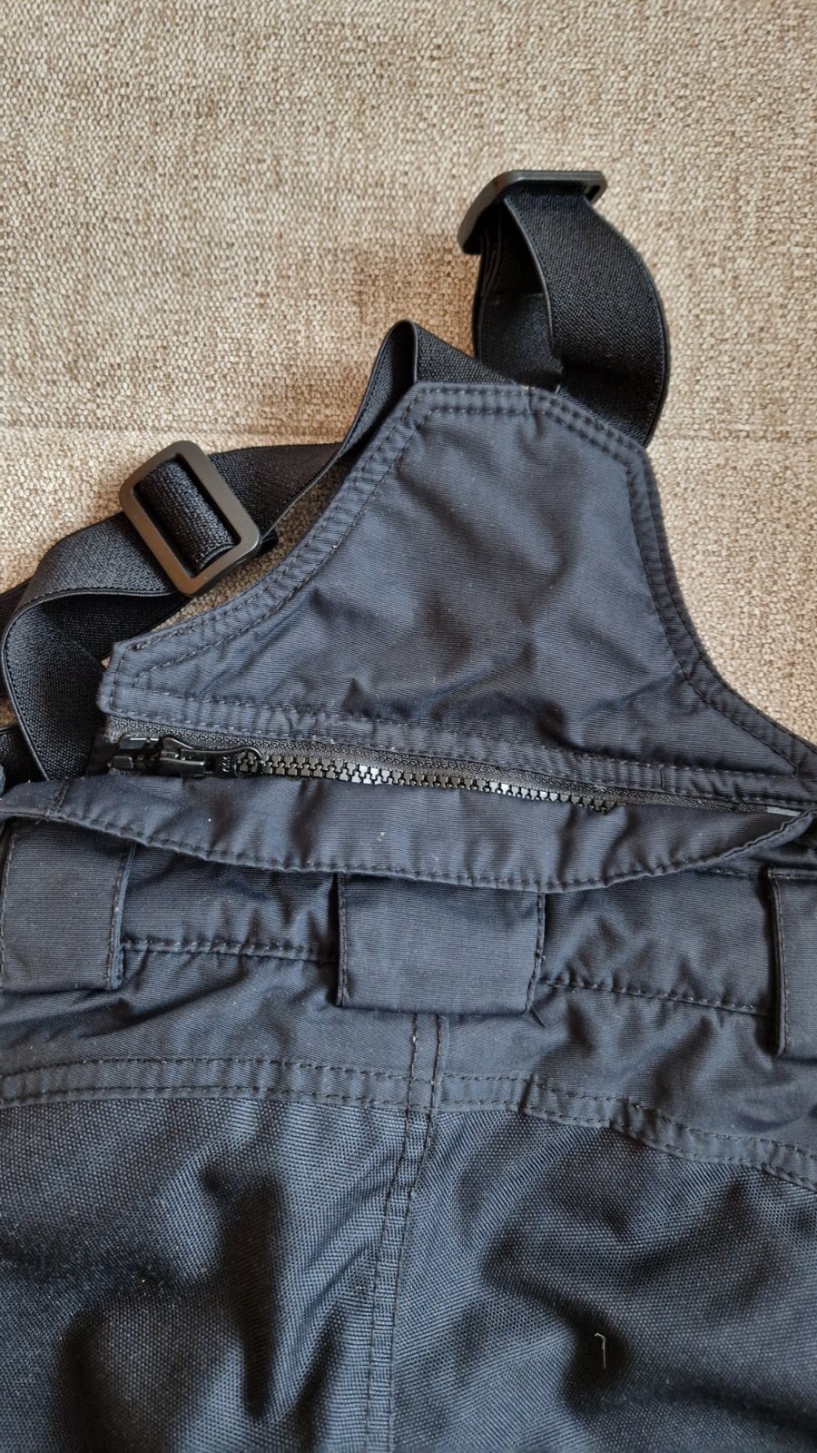 Super stav viď foto, žiadne poškodenia, odpínatľelné traky, nastaviteľný pás, zateplené nepremokavé a nezničiteľné, dole gumička aj suchý zips pre nastavenie na čižmy / lyžiarky.