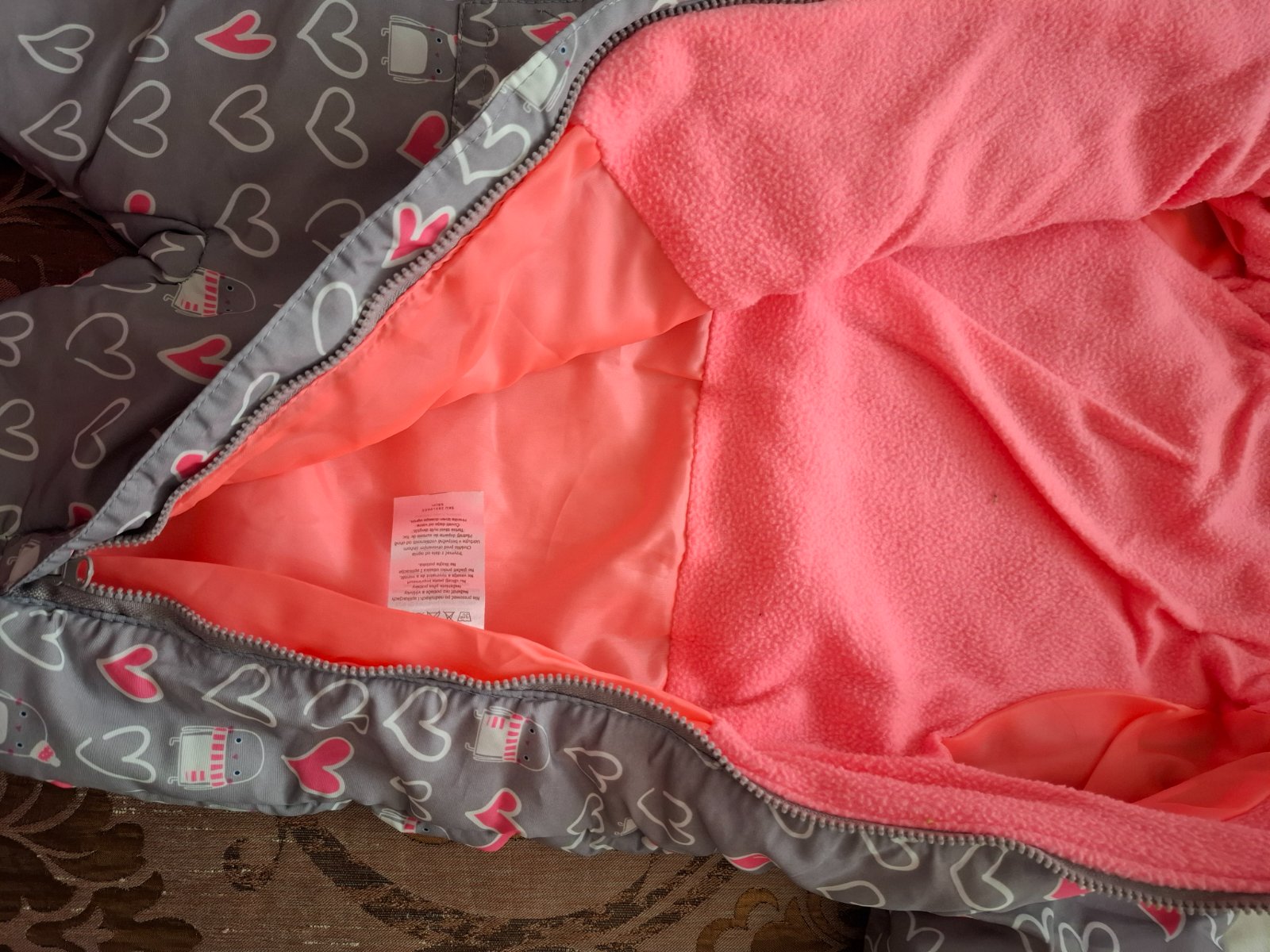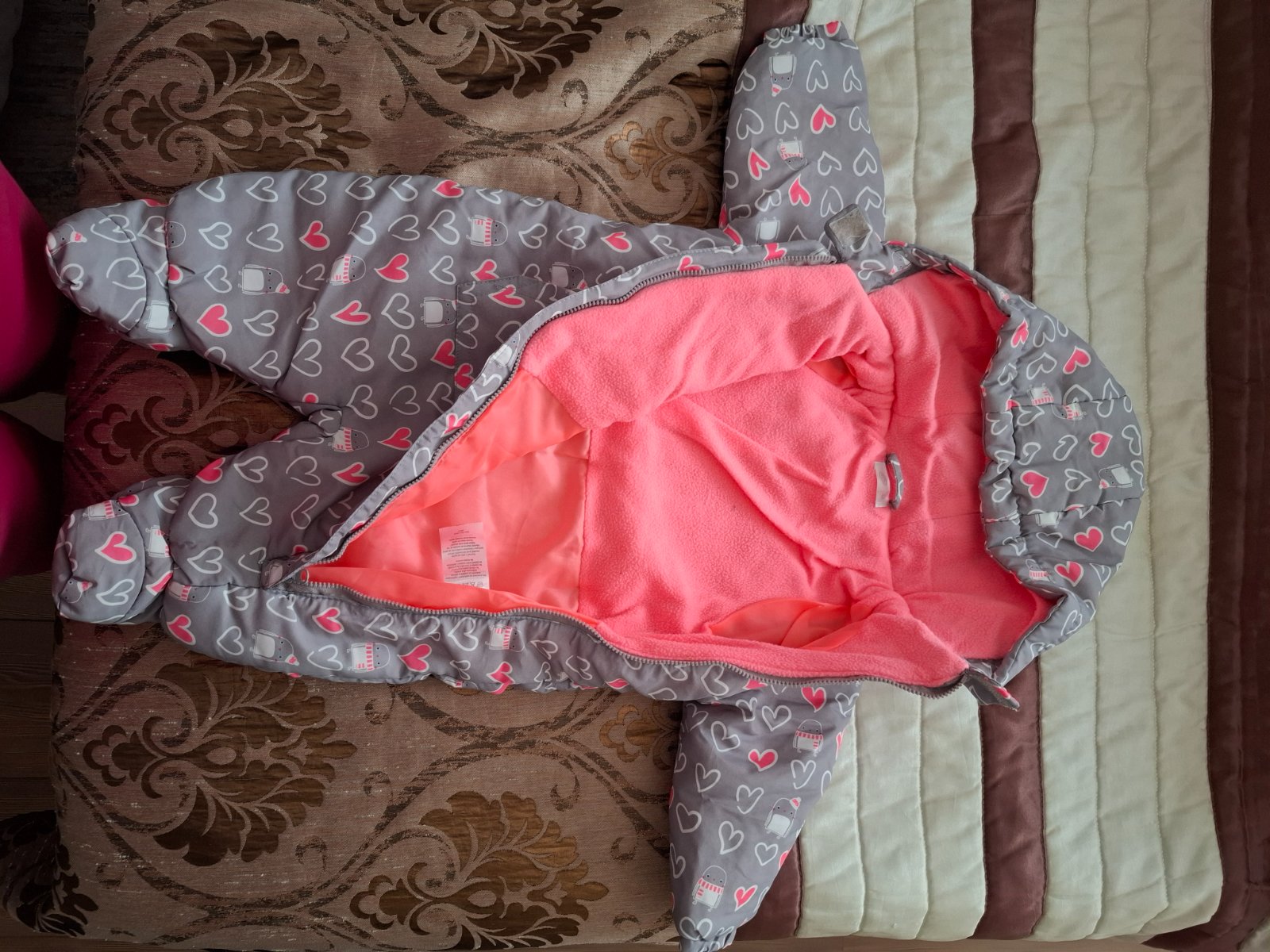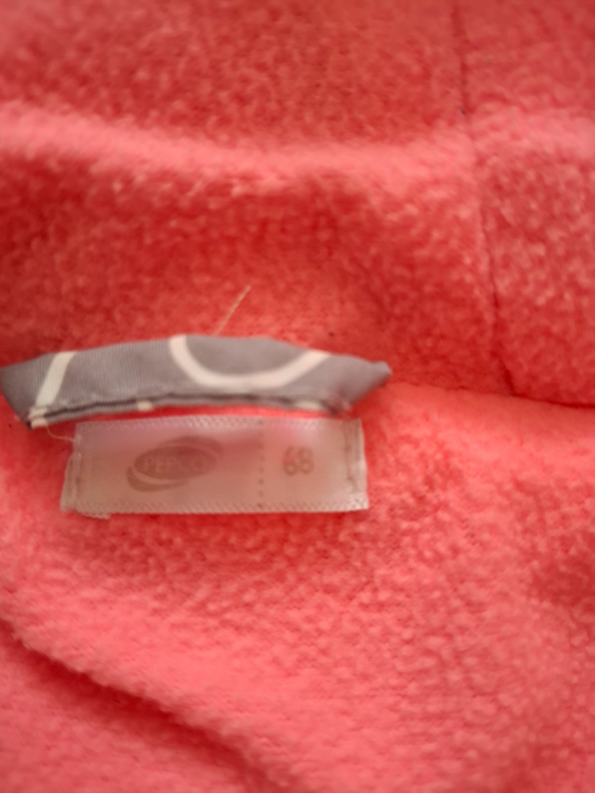 lososová farba, tenký, zapínanie na zips a cvoky, vnútro bavlna, dobrý stav materiál: polyester veľkosť: 6 mesiacov rozmery: dĺžka od pleca dole po nožičku 55 cm, od pleca po rozkrok 39 cm, od rozk...
