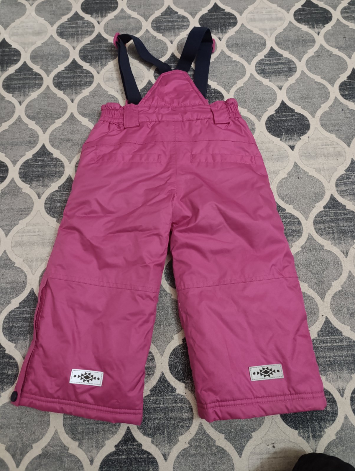 Oteplováčky s malou dierkou a zatrhnutím zvnútra od snehule, dá sa zašiť. Iné poškodenia nemajú. Dĺžka regulovateľná, vačky na zips. Dĺžka 78cm, šírka 27cm pás s gumou. Cena plus pošta.