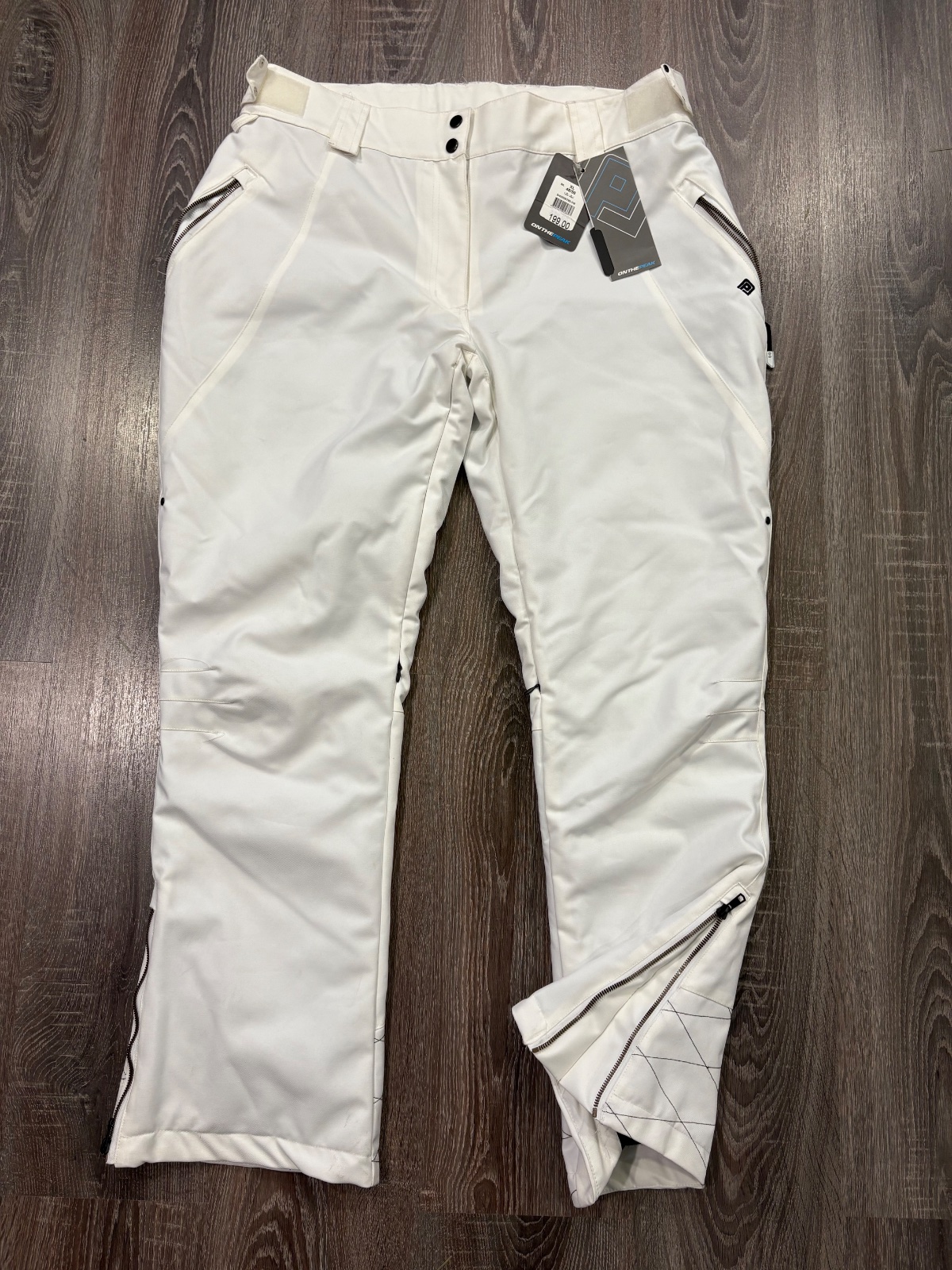 79.On the Peak premakane nove damske oteplovaky , komplet s etiketou,velkost XL.Kopec premakanych detailov,pas si viete upravit,po boku vrecka,tiez aj vzadu na zadku.Dlzka je 109cm,sirka v pase je 54x2cm a viete si ho stiahnut,predny sed je 29cm,zadny sed je 41cm,sirka stehna pod rozkrokom je 37x2cm,sirka dole je 26x2cm,no da sa rozsirit zipsom
