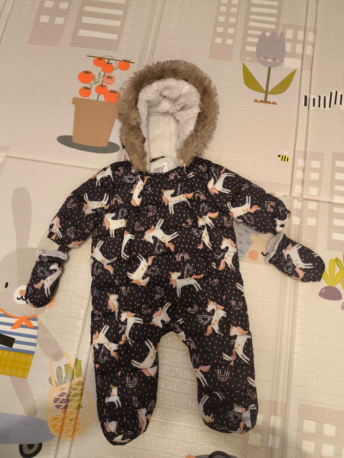 Zimný overal, s ťapkami, s rukavičkami, veľkosť do 3 mesiacov.