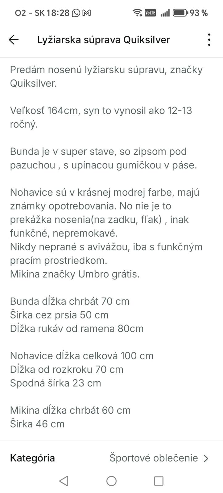 Predám krásny, lyžiarsky komplet pre chlapcov vo veľkosti 164/170 … nohavice sú zn. Husky a bunda zn. Quiksilver … všetko v super stave … rozmery: bunda - dĺžka 71cm, šírka 52,5 cm, dĺžka rukáva od...