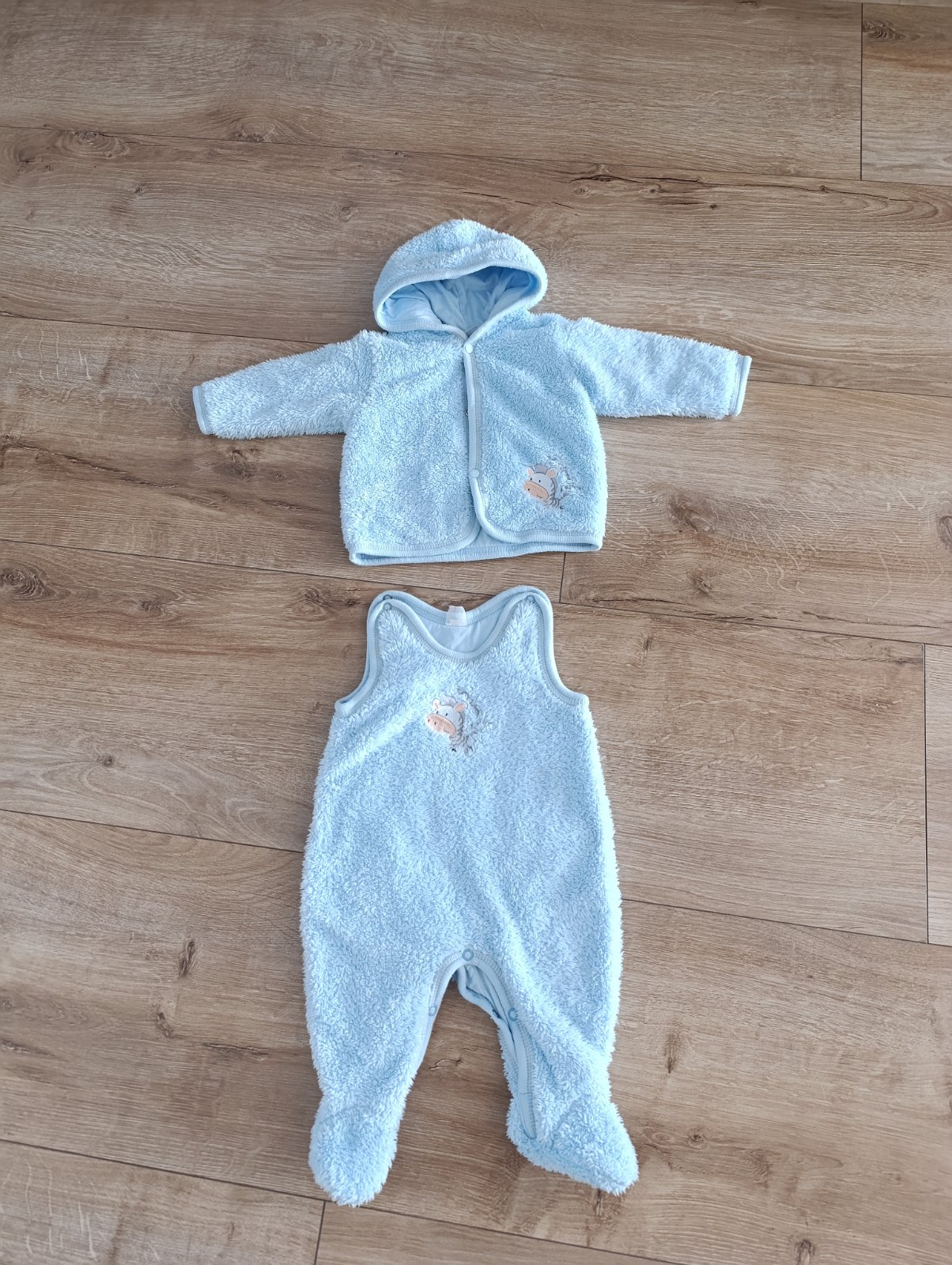 Plyšová kombinézka - dupačky + mikinka. Veľkosť odhadujem, štítok je už nečitateľný. Nosili sme do 3 mesiacov tuším. Na mikinke je stredný patent odtrhnutý, ostatné sú funkčné.