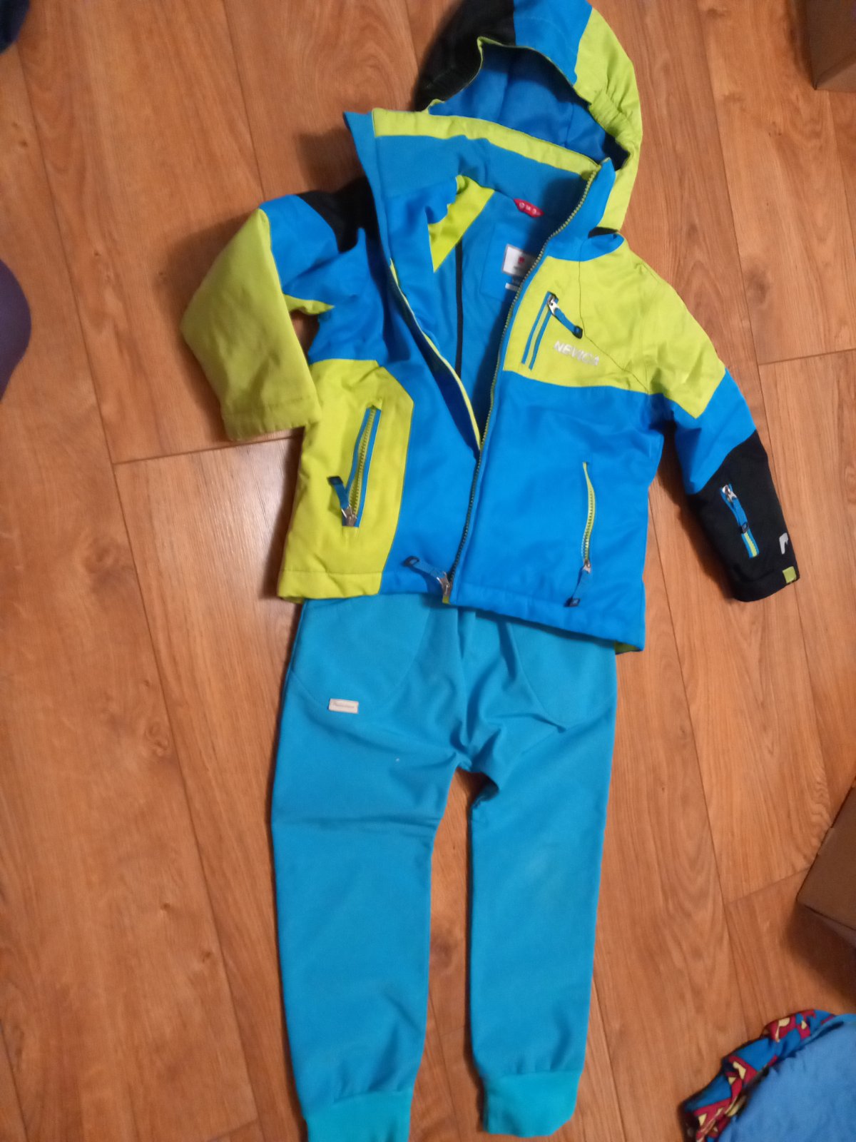 Dobrý nosený stav. Nosené aj na lyžovačku. Bunda veľ.122, nohavice 110/116, ale môj syn je nižší, jemu to takto pasovalo. Bunda má nejaké opotrebenia, viď foto. Odlepujúcsa trošku aj písmenká vpred...