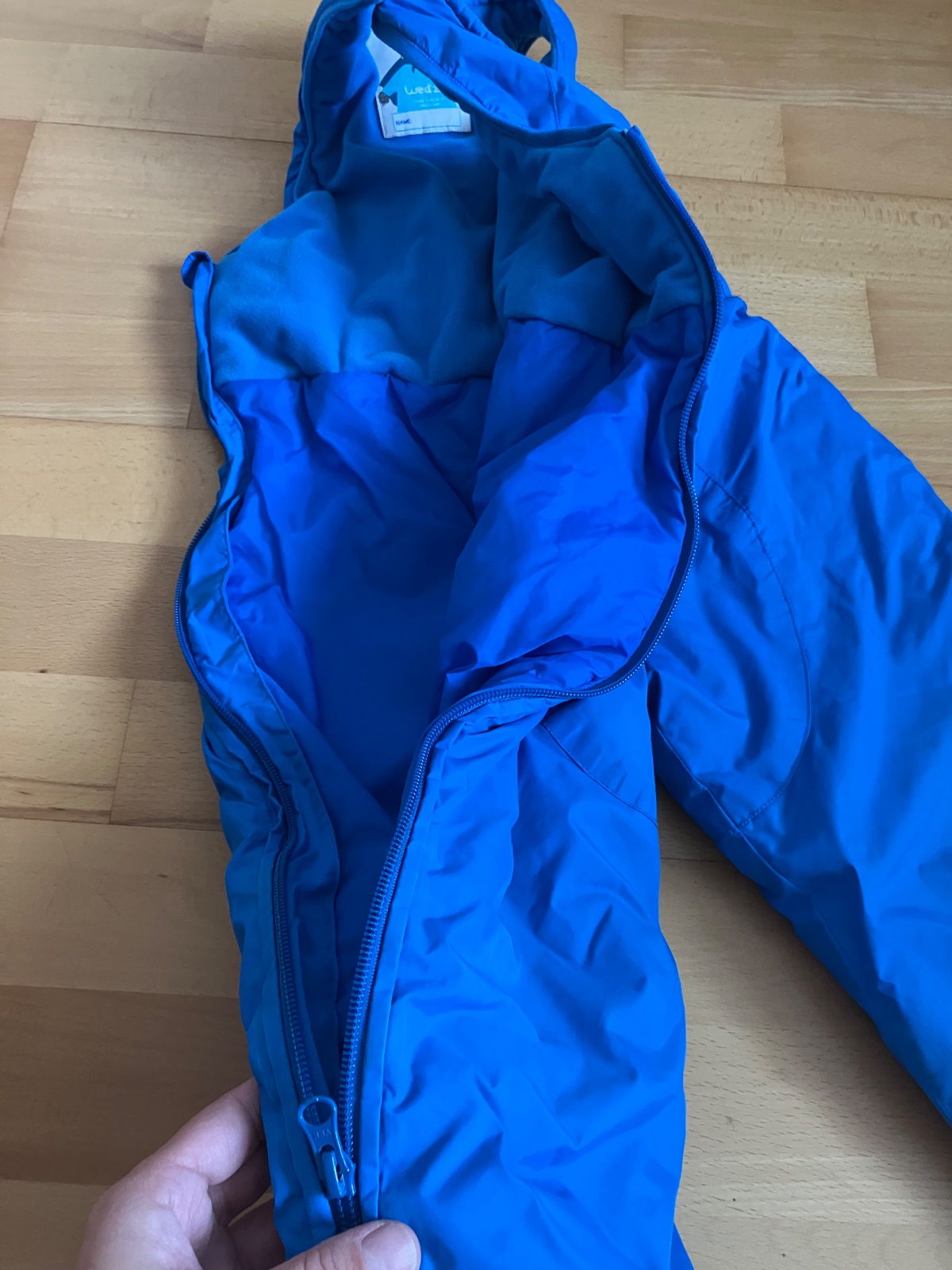 Pekné modré oteplováky. Kolená, zadok a gumičky nezodreté. Vidno použitie... vyšúchané nožičky z vnútornej strany. Použitie vidno aj na reflex.prvkov. Inak sa sánkovačku ešte poslúžia 😉
