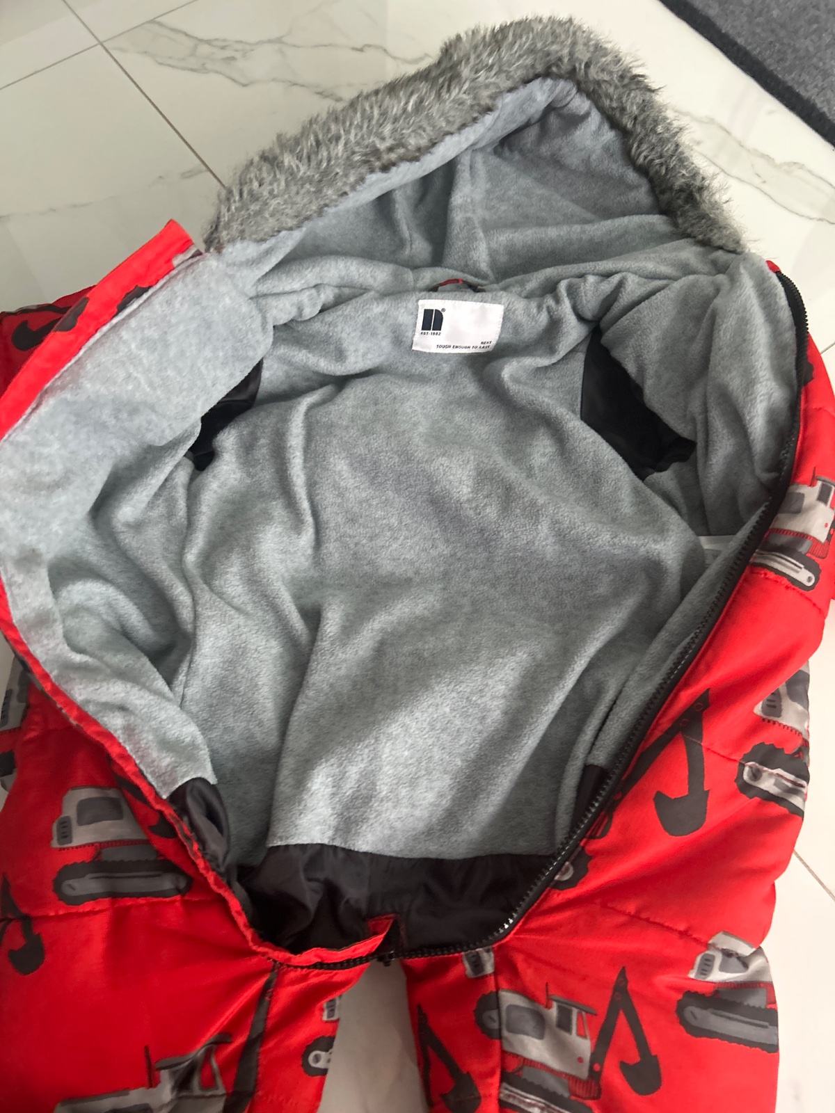 Dobry stav,vsetko je na foto,odfotila som male nedostatky,ktore vidno len ked ich hladate,na funkcnost nemaju vplyv.Je hruby,takze aj do mrazov.Sedi hlavne ako 98 ale ponosite aj ako 104. Syn ma te...