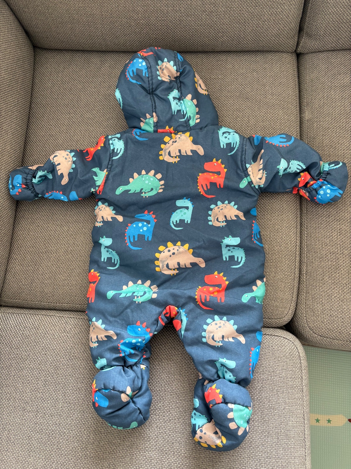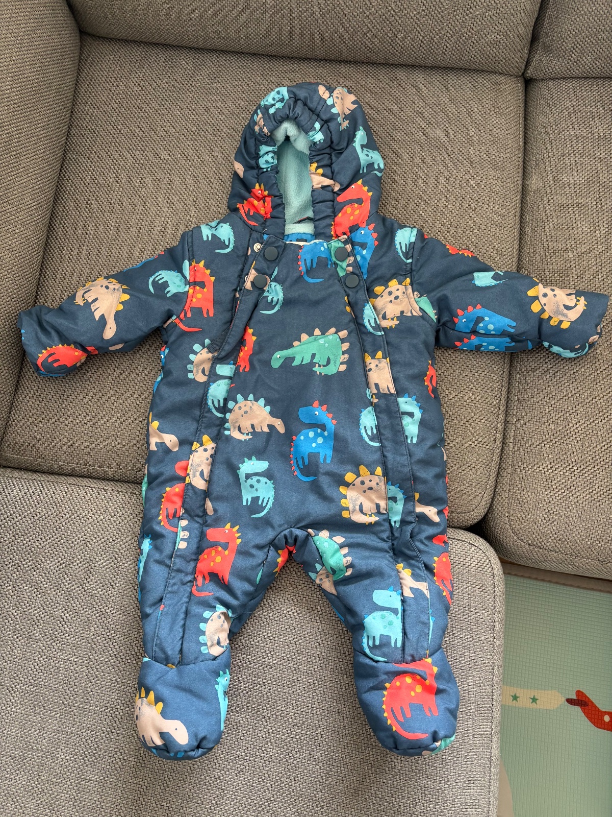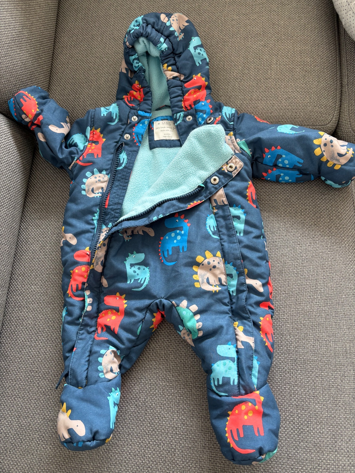 Predam 1x oblecenu kombinezu s makkou podsivkou, zapinanie na 2 zipsy + 2 gombiky hore, vyhrnovacie palciaky na manzetach ktore udrzia ruky a nohy v teple. Velkost 0-3 mesiace.