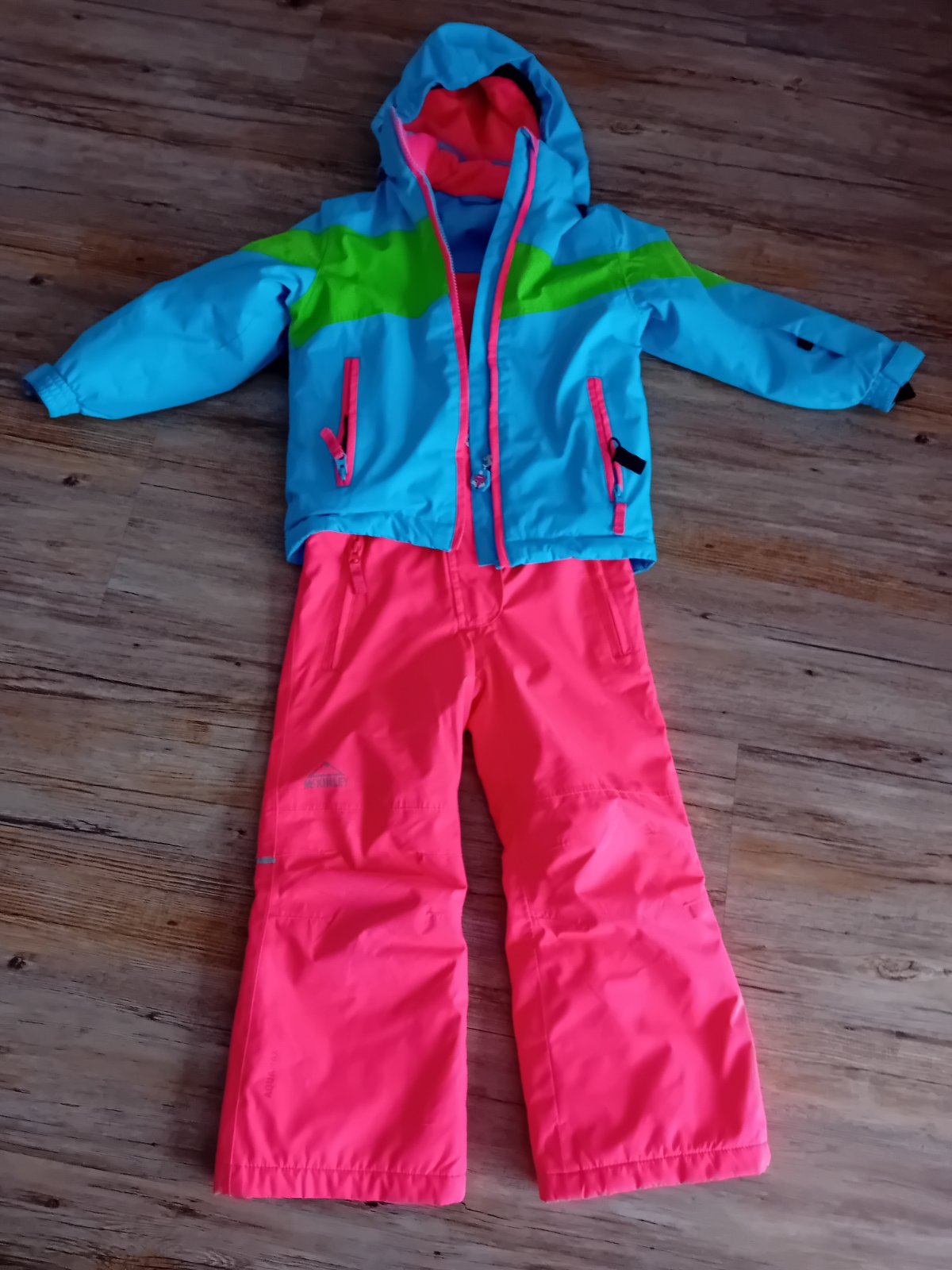 Farba bundy je bledá tyrkysová, nohavice majú výraznú oranžovo-ružovú farbu. Súprava bola nosena pravidelne, majú malé chybičky, všetky sú nafotene a zohľadnené v cene. Pôvodná cena oveľa vyššia. Nič sa nepára, nič nie je zašívane, materiál nepremoká. Pravé iba v prášku na funkčné oblečenie