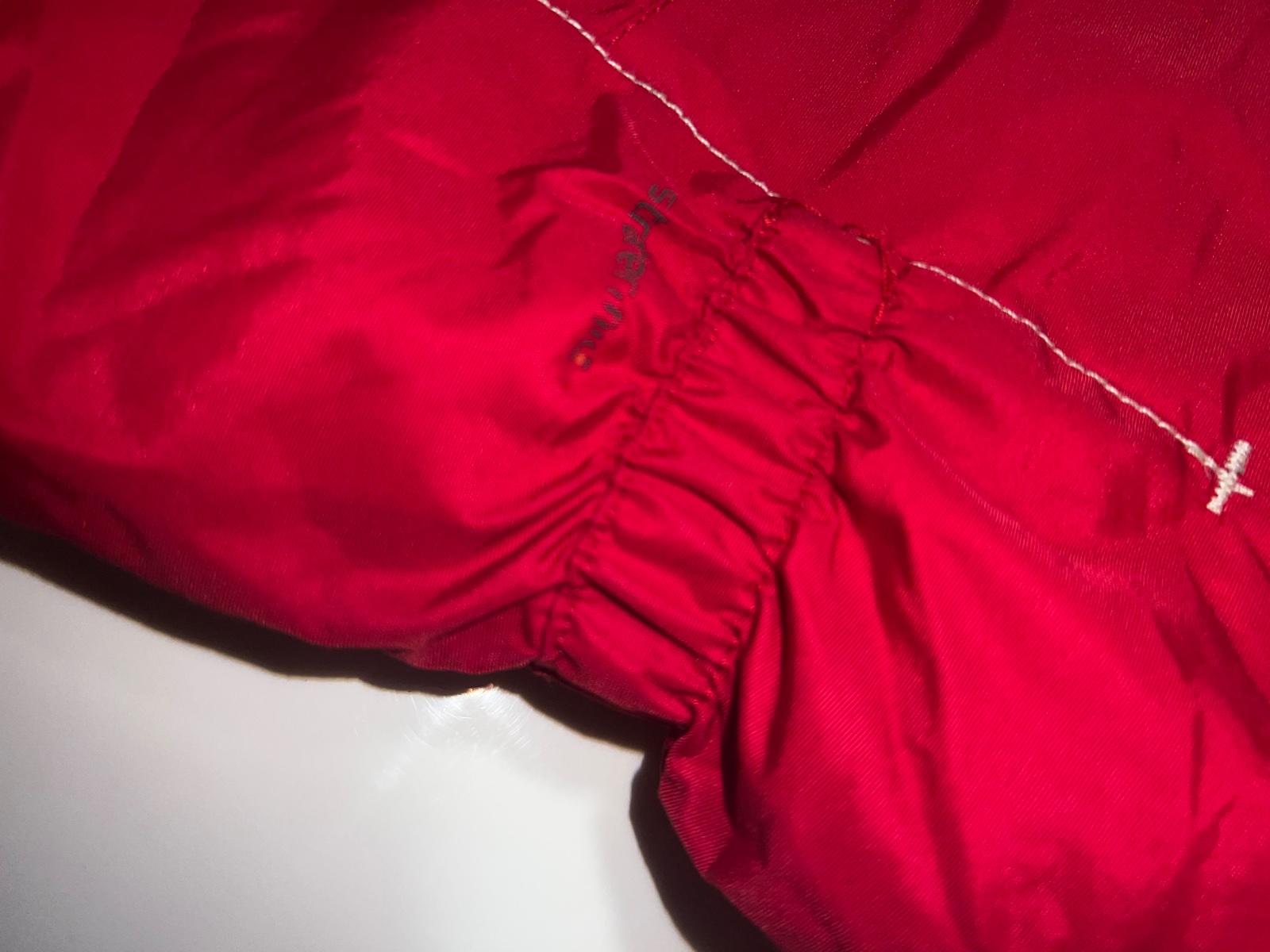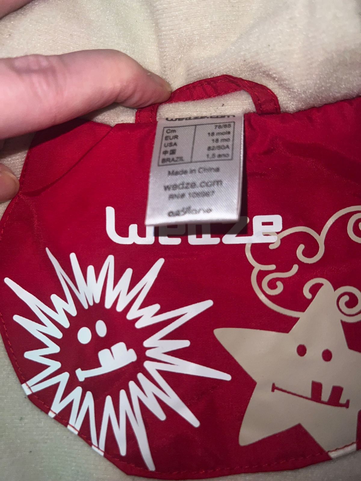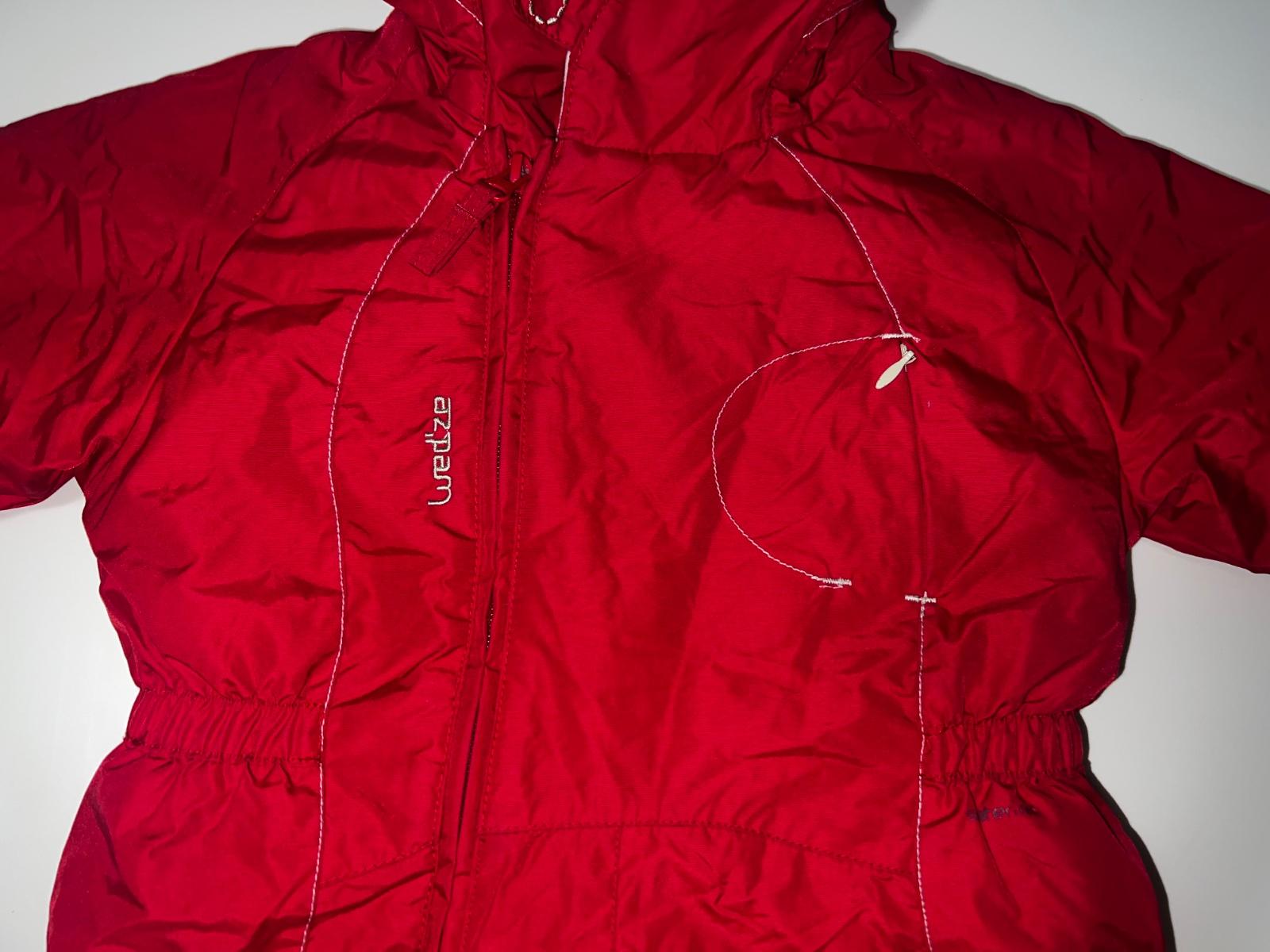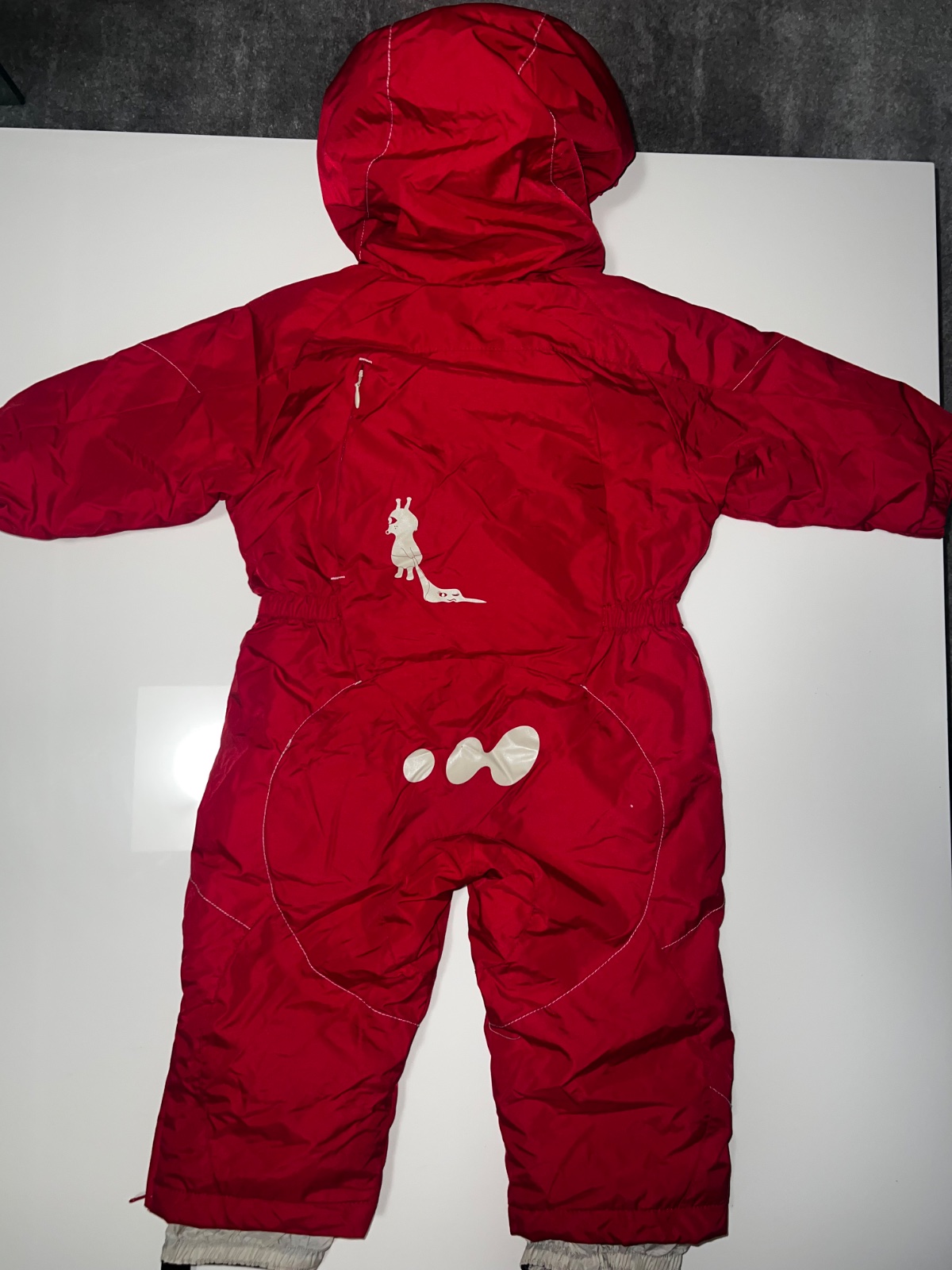 Nenosený overal, vrchná časť aj s kapucňou podšitá fleesom. Farba je výrazna červená. Rozmery: celková dlžka 83 cm, medzi nohami 30 cm, rukáv od pazucha 27 cm, od pleca 34-35. Cena + pošta.