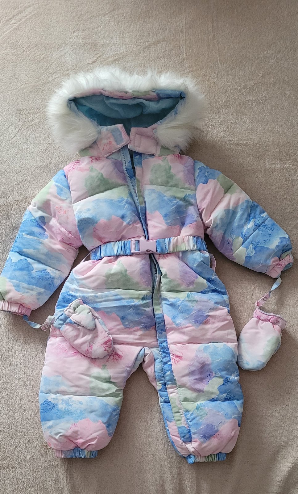Veselá zimná kombinéza používaná jednu sezónu. Odnímateľné rukavičky, opasok aj kožušinka. Pri fotení som si všimla malú dierku na nohavici. Inak bez poškodení. Dĺžka 69 cm Rukáv od krku 39 cm Šírk...
