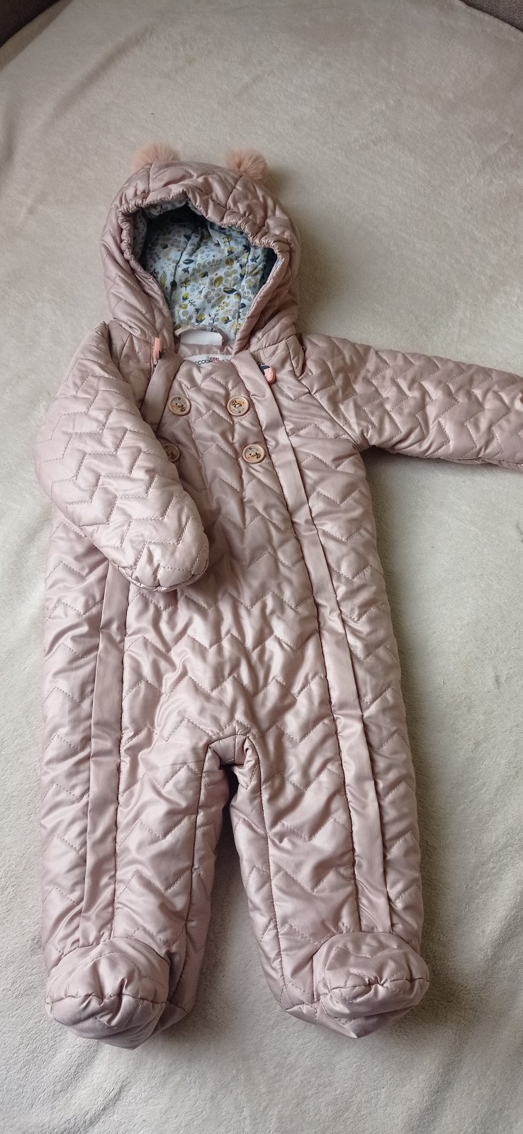 Krásny overal pre dievčatko vo výbornom stave. S praktickým zakončením rukávov- integrované rukavičky. Celková dĺžka od ramena po pätu je cca 60cm.