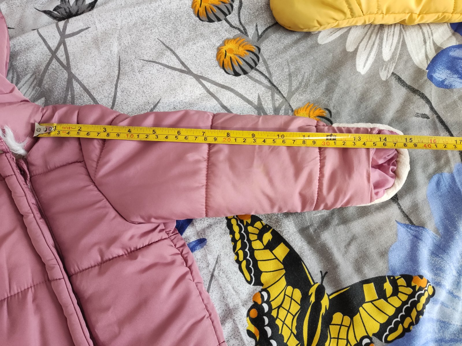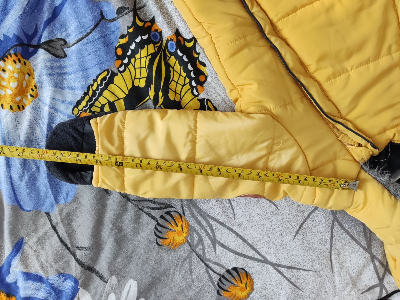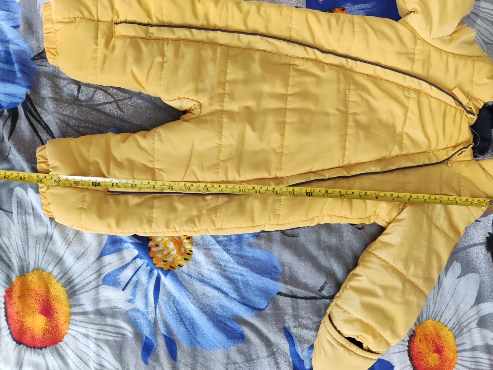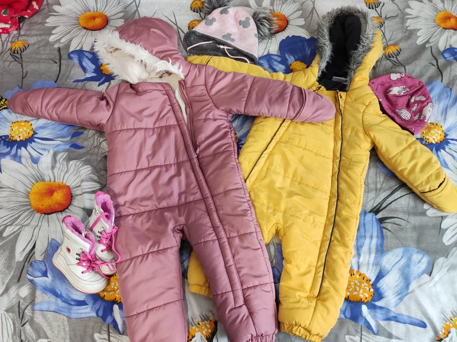 Krásny zimný komplet, veľkosť 86-92. Len na nohaviciach na kolene je fliačik(viď foto) nešlo mi to oprať. Ale nič hrozné.
