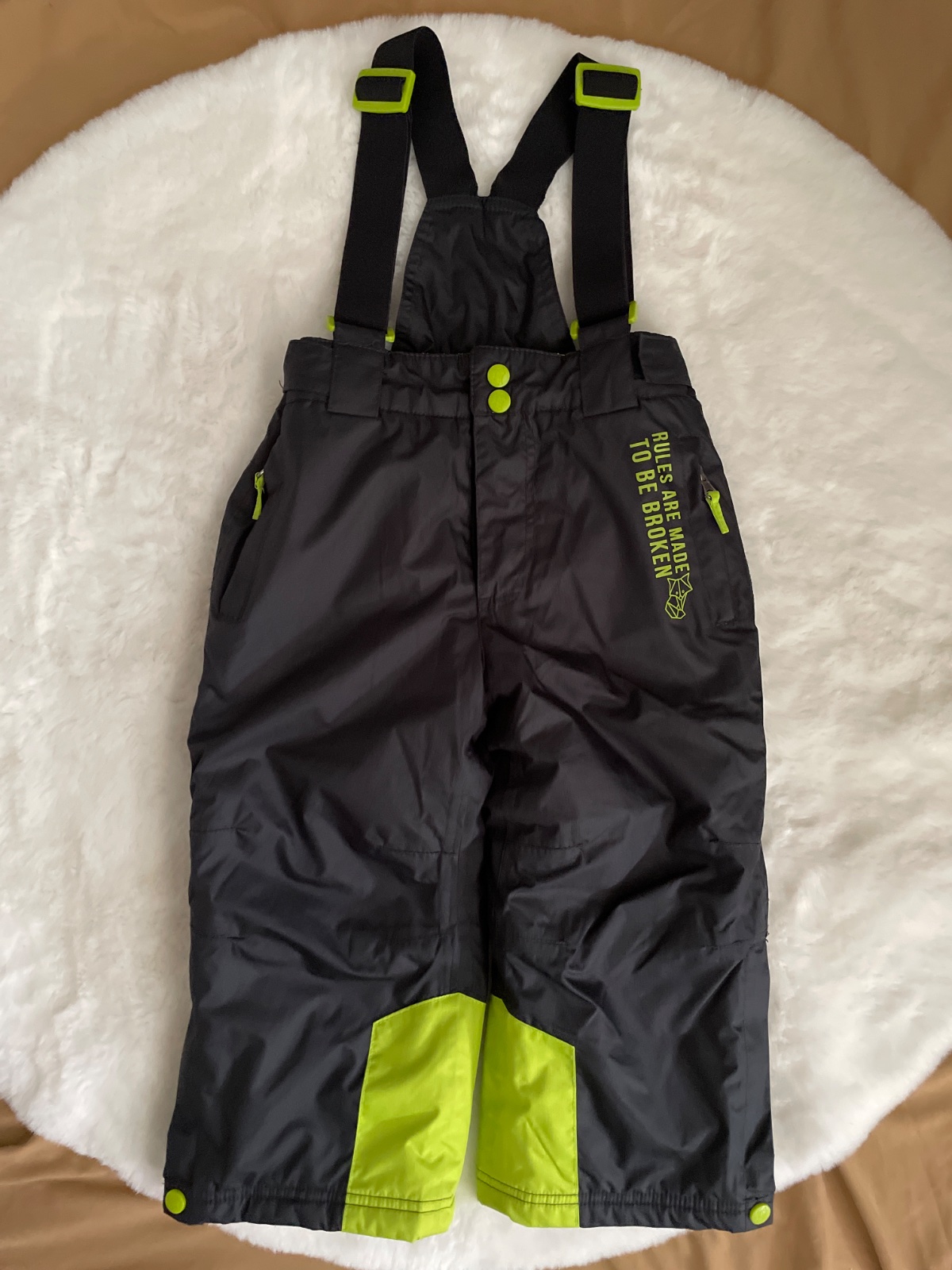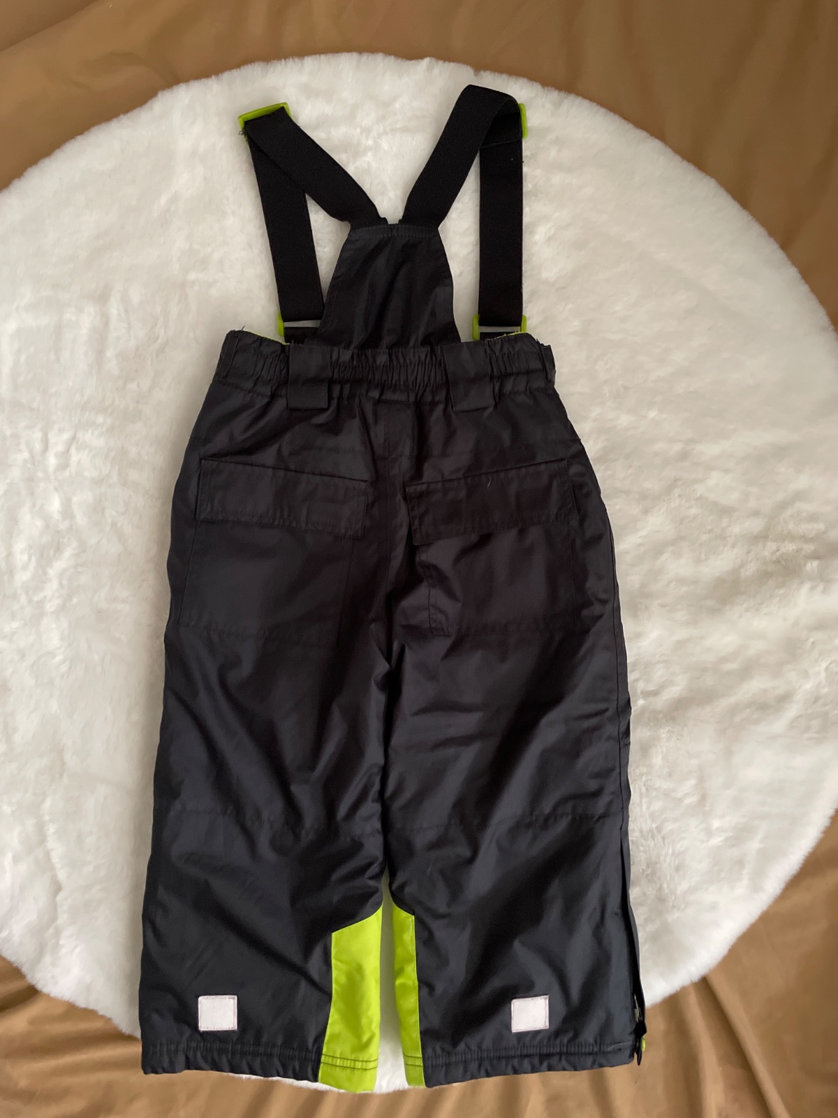 Otepľovačky veľkosť 98/104, na jednej nohe odtrhnutá patentka, pri nosení to nie je vidno, a vzadu sa pri praní odlepili reflexné prvky, na dvor poslúžia. Zohľadnené v cene.