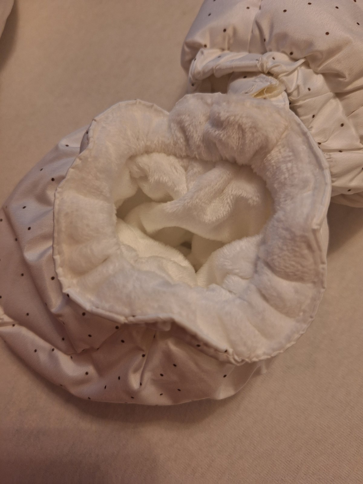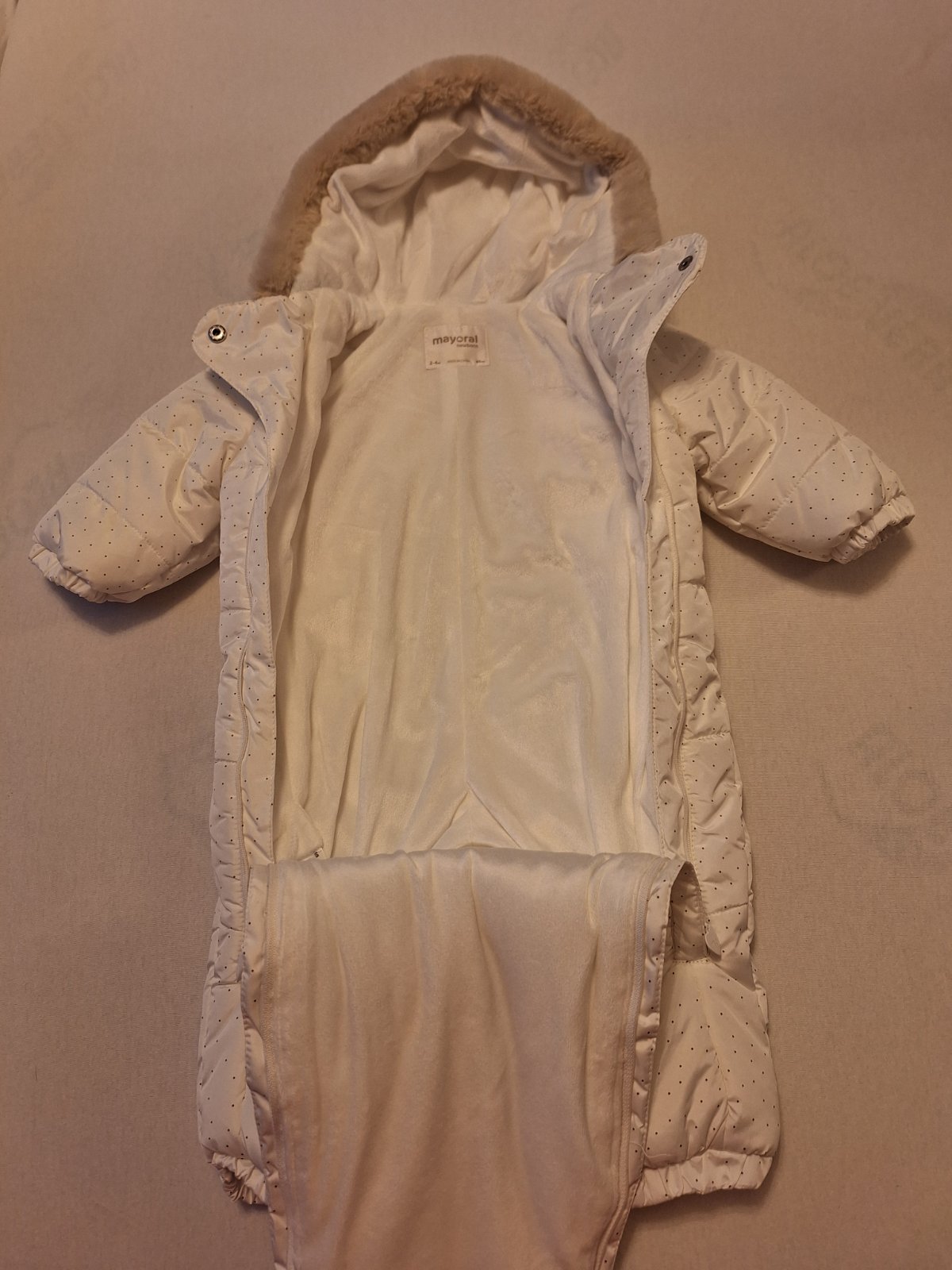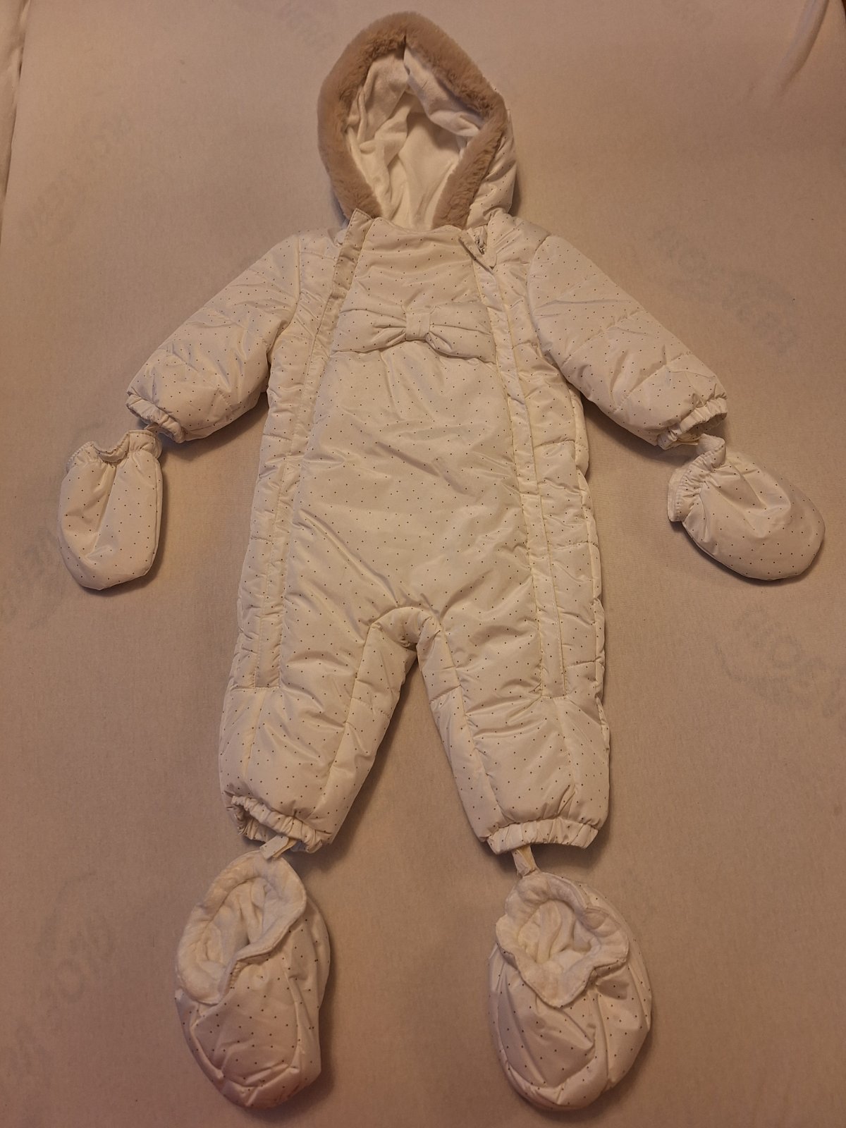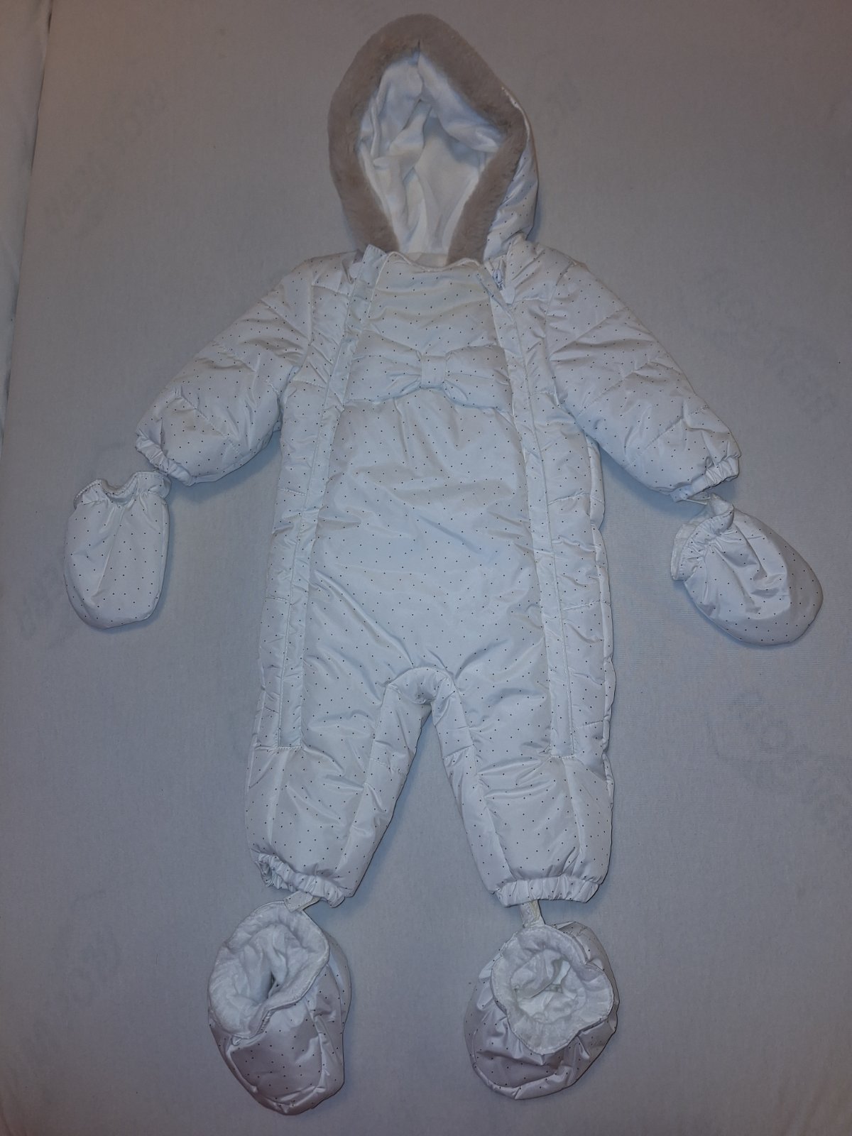 Ponukam na predaj zimnu kombinezu snehobielej farby s bodkami. Velkost 2-4mesiace. Sucastou su rukavice a capacky na nohy. Vnutro je mäkkuckeho plysoveho materialu, teplucka. Velmi kvalitna kombineza znacky Majoral. Nepouzita ani raz nakolko dcera nosila ortezu a nemohla nosit kombinezu. Povodna cena 38 eur.