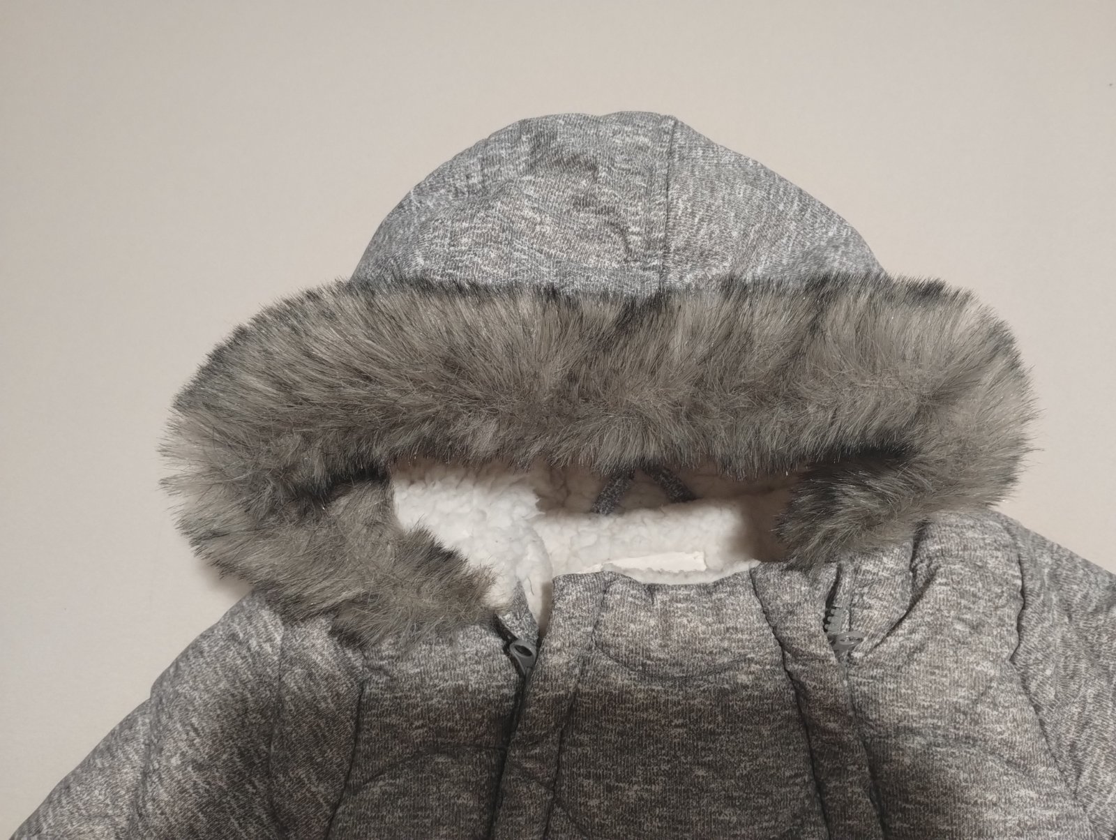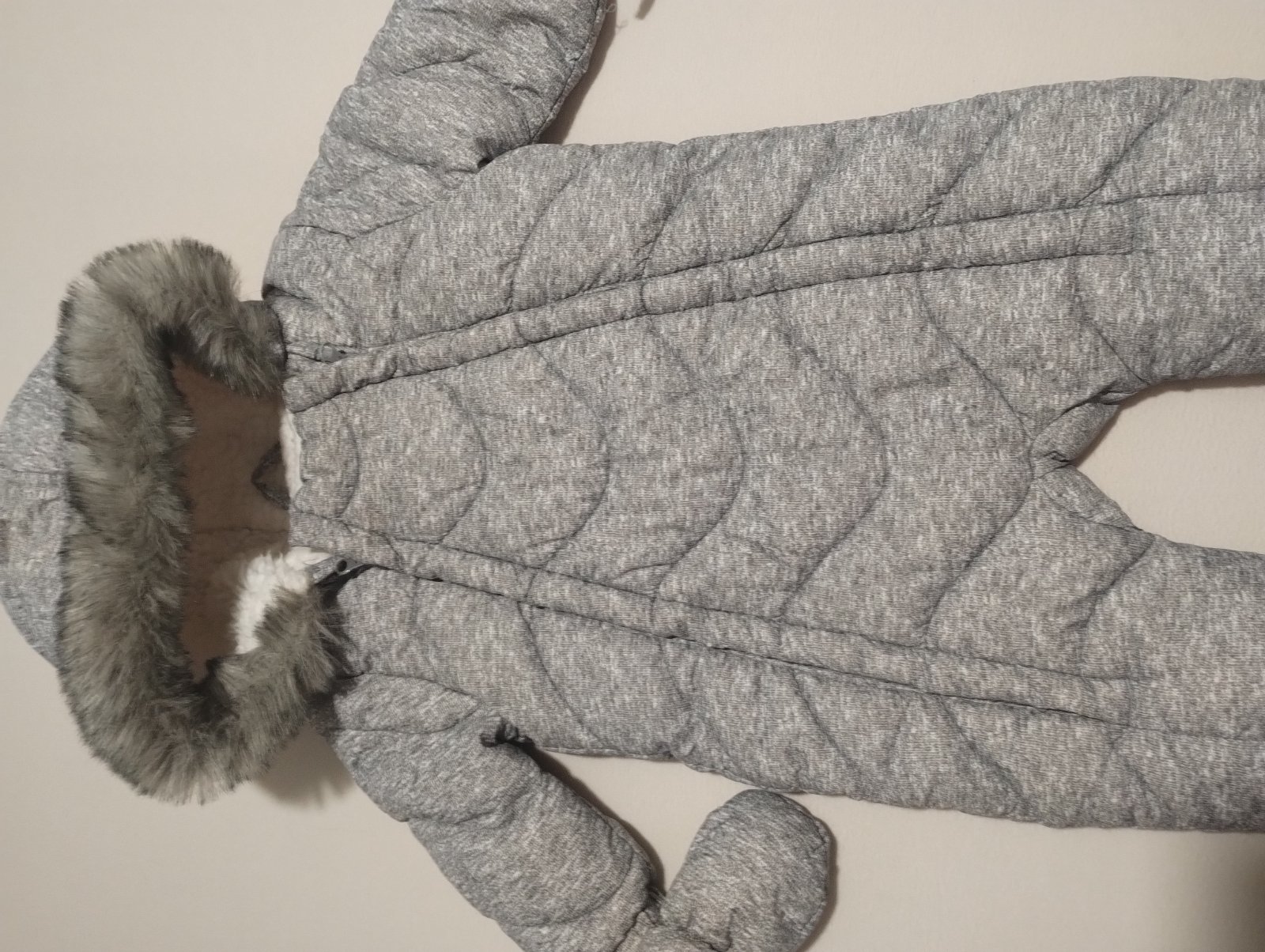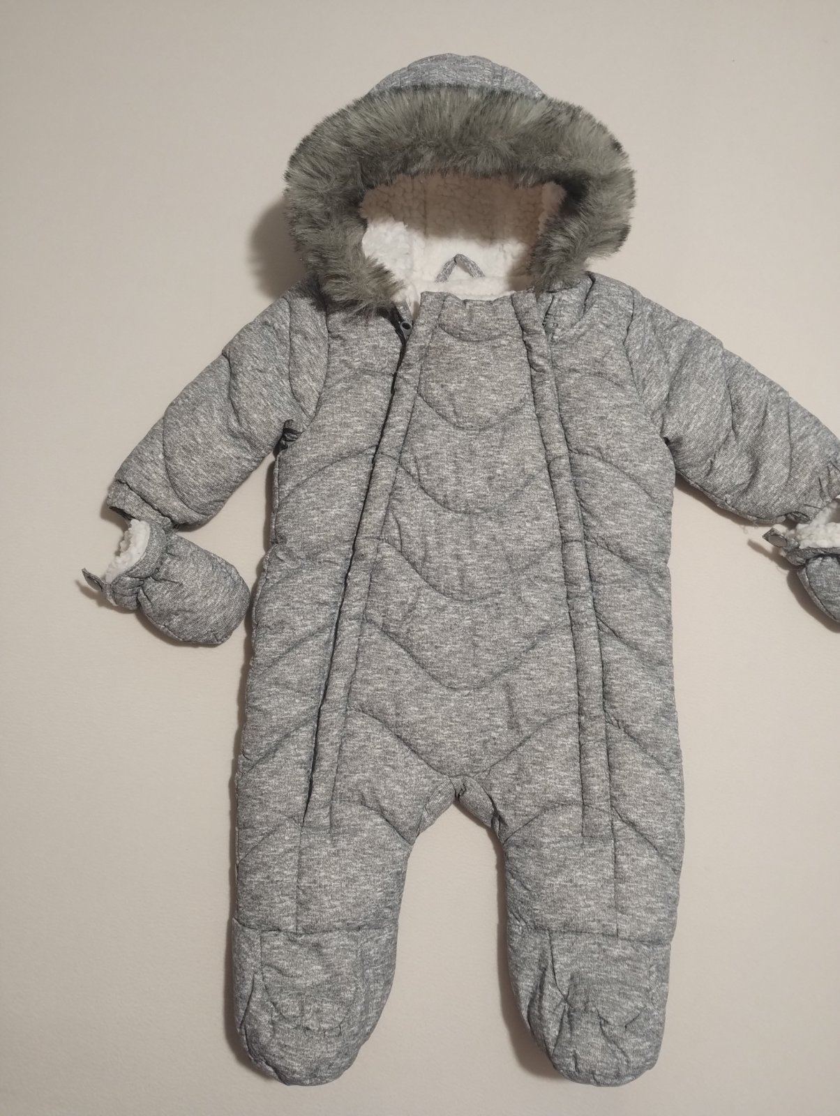 Bez poškodenia. Ľahké oblielanie vďaka dvom zipsom. Teplučký, vhodný cez zimu do autosedačky. 3-6 mesiacov