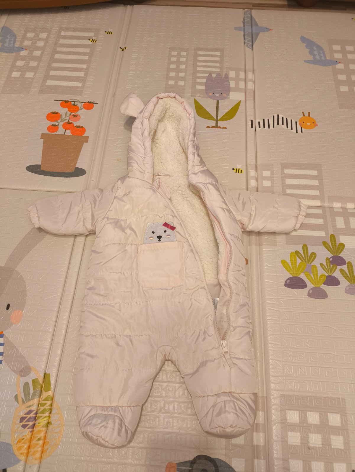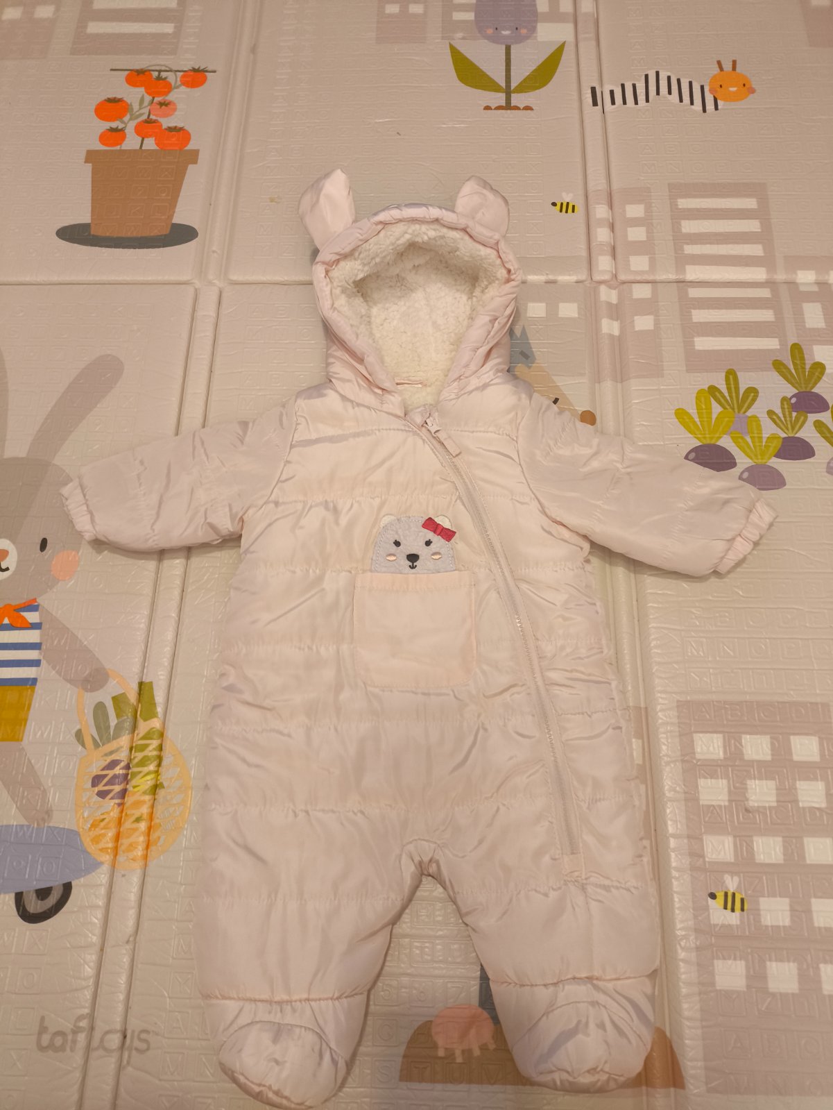 Zimná kombinéza s rukavičkami. Bez poškodení. Po 1 dieťati. Ľahko sa oblieka, vďaka 2 zipsom. Dĺžka od pleca 65 cm.