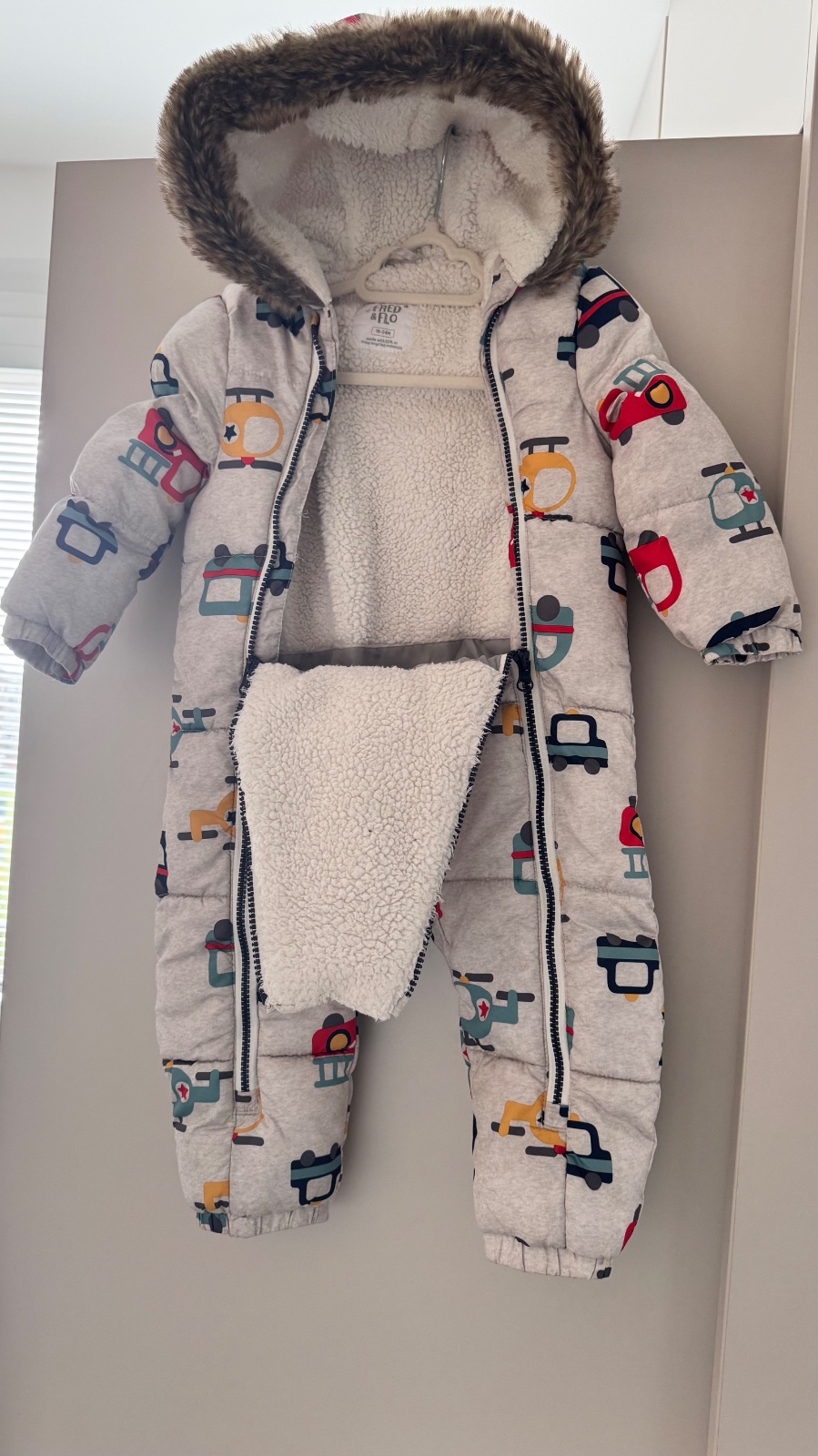 zimná kombinéza, overal zateplené kožušinou, na štítku uvádzané veľkosť 18 – 24 mesiacov, ale kľudne to môže byť trošku na väčšie dieťatko, po stranách je zips, nepoškodené, využívané len jednu sezónu