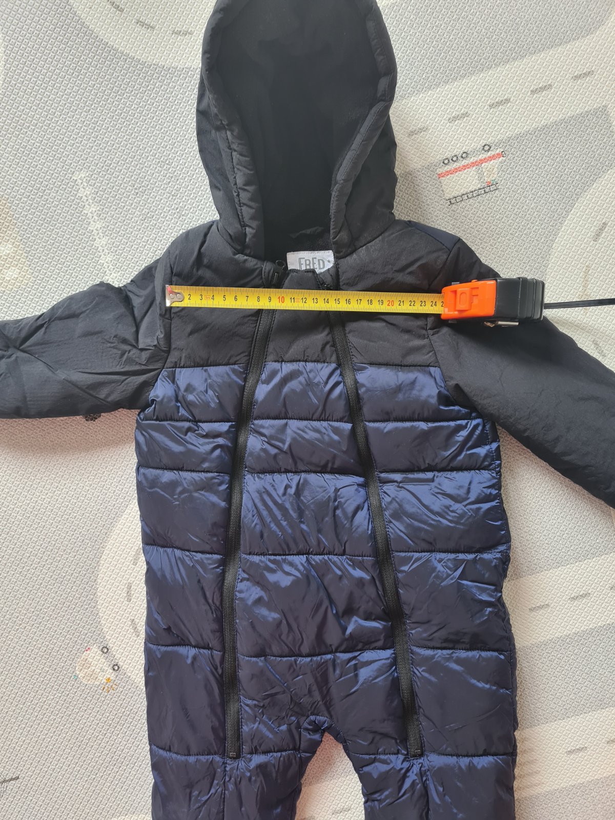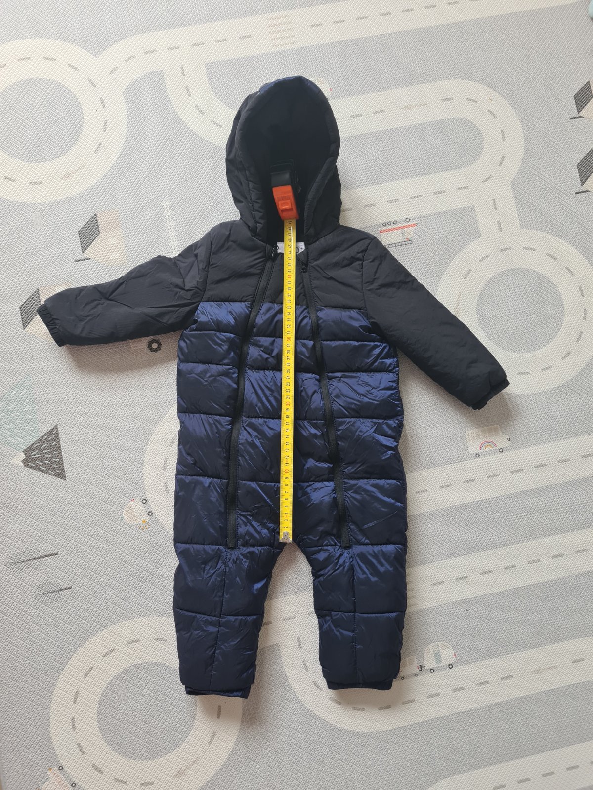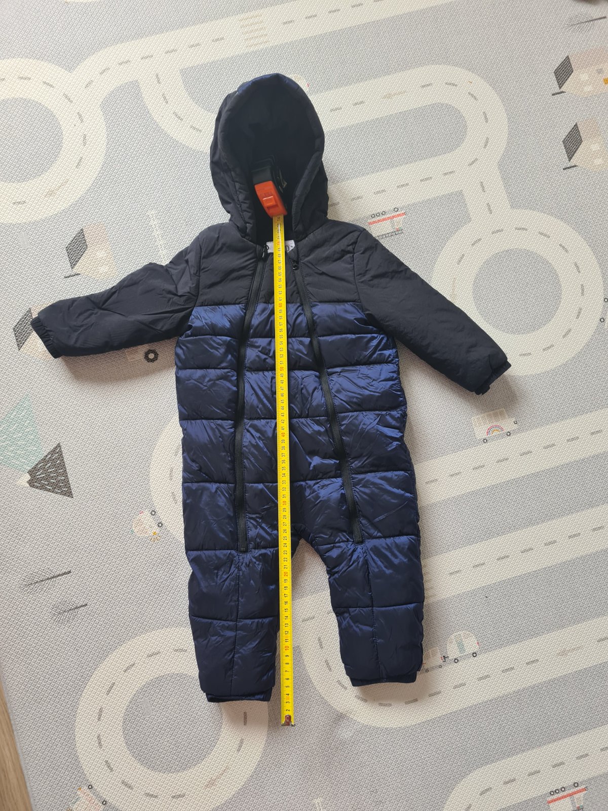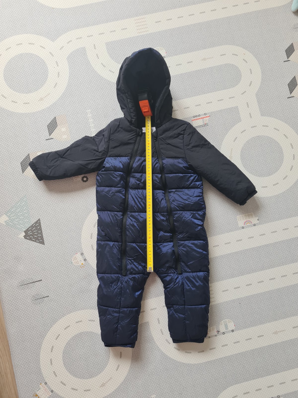 Predám super overal- kombinézu na zimu. Podsity je sivým teplým flisom. Bola super,že v pohode s ňou vošiel aj do sedačky, dala sa zapnúť, pekne sedí. Dĺžka je 70 cm, a šírka 68cm.