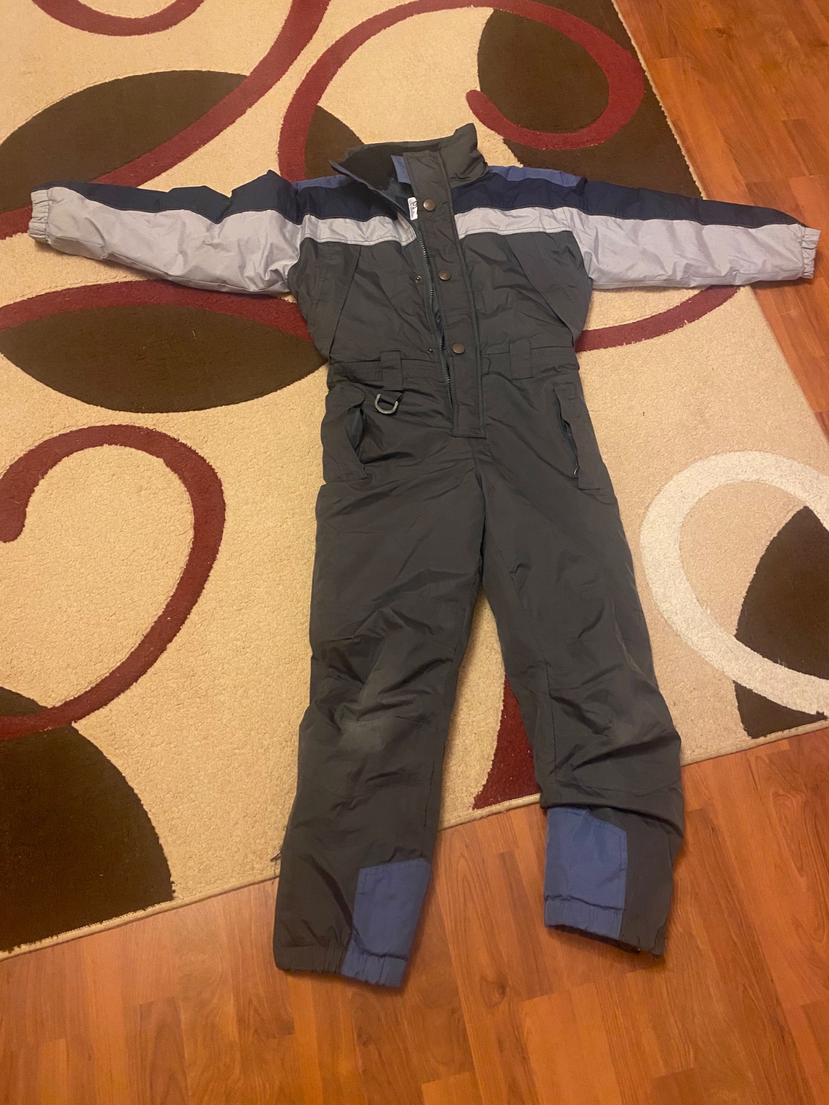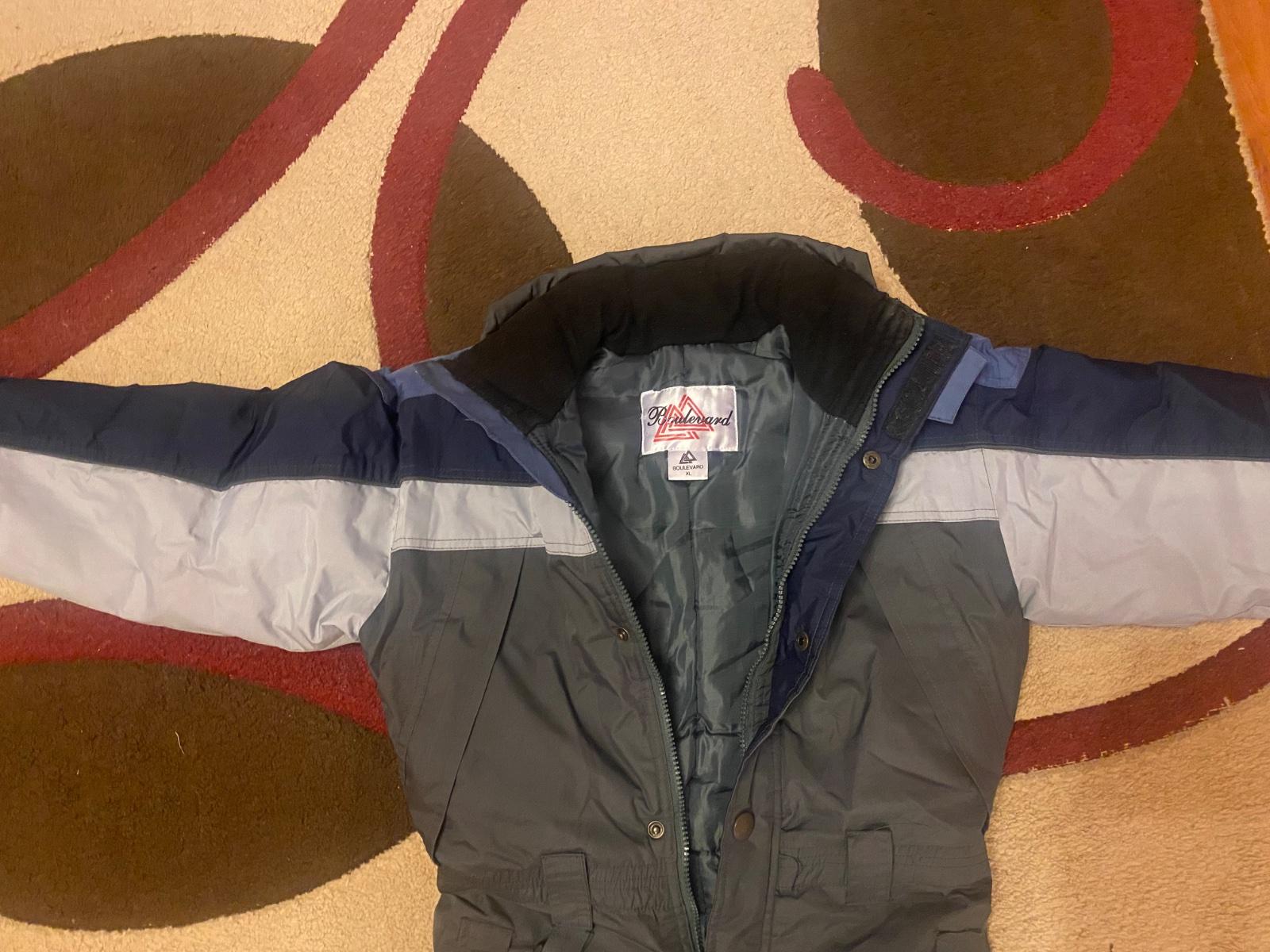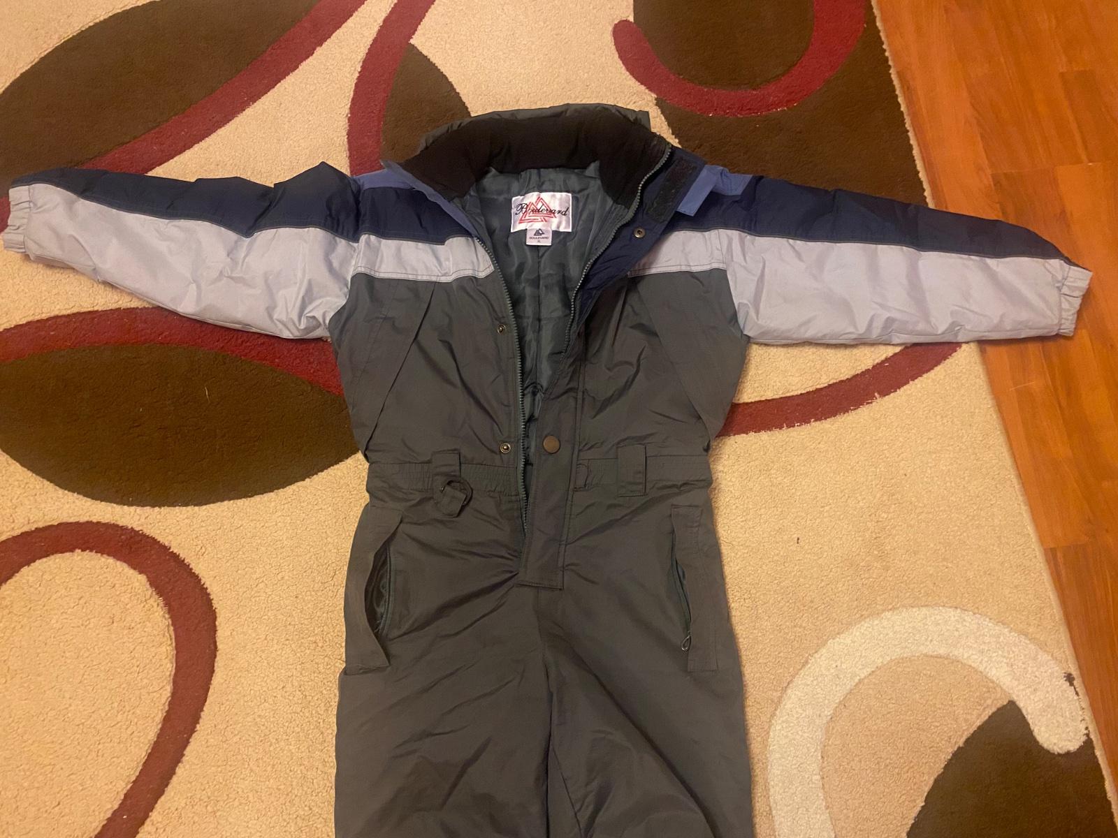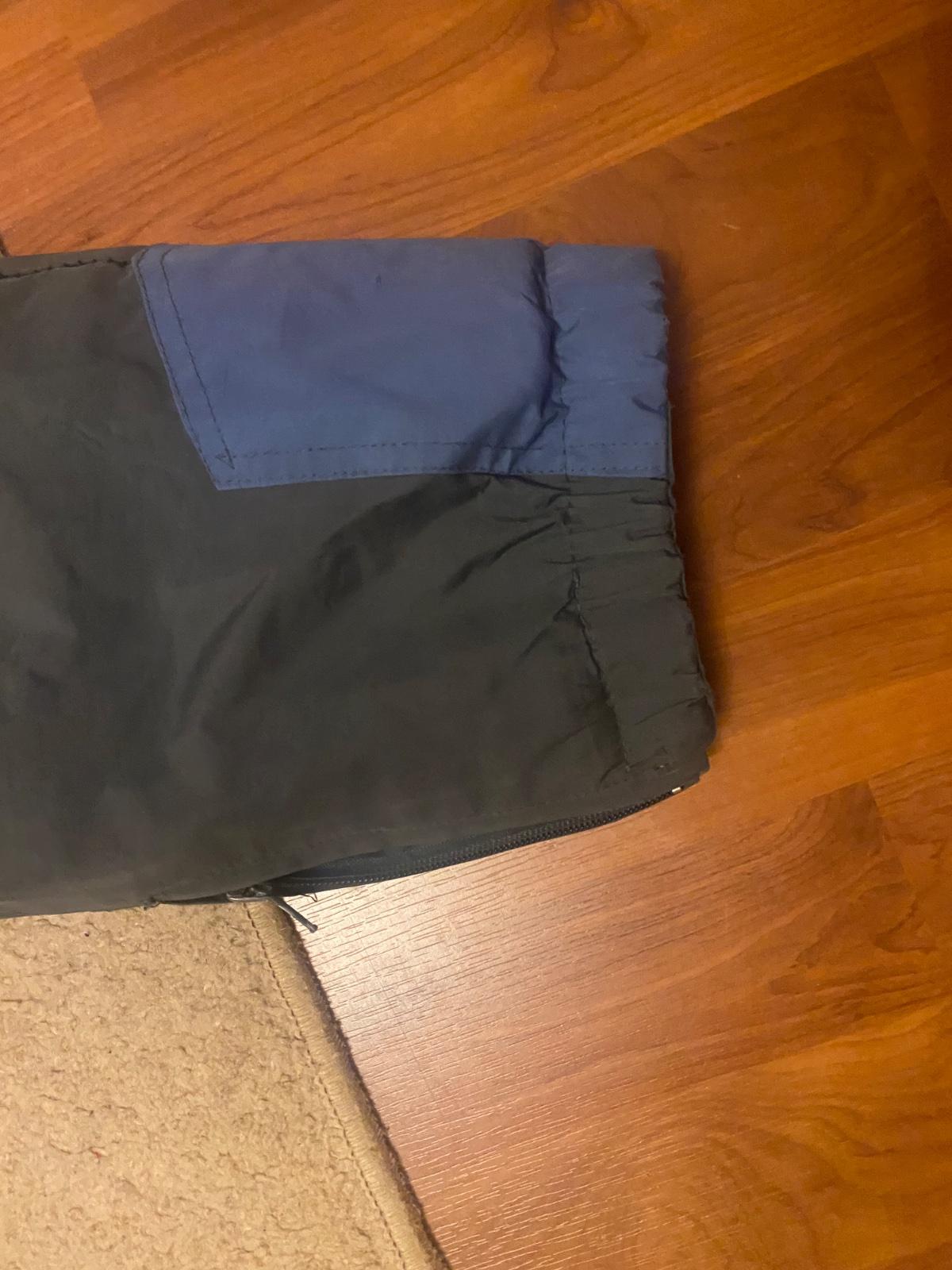 Kombinéza do snehu. Rozmery: dĺžka zhora po pas 41 cm, od pása dole 89 cm, od rozkroku dole 63, pas 39 cm, boky 48 cm, rukáv 49 cm, šírka pod pazuchami 49 cm.