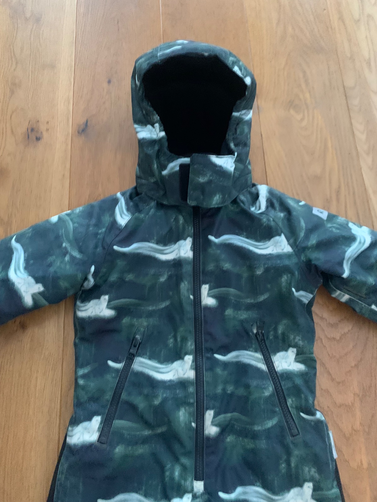 sedí na 104 a 110, Miery: celková dĺžka 92 cm, sirka 42 cm, rukav od kapuce 45 cm, VD rukav 29 cm, VD nohavice 41 cm