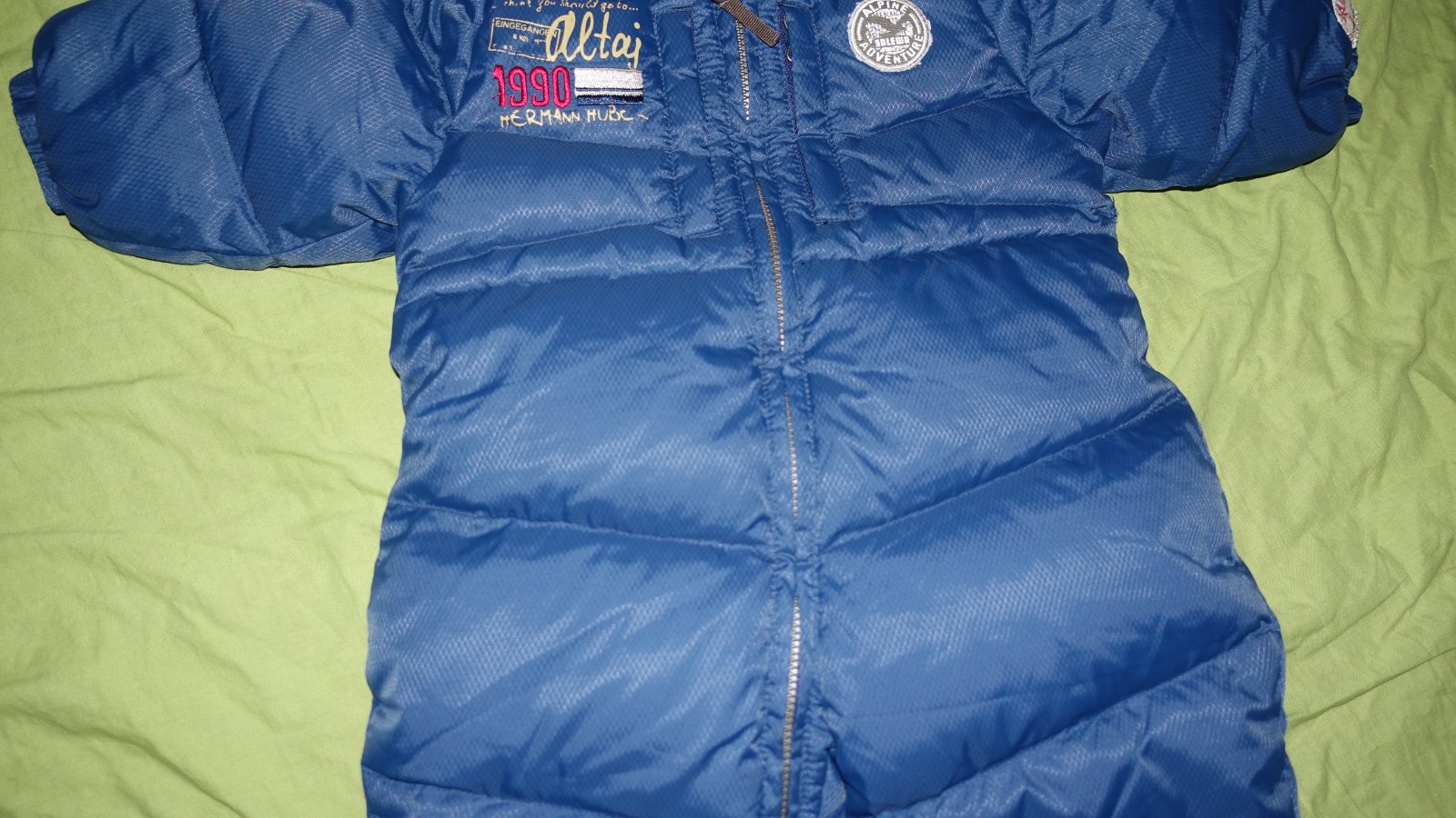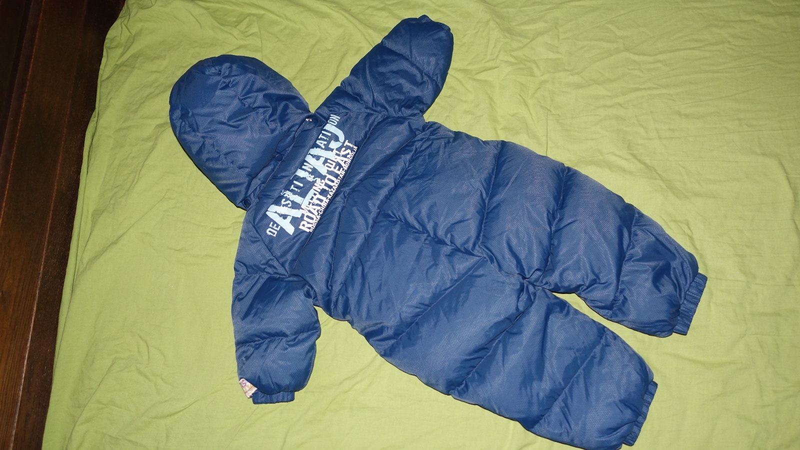 Krasna zimna kombinezka vo velmi dobrom stave- akurat vzadu na kapucni a hned pod kapucnou ma akoby vypalene (vid foto)- nie je to vsak pri noseni velmi vidno. Velkost je uvedena na vysku 68cm a vek 9 mesiacov (podla mna to skor ta 74-ka). Je tmavsia ako na fotke.