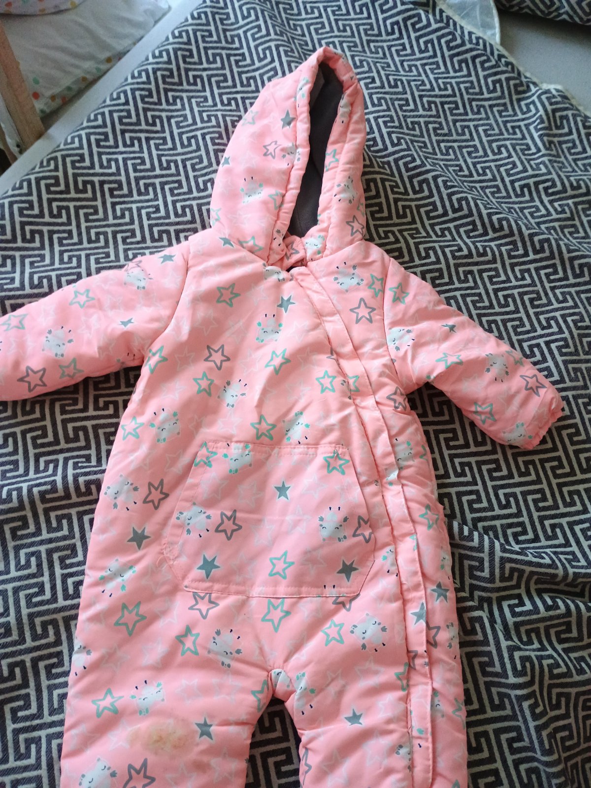 Farba je merunkova skôr .Pise 80velkost ale da sa využiť na dlhšie lebo nožičky sa dajú odpojiť pekný teply 2x oblečený zachovalý je ruzove rukavice gratis