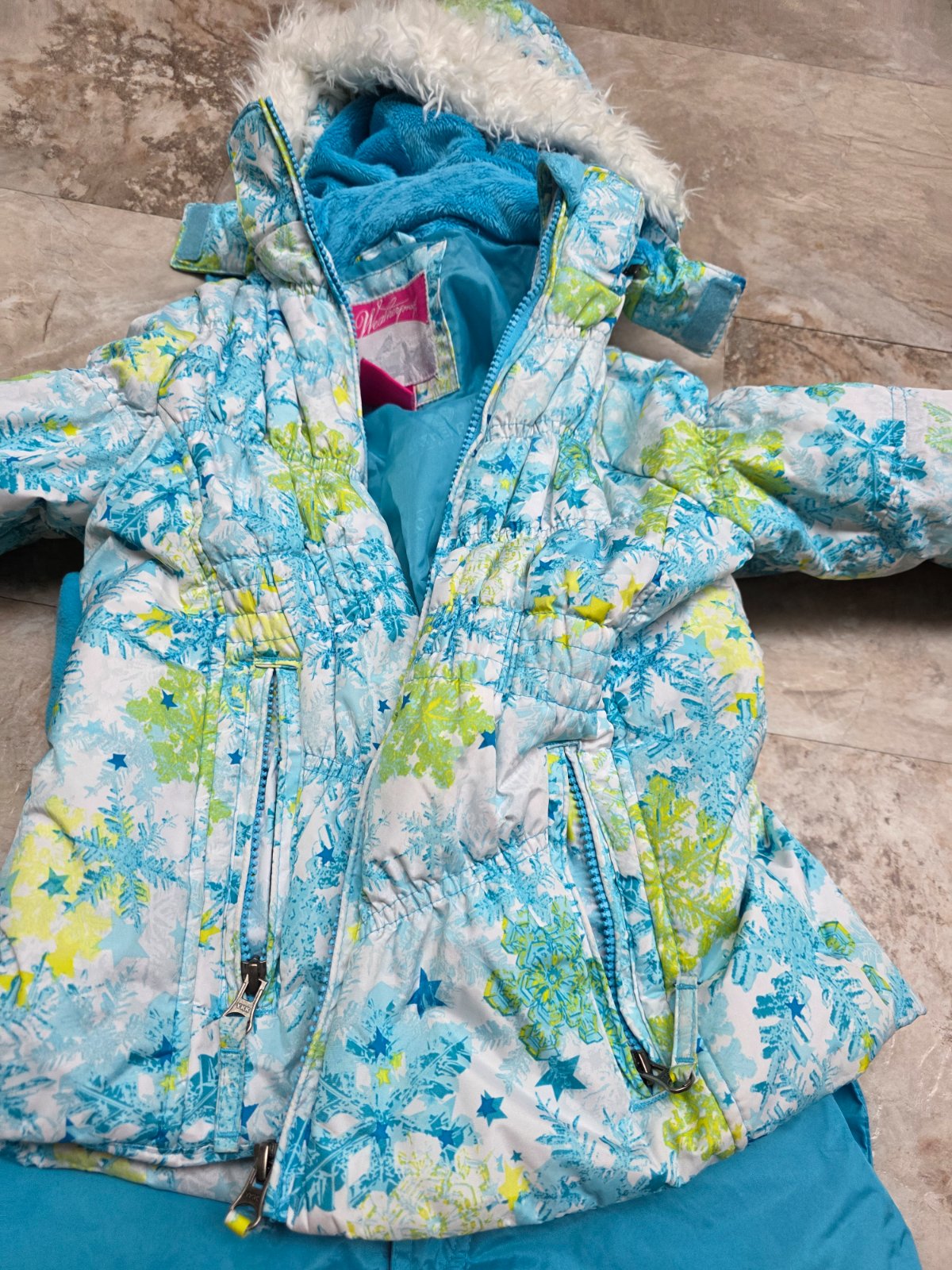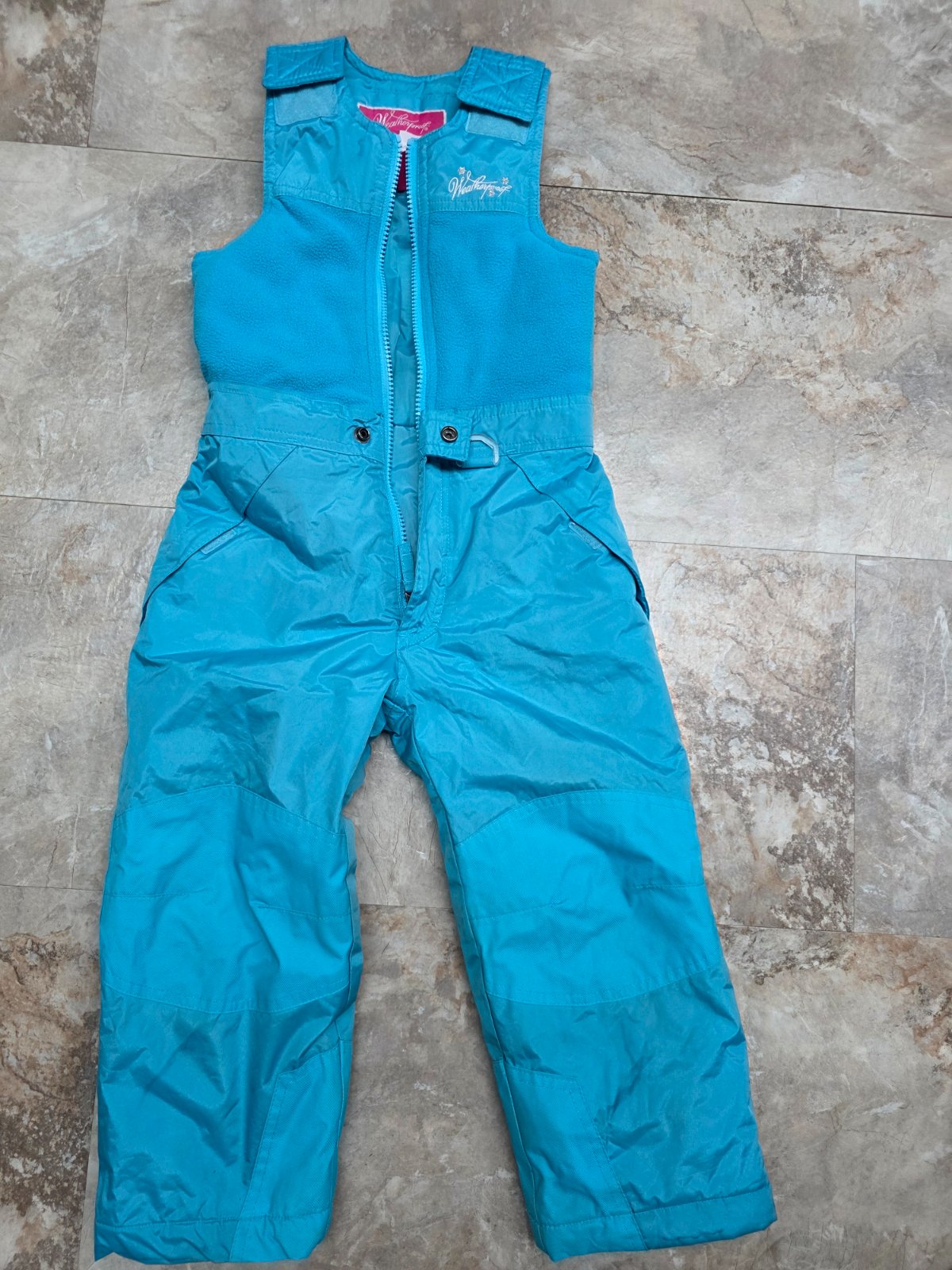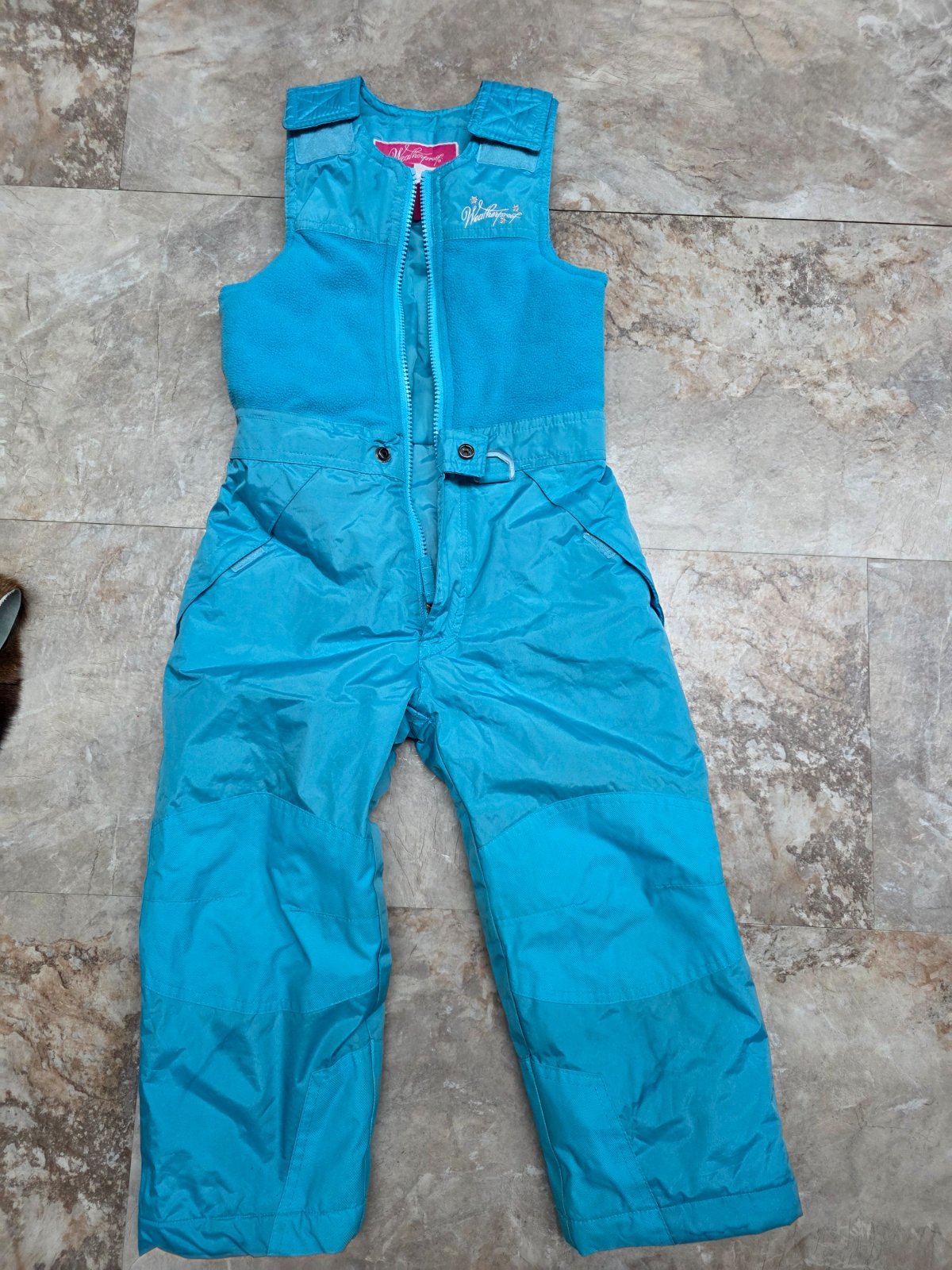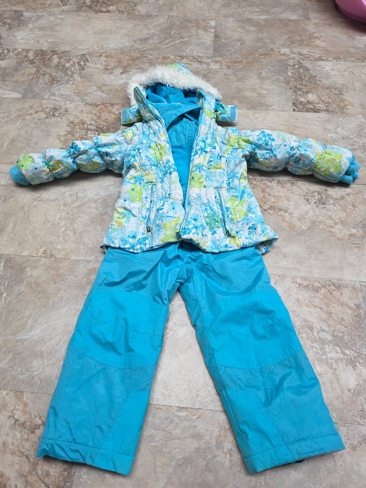 Krasna suprava, oteplovaky su aj na hrudi, aby hriali, na ramenach suchy zips, aby sa dali prisposobit vyske dietatka, kolena spevnene. Bunda na odopinatelnu kapucu na zips, 2 vrecka na zips, rukavy ukoncene takym makkym plysom. Aj golier je taky.