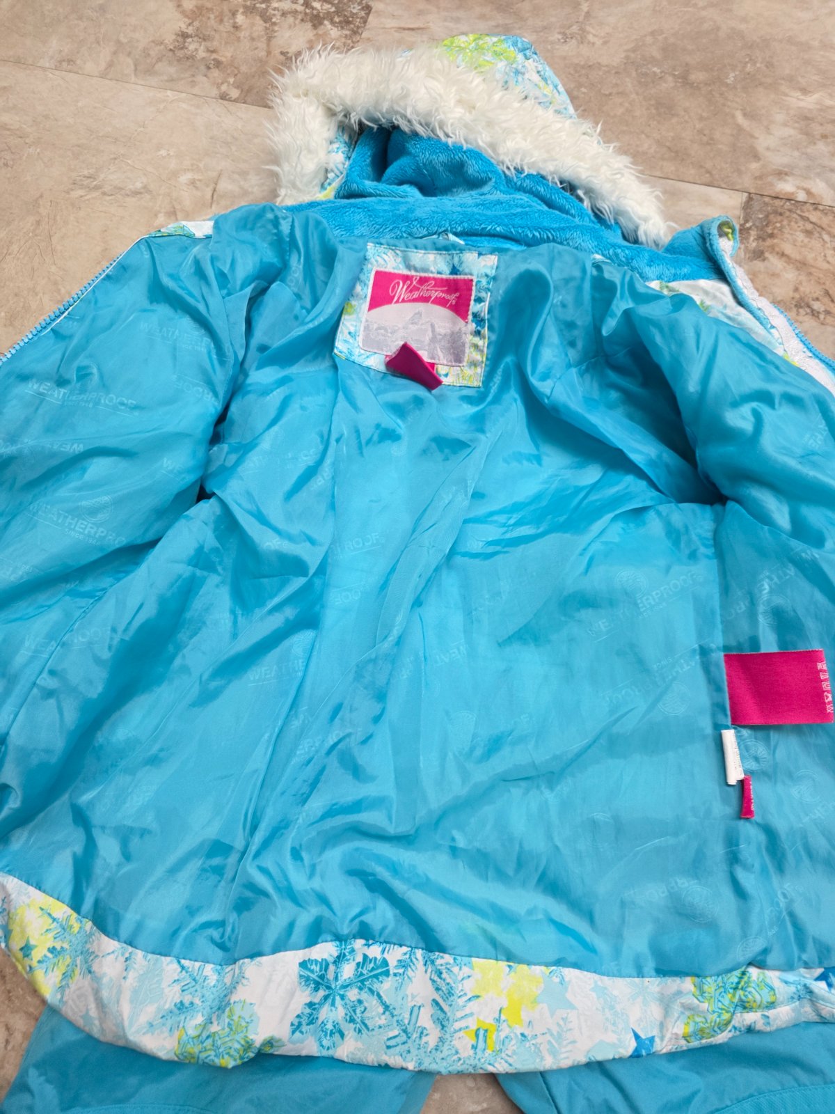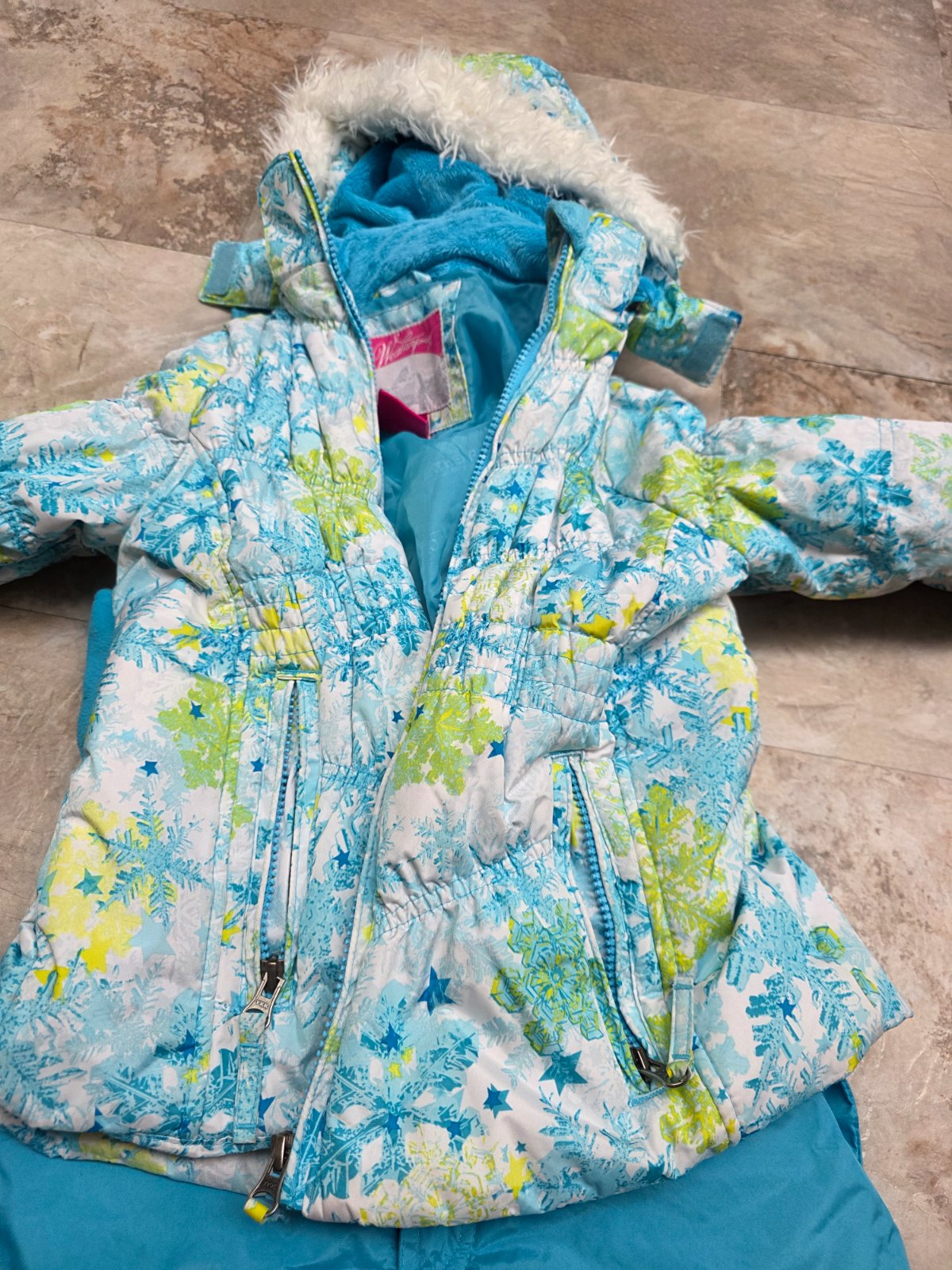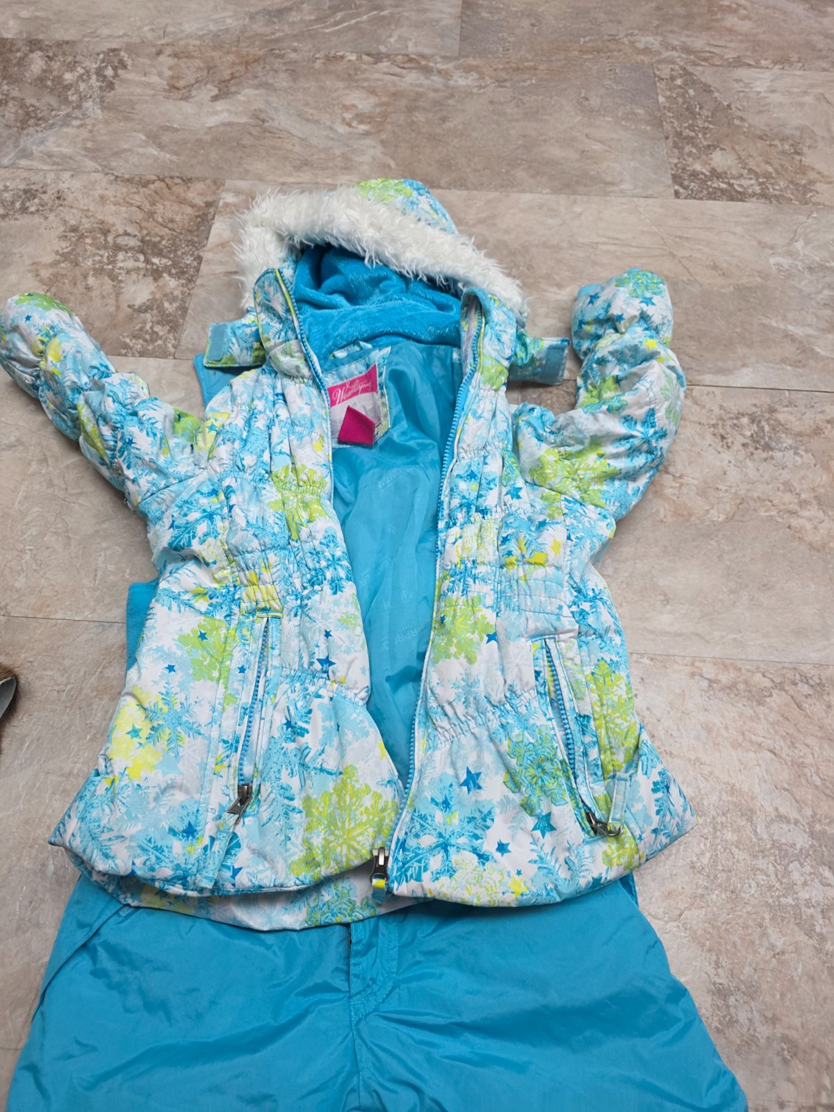 Krasna suprava, oteplovaky su aj na hrudi, aby hriali, na ramenach suchy zips, aby sa dali prisposobit vyske dietatka, kolena spevnene. Bunda na odopinatelnu kapucu na zips, 2 vrecka na zips, rukavy ukoncene takym makkym plysom. Aj golier je taky.