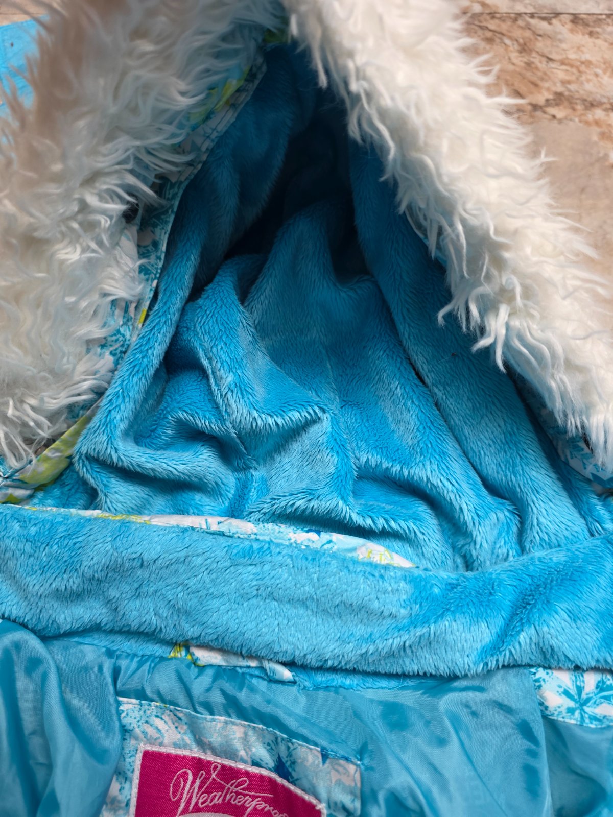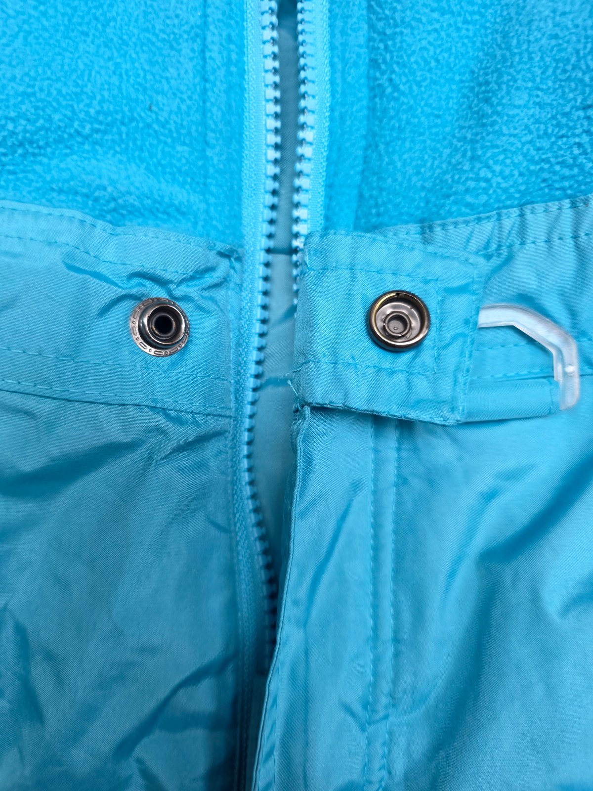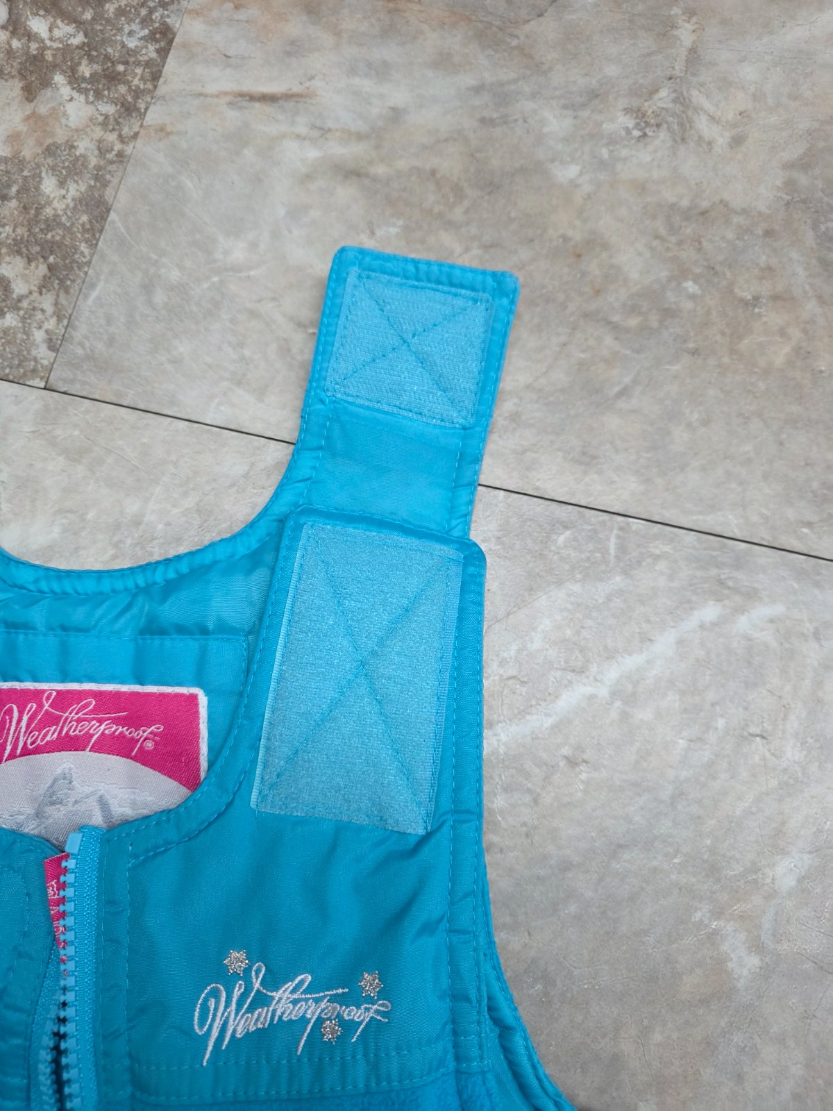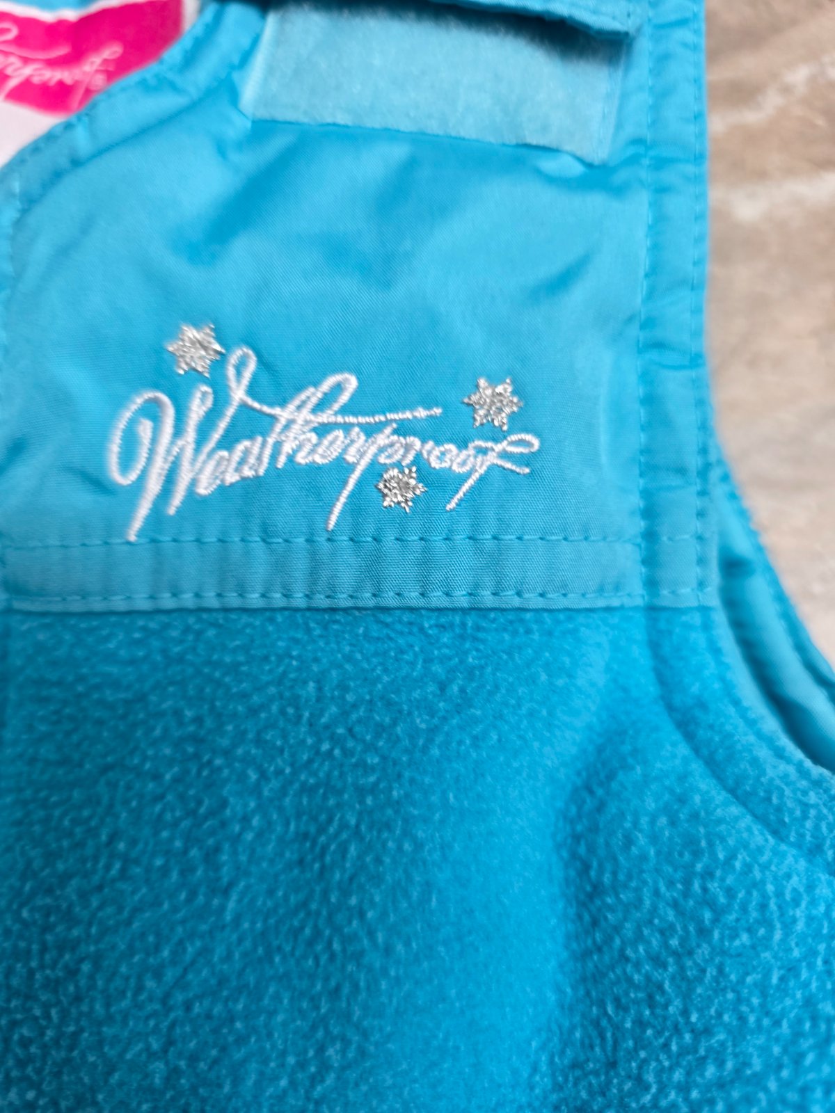 Krasna suprava, oteplovaky su aj na hrudi, aby hriali, na ramenach suchy zips, aby sa dali prisposobit vyske dietatka, kolena spevnene. Bunda na odopinatelnu kapucu na zips, 2 vrecka na zips, rukavy ukoncene takym makkym plysom. Aj golier je taky.