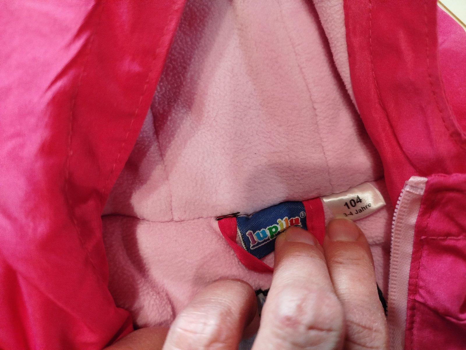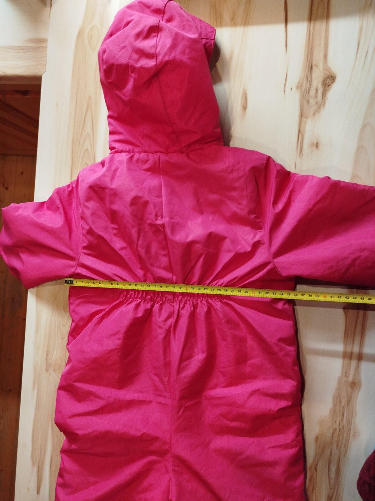 nosený, zips ošúchaný, aj látka medzi kolienkami trochu ošúchaná (viď obe chybičky na foto), vo vnútri došitý sťahovací pás (dá sa vybrať), iné poškodenia nemá, veľkosť 104, celková dĺžka 88cm, ruk...