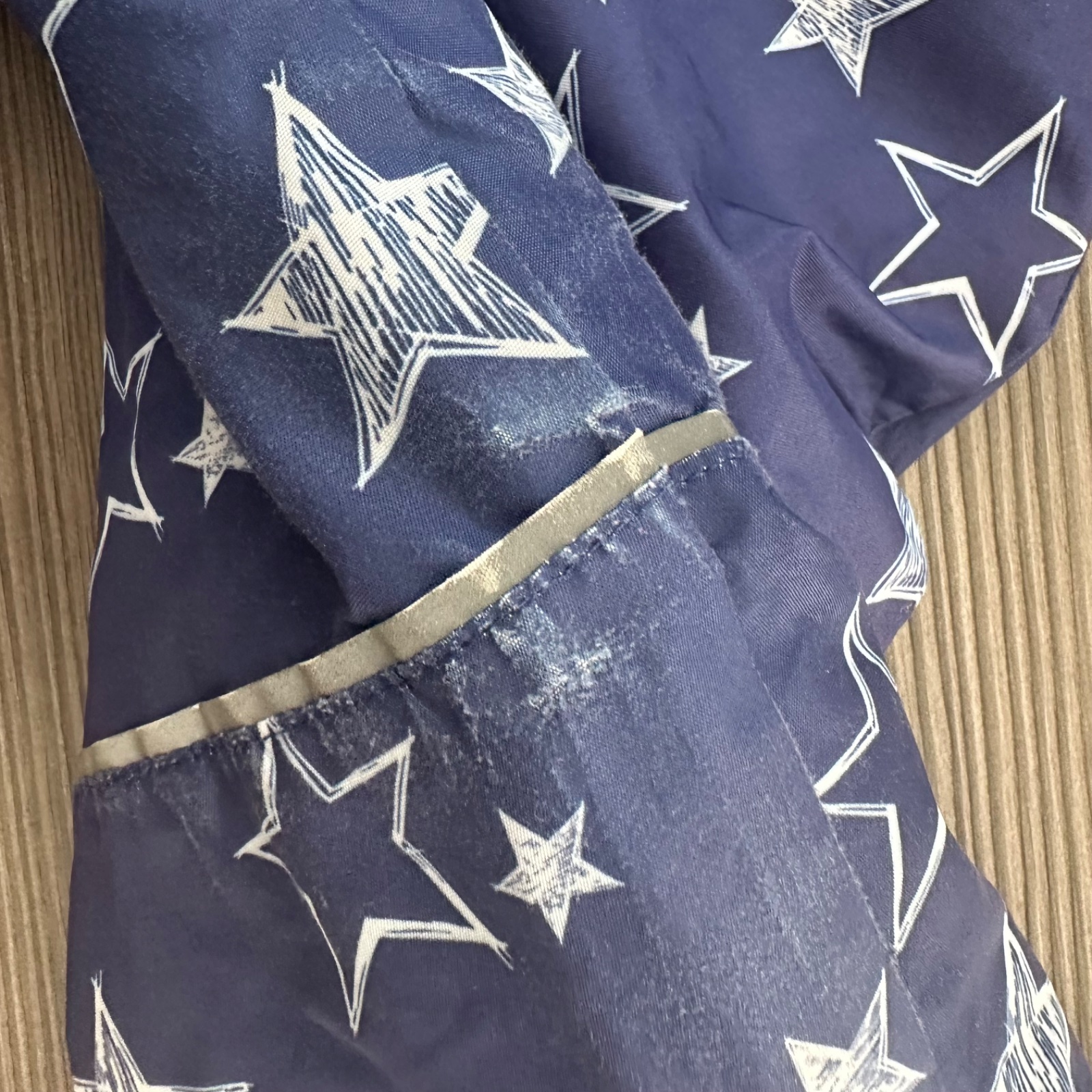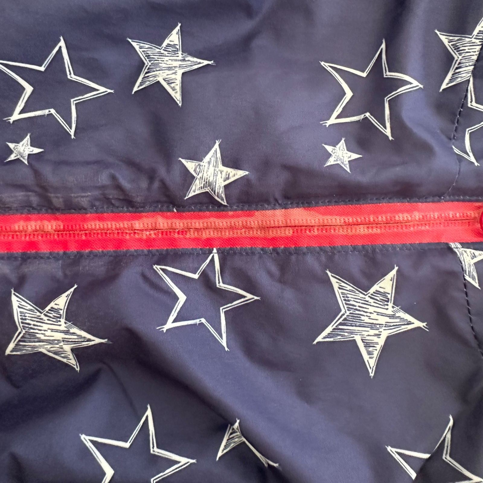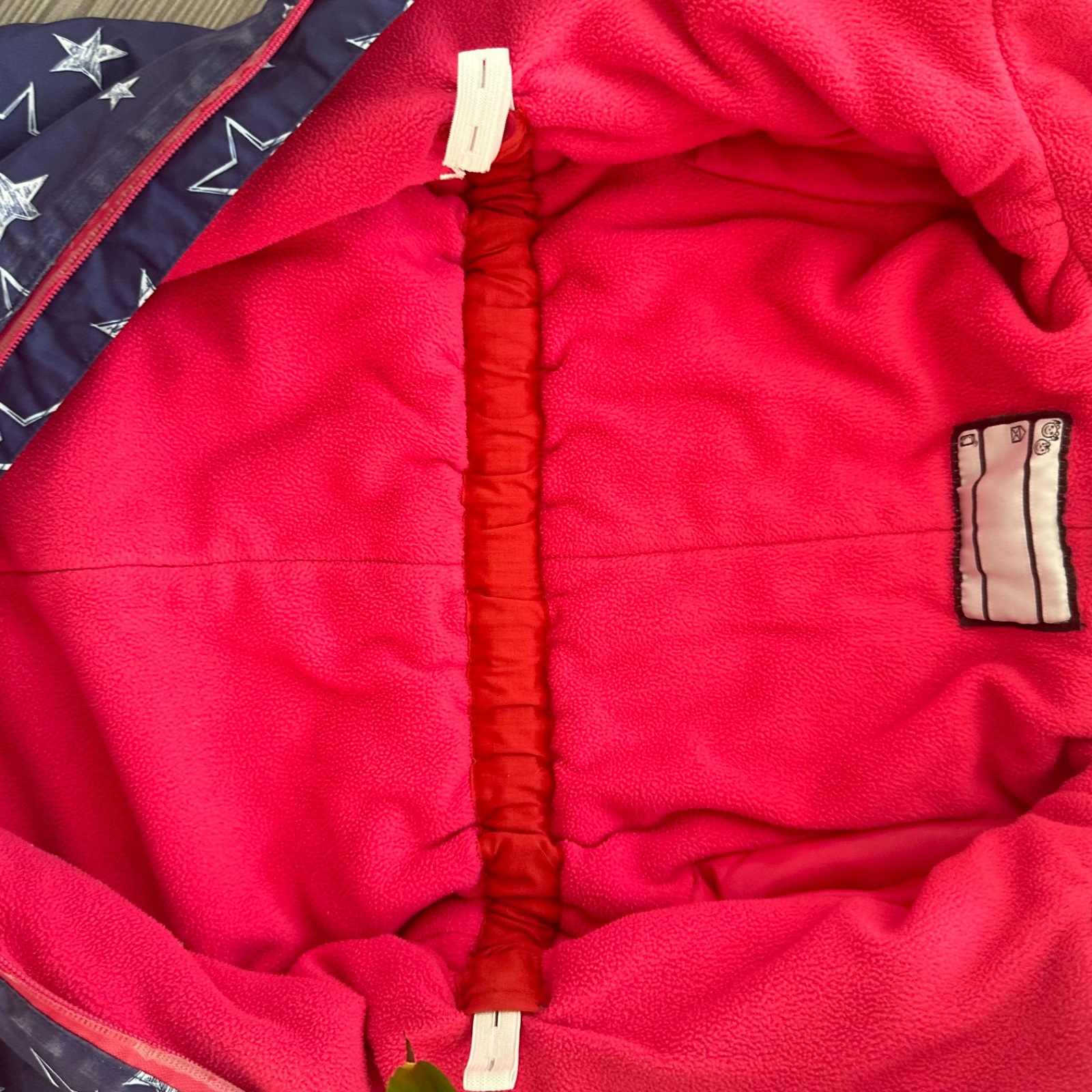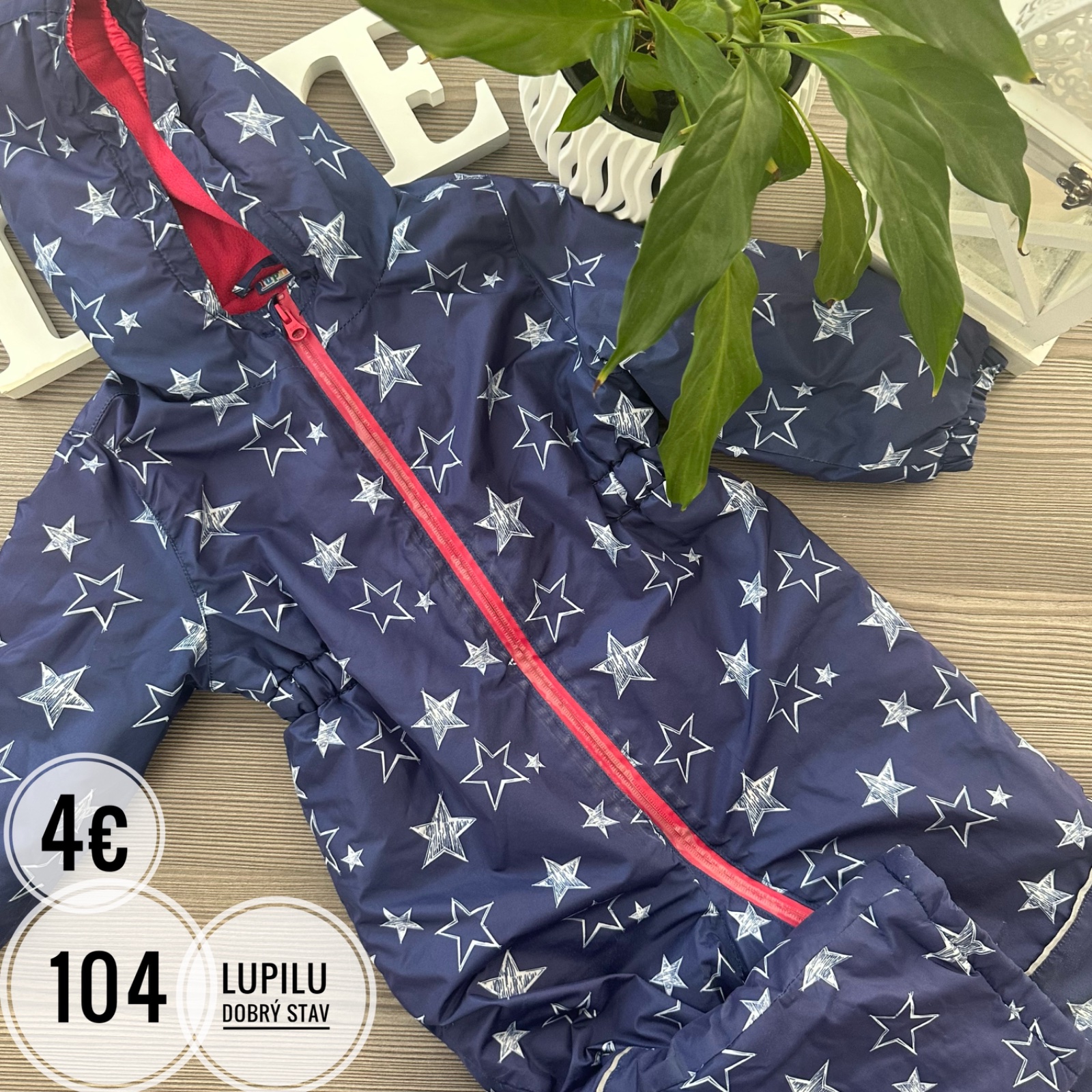 nosený, zips ošúchaný, aj látka medzi kolienkami trochu ošúchaná (viď obe chybičky na foto), vo vnútri došitý sťahovací pás (dá sa vybrať), iné poškodenia nemá, veľkosť 104, celková dĺžka 88cm, rukáv od krku 41cm, dĺžka od rozkroku dole 35cm