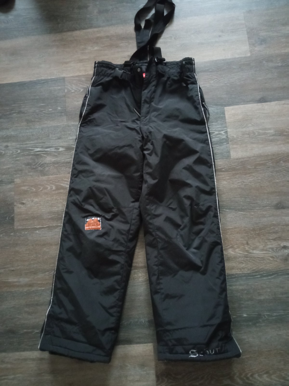 Predám oteplovačky na traky, vpredu zips a do gumy, dole zábrana proti snehu a suché zipsy. Na kolene už bola dierka, preto záplata po boku vrecká. Pás 34-39 CM, d 94 CM, traky posuvatelne. Syn nosil aj keď mal 158 CM v pohode