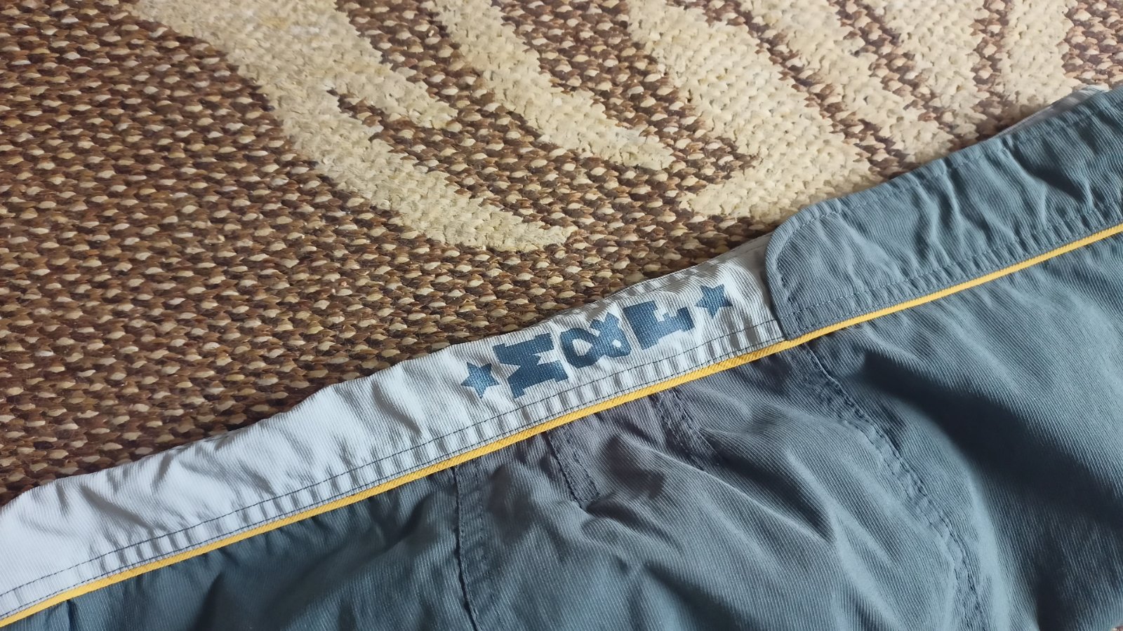 Na kolene šmuha a dierka pod kolenom - viď foto. Traky sú trochu vyťahané ale ešte pružia.