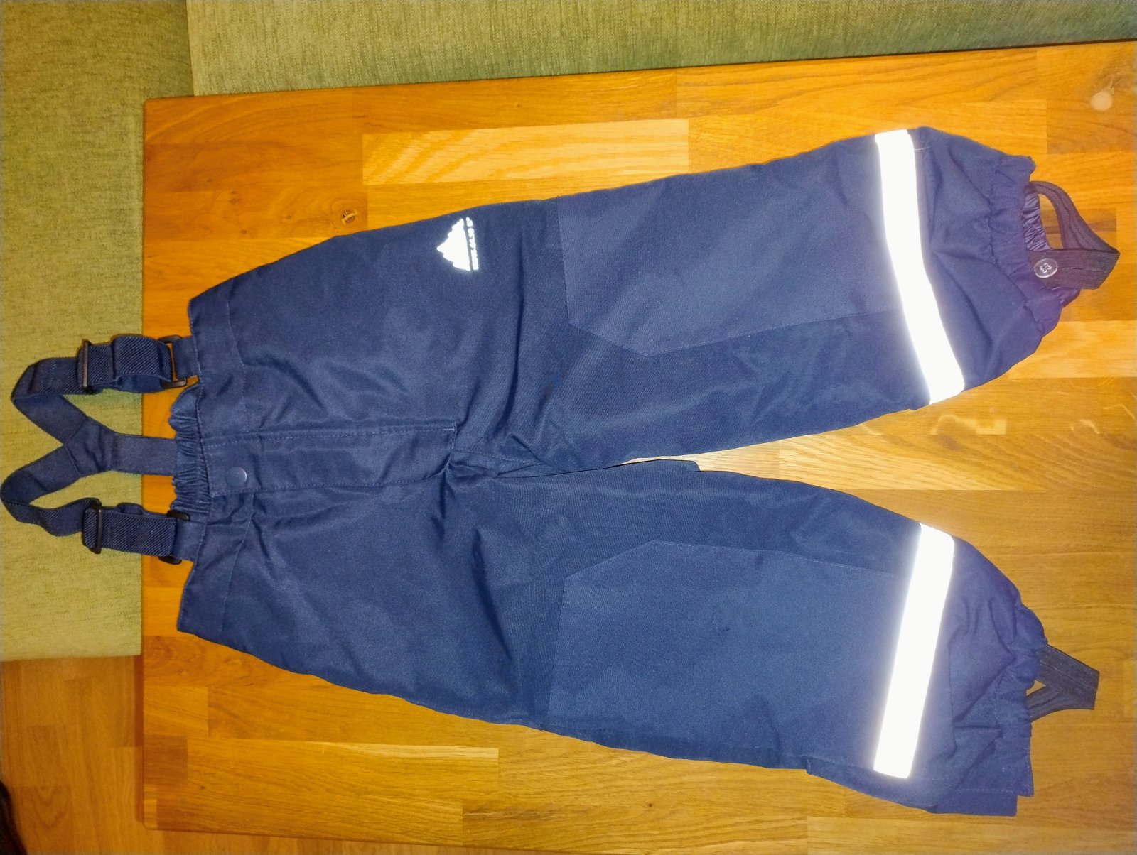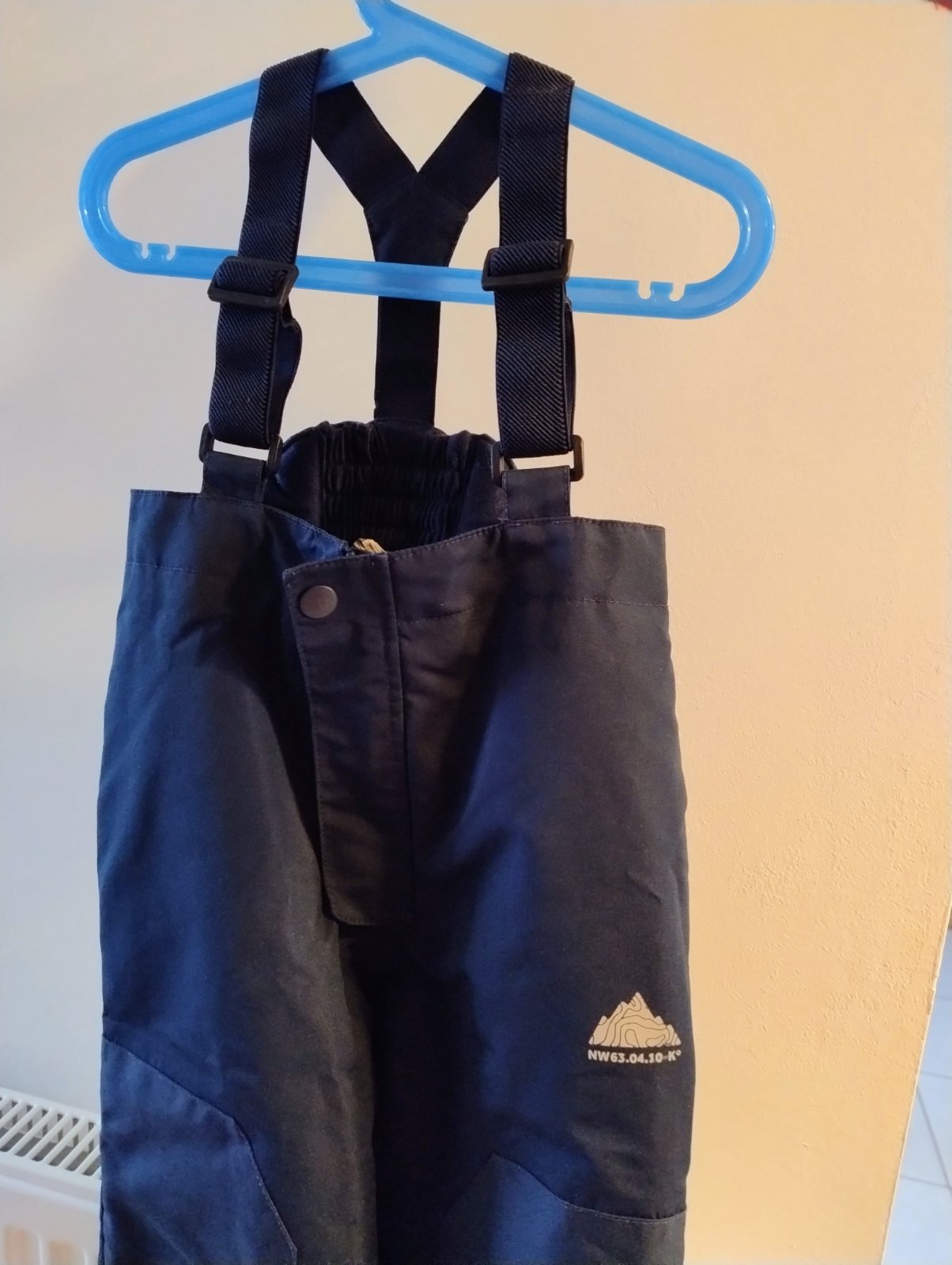 Nohavice sú ako oteplovačky. Sú nepremokavé, majú vyvýšený pás, ktorý sa dá regulovať, majú gumičky v spodnej časti nohavíc. Veľkost 103-112.
