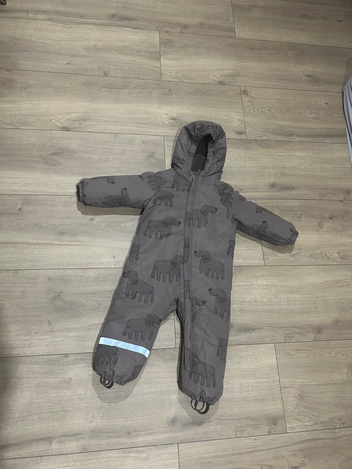 Teplý overal, kombinéza. Veľká kapucňa Stojačik Zapínanie na zips Dlhé rukávy s prúžkovanými manžetami Bočné zapínanie na zips Hladká podšívka Reflexné detaily Nepremokavá látka Veľkosť sivý 98, mo...