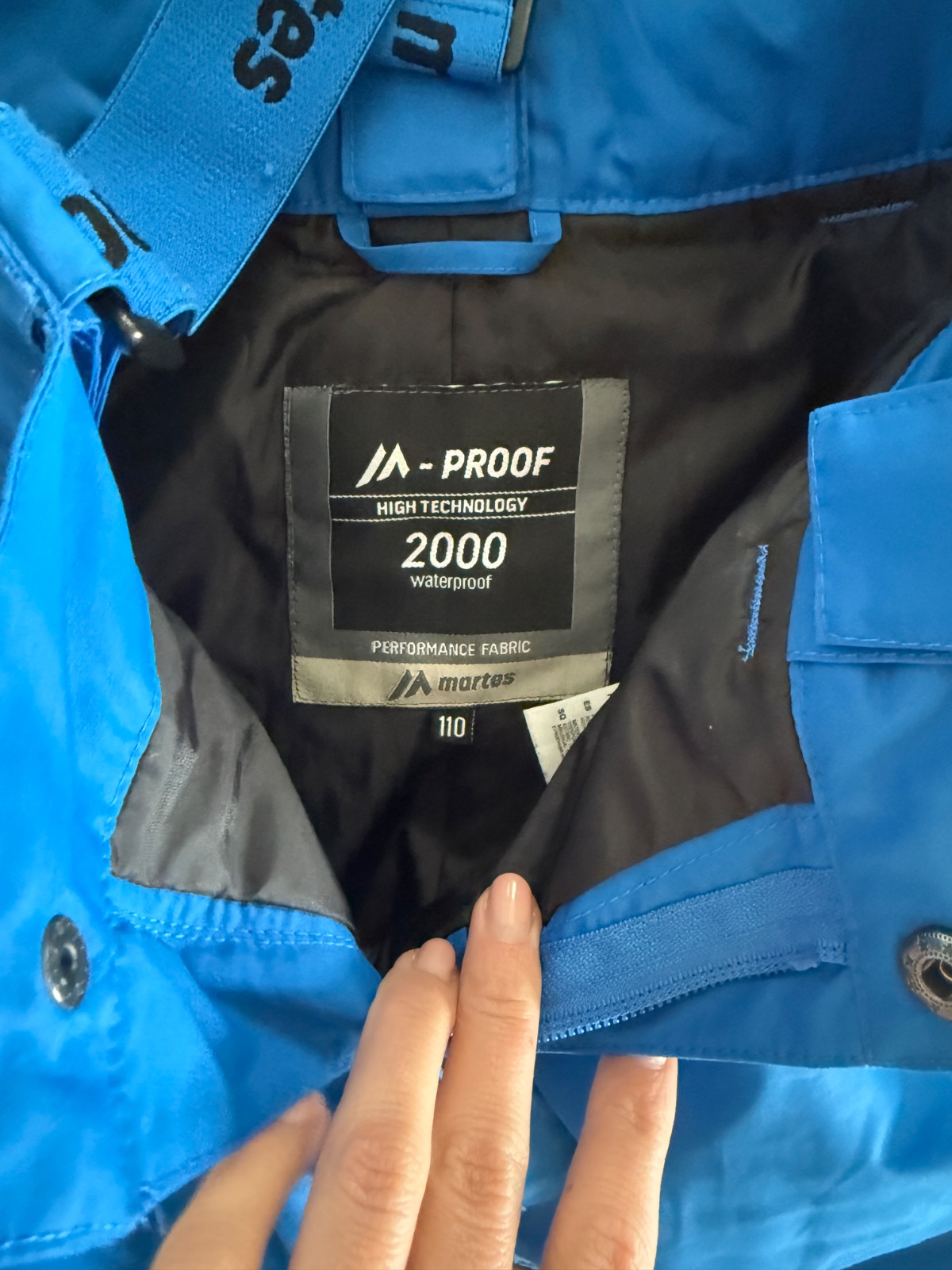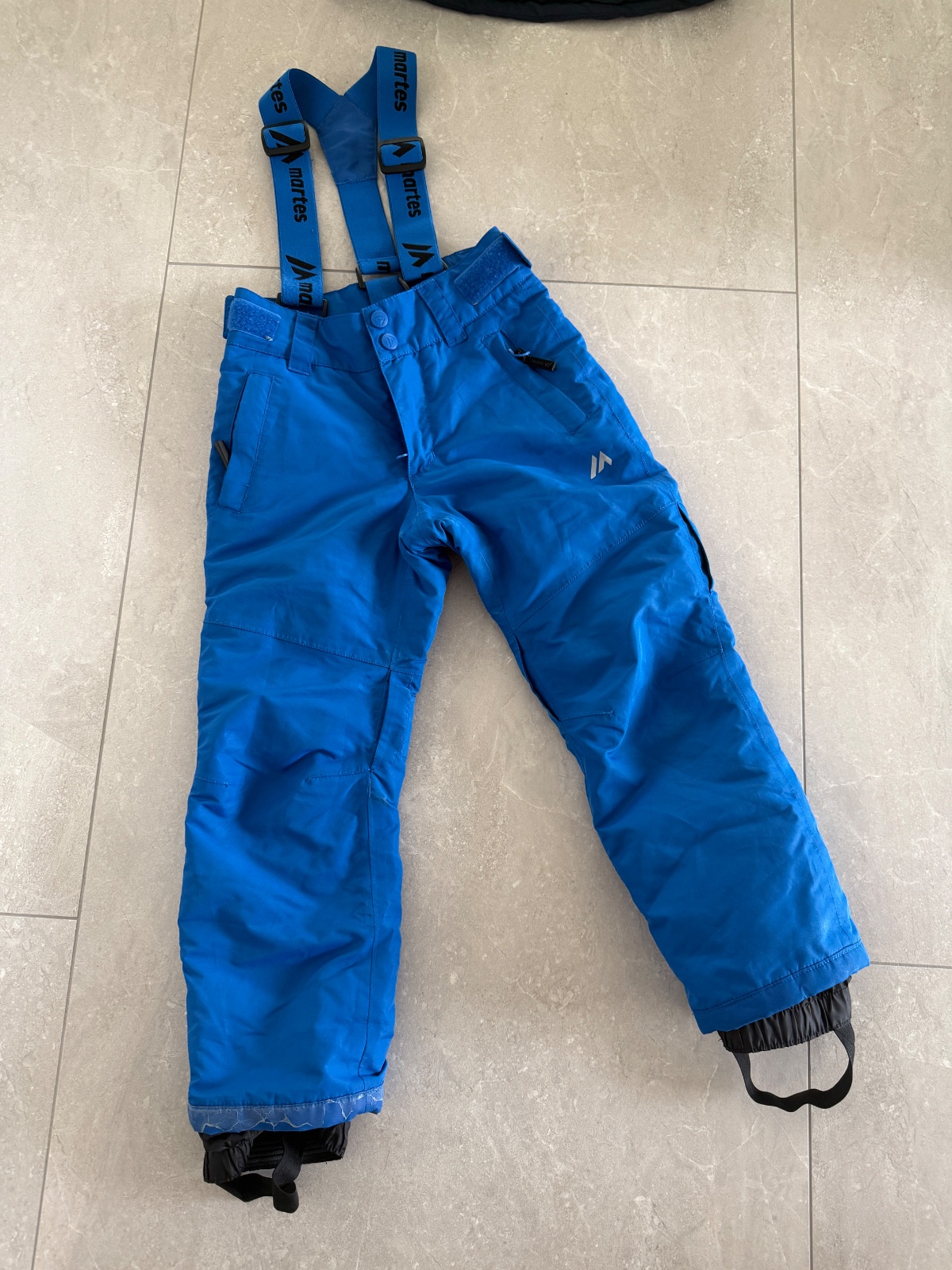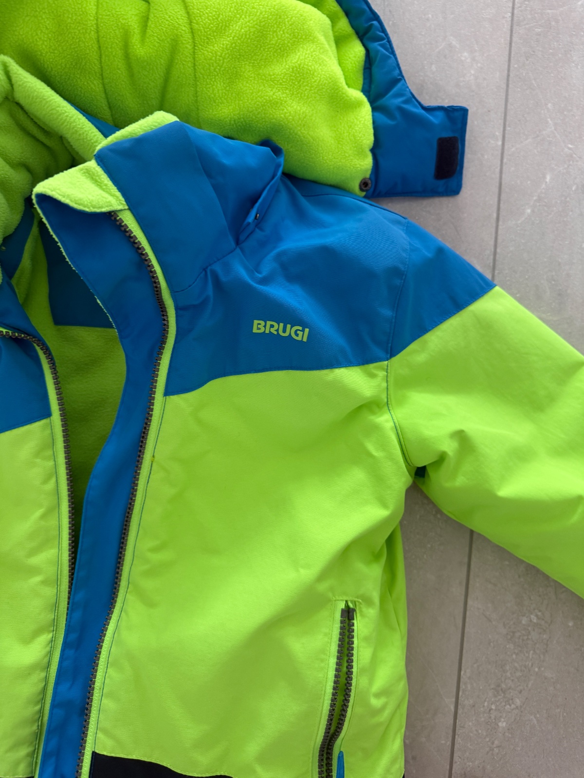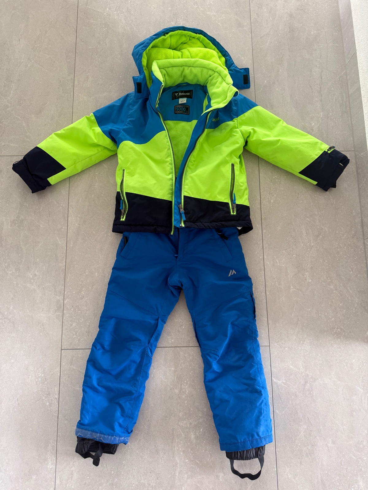 Nohavice vel. 110, dĺžka 69cm, zn. Kartel. Bunda vel. 116, zn. Brugi, dĺžka 48cm, dĺžka rukáva 49cm. Syn nosil súpravu spolu, velkostne mu sedela, nosena jednu sezónu.