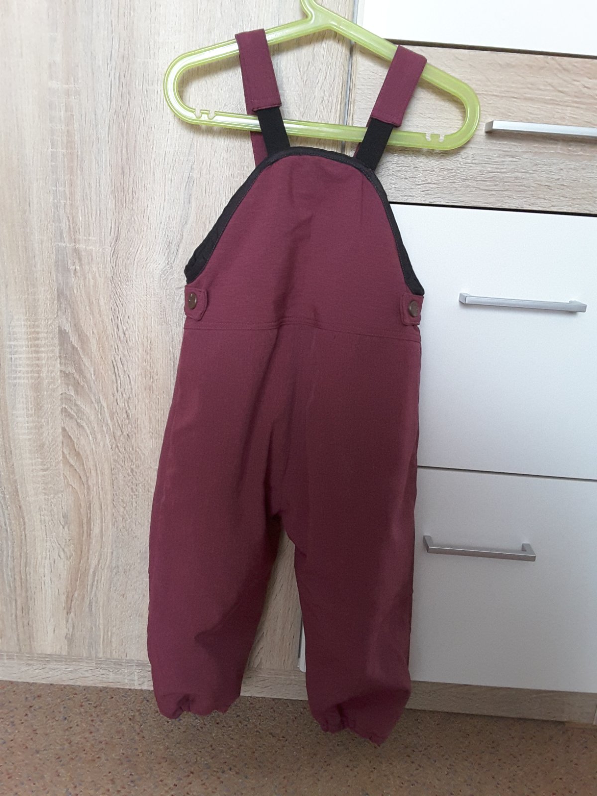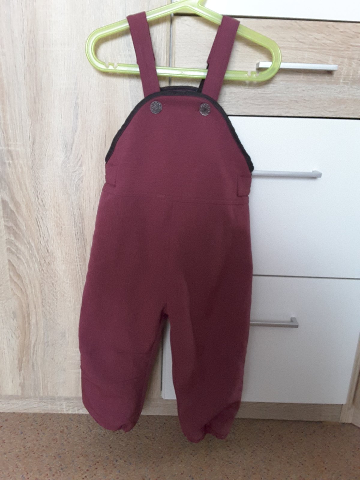 Rucna vyroba, zateplene nepremokave nohavice na traky. Pevny softshell, vnutri sedy fleece, zapinanie na gombiky. Na spodu gumicky. Dlzka celkom s trakmi 83, sirka v pase 34. Nenosene, bez poskodeni.